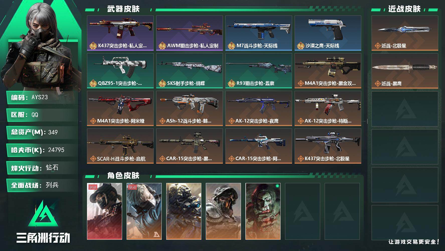 [13855154]【店主推荐捡漏号!可直接换绑】24795k哈伏币-304m流动资产-60烽火等级-钻石-20战场等级-列兵 【干员外观】:露娜-黑·天际线,蜂医-送葬人·无题密令,无名-夜鹰,深蓝-不破誓约,红狼-电锯惊魂 【近战皮肤】:近战-北极星,近战-黑鹰 【典藏外观】:K437突击步枪-私人定制,AWM狙击步枪-私人定制,M7战斗步枪-天际线,沙漠之鹰-天际线,QBZ95-1突击步枪-水墨迷彩,SKS射手步枪-蝴蝶,R93狙击步枪-监察 【传说级普通外观】:M4A1突击步枪-蚀金玫瑰,M4A1突击步枪-阿米娅,ASh-12战斗步枪-鹅鸭杀,AK-12突击步枪-夜鹰,AK-12突击步枪-特斯拉线圈,SCAR-H战斗步枪-启航,CAR-15突击步枪-黑鹰坠落,CAR-15突击步枪-阿米娅,K437突击步枪-北极星,KC17突击步枪-电锯惊魂,UZI冲锋枪-特斯拉线圈,SMG-45冲锋枪-骑士,SR-3M紧凑突击步枪-特斯拉线圈,勇士冲锋枪-能天使-午夜邮差,QCQ171冲锋枪-北极星,QCQ171冲锋枪-鹅鸭杀,725双管霰弹枪-送葬人-无题密令,M250通用机枪-骑士之心,QJB201轻机枪-鹅鸭杀,复合弓-黑·天际线 【史诗级普通外观】:AKM突击步枪-林中猎手,QBZ95-1突击步枪-曙光,ASh-12战斗步枪-守夜人,ASh-12战斗步枪-无极限,M16A4突击步枪-竞赛选手,AUG突击步枪-蝮蛇,SG552突击步枪-尖端治疗,SCAR-H战斗步枪-囚徒,AS Val突击步枪-尖端治疗,AS Val突击步枪-典狱官,腾龙突击步枪-无垢,腾龙突击步枪-猎鳄行动,K437突击步枪-守护者,MP5冲锋枪-深海恐惧,MP5冲锋枪-战术竞备,MP5冲锋枪-竞技风,Vector冲锋枪-阿萨拉文明,Vector冲锋枪-猎鳄行动,SR-3M紧凑突击步枪-荒野求生,SR-3M紧凑突击步枪-战术竞备,勇士冲锋枪-深海恐惧,勇士冲锋枪-工业狂潮,MP7冲锋枪-无垢,MP7冲锋枪-守护者,M1014霰弹枪-林中猎手,S12K霰弹枪-曙光,PKM通用机枪-蝮蛇,PKM通用机枪-守夜人,PKM通用机枪-荒野求生,M250通用机枪-囚徒,Mini-14射手步枪-守护者,SVD狙击步枪-暗夜猎手,SVD狙击步枪-荒野求生,M14射手步枪-禁卫,SR-25射手步枪-尖端治疗,PSG-1射手步枪-无垢,