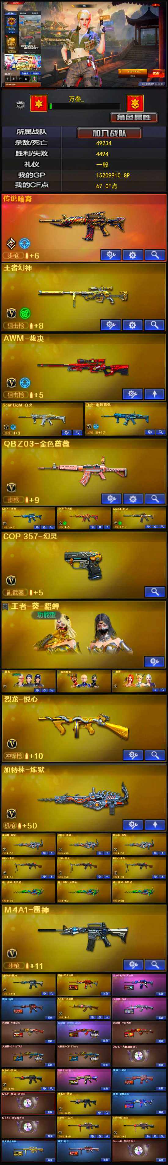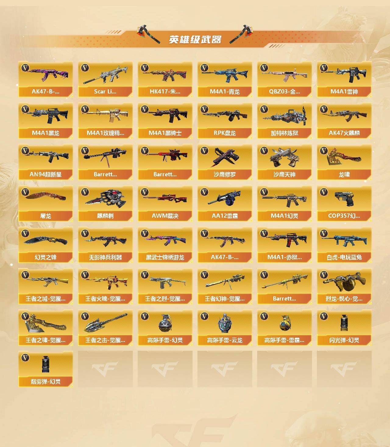 【英雄级武器】:AK47-火麒麟,M4A1-黑龙,M4A1-雷神*2,M4A1-黑骑士,AN94-超新星*2,M4A1-青龙,HK417-朱雀,Scar Light-白虎,M4A1-幻灵,无影-神兵利器,黑武士-锦绣游龙,M4A1-玫瑰精灵,QBZ03-金色蔷薇,AK47-B-战神,王者之城-觉醒版,王者火魄-觉醒版,AK47-B-常胜将军,王者之烈-觉醒版,白虎-电玩蓝兔,Barrett-毁灭*2,Barrett-极光,AWM-裁决,王者幻神-觉醒版,Barrett-雷霆王者-觉醒版,RPK-盘龙*3,加特林-炼狱*4,烈龙-悦心-觉醒版,AA-12-雷