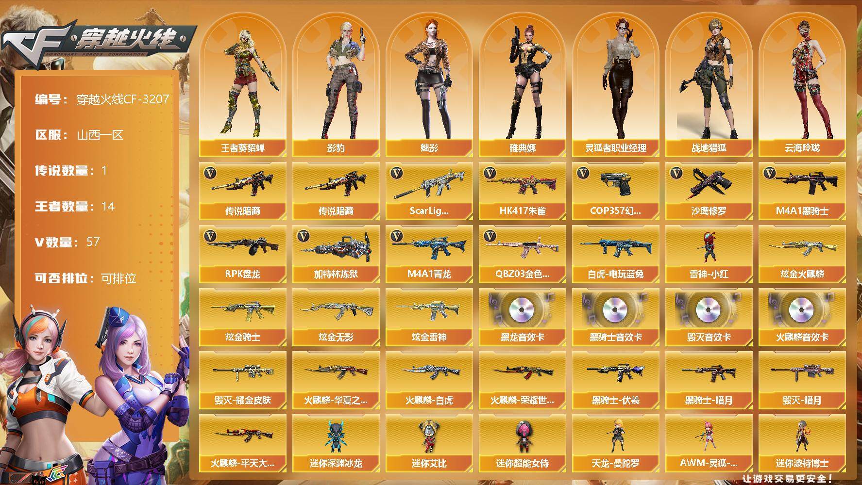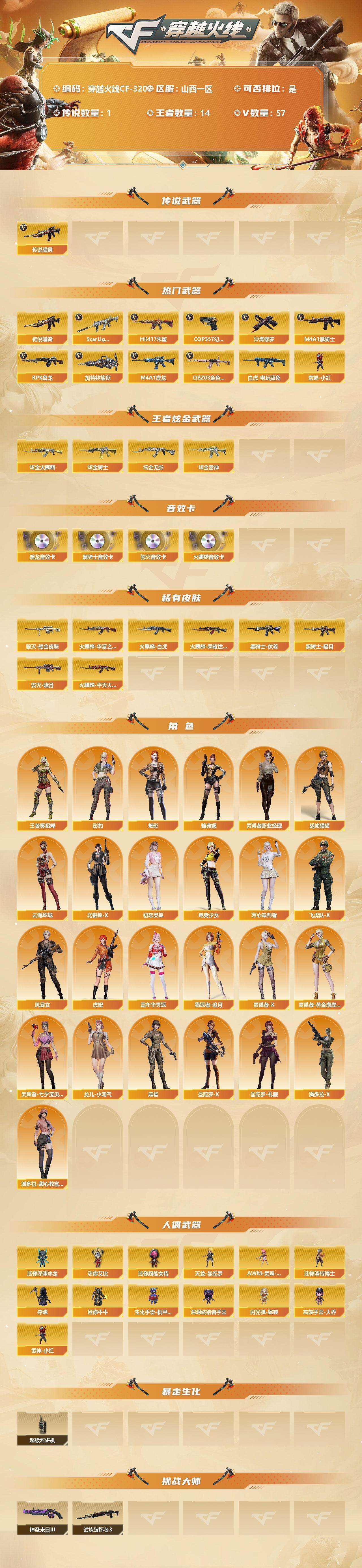 [13399557]山西一区-57V-14王者-4炫金 【传说武器】:传说暗裔 【热门武器】:传说暗裔,QBZ03-金色蔷薇,Scar Light-白虎,HK417-朱雀,M4A1-青龙,白虎-电玩蓝兔,M4A1-黑骑士,RPK-盘龙*3,加特林-炼狱*4,雷神-小红,COP 357-幻灵,沙鹰-修罗*3 【王者炫金武器】:炫金火麒麟,炫金骑士,炫金无影,炫金雷神 【音效卡】:AK47-火麒麟音效卡,M4A1-黑龙音效卡,M4A1-黑骑士音效卡,Barrett-毁灭音效卡 【皮肤】:雷神-暗月,雷神-烈虎皮肤,雷神-机甲刑天皮肤,火麒麟-华夏之心,火麒麟-平天大圣,火麒麟-白虎,火麒麟-荣耀世冠AG,毁灭-暗月,毁灭耀金皮肤,M4A1-千变-孔明皮肤,黑龙-能量核心,黑骑士-暗月,黑骑士-伏羲,战神-粉色甜心皮肤,战神-流金岁月皮肤,AK47-B-常胜将军-曹操,AK47-B-常胜将军-刘备*2,AK47-B-常胜将军-孙权*2,极光-能量核心 【角色】:魅影,影豹,战地猎狐,王者-葵-貂蝉,云海玲珑,北极狐-X,初恋灵狐,电竞少女,芳心审判者,飞虎队-X,风暴女*2,虎妞,嘉年华灵狐,猎狐者-追月,灵狐者-X,灵狐者-黄金海岸,灵狐者-七夕宝贝,灵狐者-职业经理,龙儿-小淘气,麻雀,曼陀罗-X,曼陀罗-礼服,潘多拉-X,潘多拉-甜心教官,雅典娜 【人偶武器】:雷神-小红,天龙-曼陀罗,AWM-灵狐-15周年嘉年华*2,迷你艾比,迷你超能女侍,迷你深渊冰龙,迷你波特博士,夺魂,迷你牛牛,生化手雷-机甲核心,深渊终结者手雷,闪光弹-貂蝉,高爆手雷-大乔 【暴走生化】:超级对讲机 【挑战大师】:试炼破坏者III,神圣爆裂者-末日III 【英雄级武器】:AK47-火麒麟,M4A1-黑龙,M4A1-雷神*2,M4A1-黑骑士,AN94-超新星*2,M4A1-青龙,HK417-朱雀,Scar Light-白虎,M4A1-幻灵,无影-神兵利器,黑武士-锦绣游龙,M4A1-玫瑰精灵,QBZ03-金色蔷薇,AK47-B-战神,王者之城-觉醒版,王者火魄-觉醒版,AK47-B-常胜将军,王者之烈-觉醒版,白虎-电玩蓝兔,Barrett-毁灭*2,Barrett-极光,AWM-裁决,王者幻神-觉醒版,Barrett-雷霆王者-觉醒版,RPK-盘龙*3,加特林-炼狱*4,烈龙-悦心-觉醒版,AA-12-雷