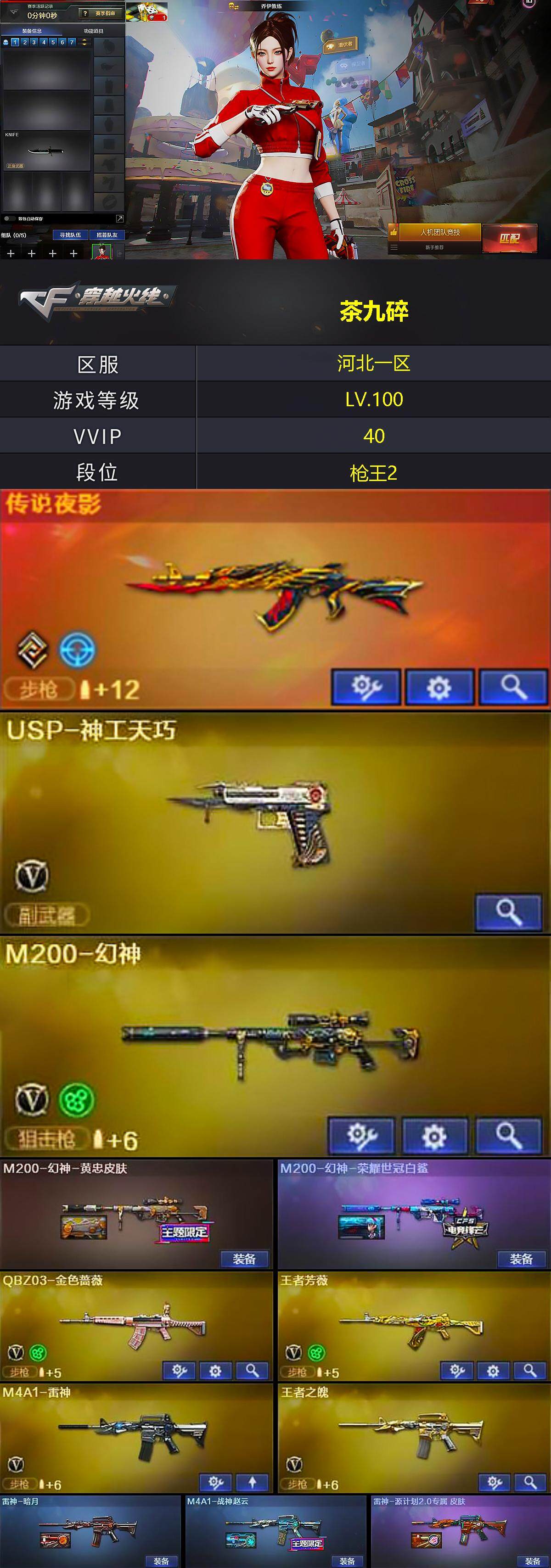 [13787426]河北一区-38V-2王者-0炫金 【传说武器】:传说夜影 【热门武器】:传说夜影,QBZ03-金色蔷薇,M200-幻神,M4A1-黑骑士,沙鹰-修罗,金刚伞 【音效卡】:M4A1-黑骑士音效卡 【皮肤】:M200-幻神-黄忠皮肤,M200-幻神-荣耀世冠白鲨,雷神-暗月,M4A1-战神赵云,雷神-源计划2.0专属 皮肤,火麒麟-大唐荣光,火麒麟-心动糖果,毁灭-冠军之怒,M4A1-千变-孔明皮肤,战神-紫绶金章皮肤,战神-流金岁月皮肤,轻型军用手斧-再燃火线 【角色】:乔伊教练,风暴女,嘉年华灵狐,娟娟,葵-赛博朋克,零-热舞青春,灵狐者-黄金海岸,灵狐者-七夕宝贝,潘多拉-X,斯沃特-X,新娜塔莎 【人偶武器】:AWM-灵狐-15周年嘉年华*2 【暴走生化】:超级对讲机 【挑战大师】:冰龙粉碎者-白马银枪,神圣爆裂者-末日III 【英雄级武器】:AK47-火麒麟,M4A1-雷神,M4A1-黑骑士,M4A1-神工天巧,无影-神兵利器,QBZ03-金色蔷薇,王者之魄-觉醒版,AK-47-猩红传说*5,AK47-B-战神,王者芳薇-觉醒版,Barrett-毁灭,M200-幻神,沙鹰-修罗,沙鹰-天神*2,USP-神工天巧,屠龙,擎天,唐刀-神工天巧,麒麟刺-百战金芒,高爆手雷-神工天巧*3,闪光弹-竞技荣光,闪光弹-神工天巧*6,烟雾弹-神工天巧*4 【道具】:CFS限定背包,炫彩背包,超级背包,女皇终结者-魔龙之吻,救世主-黑桃战神,绿色巨人,灵魂忍者,迷雾幽灵,夺命之镰,防化服*2,金色流光-枪王排位*2,星辰流光-枪王排位,枪王排位28赛季金色流光,枪王排位29赛季金色流光,语音特效-机器人*2,斯沃特表情,EP战队名片,防弹头盔*5,防弹衣*5,C4工具钳*4,手雷包*5 【特殊枪械】:1黑骑士