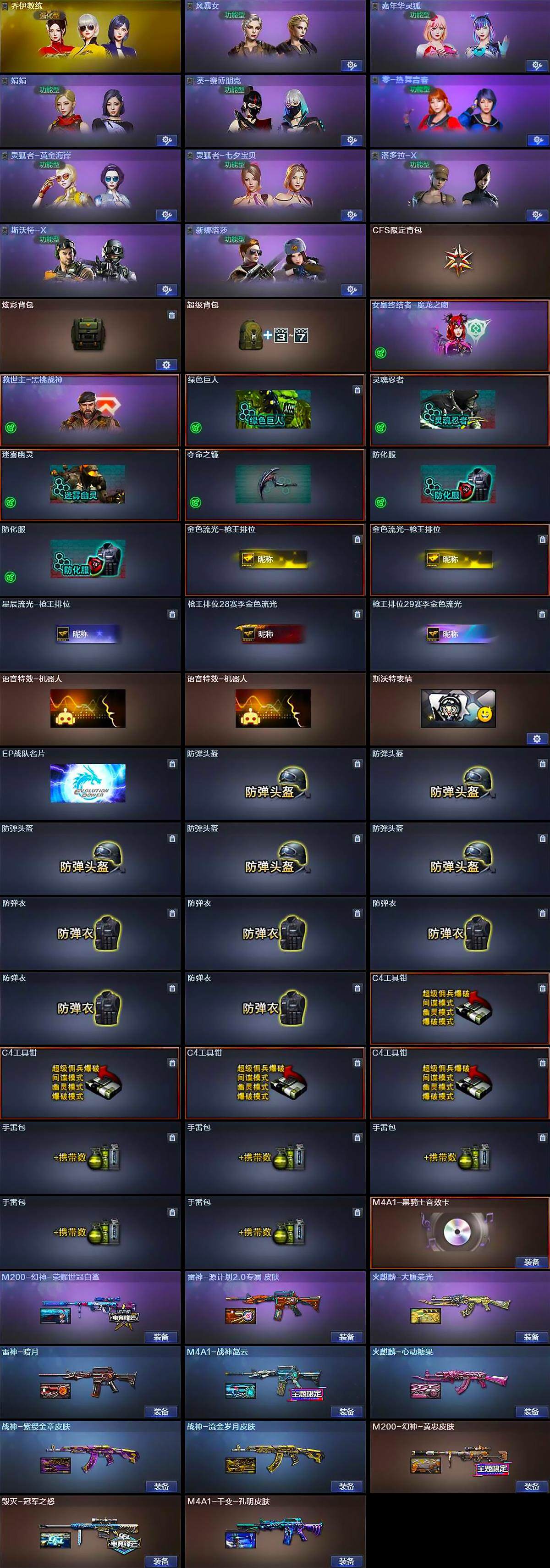 【道具】:CFS限定背包,炫彩背包,超级背包,女皇终结者-魔龙之吻,救世主-黑桃战神,绿色巨人,灵魂忍者,迷雾幽灵,夺命之镰,防化服*2,金色流光-枪王排位*2,星辰流光-枪王排位,枪王排位28赛季金色流光,枪王排位29赛季金色流光,语音特效-机器人*2,斯沃特表情,EP战队名片,防弹头盔*5,防弹衣*5,C4工具钳*4,手雷包*5