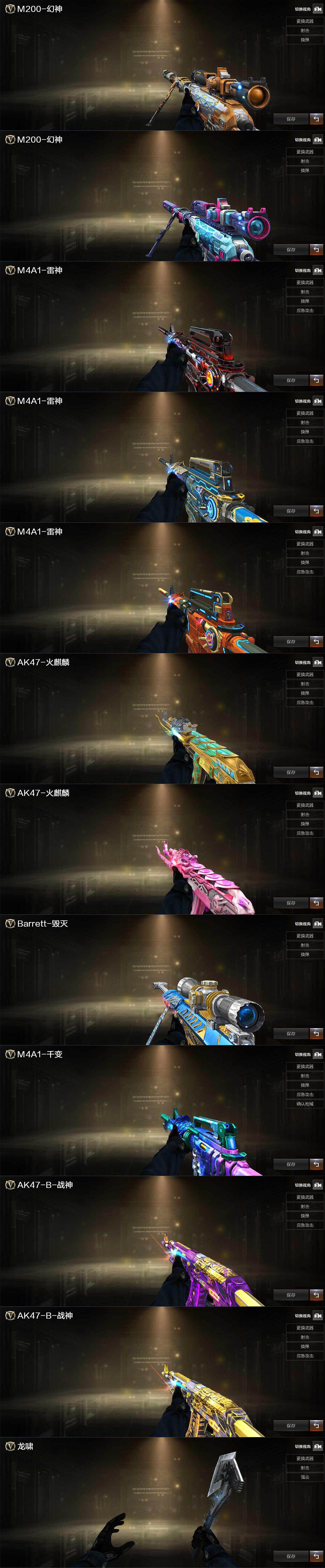 【皮肤】:M200-幻神-黄忠皮肤,M200-幻神-荣耀世冠白鲨,雷神-暗月,M4A1-战神赵云,雷神-源计划2.0专属 皮肤,火麒麟-大唐荣光,火麒麟-心动糖果,毁灭-冠军之怒,M4A1-千变-孔明皮肤,战神-紫绶金章皮肤,战神-流金岁月皮肤,轻型军用手斧-再燃火线