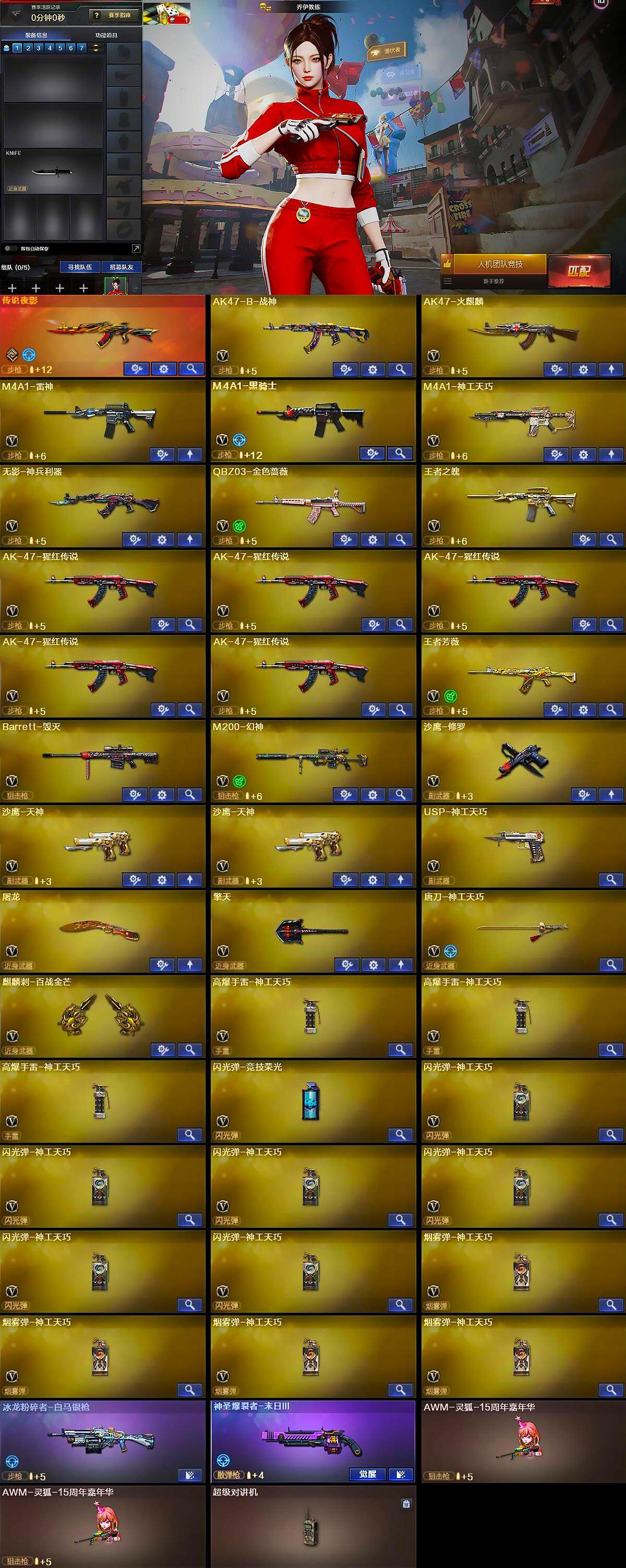 【英雄级武器】:AK47-火麒麟,M4A1-雷神,M4A1-黑骑士,M4A1-神工天巧,无影-神兵利器,QBZ03-金色蔷薇,王者之魄-觉醒版,AK-47-猩红传说*5,AK47-B-战神,王者芳薇-觉醒版,Barrett-毁灭,M200-幻神,沙鹰-修罗,沙鹰-天神*2,USP-神工天巧,屠龙,擎天,唐刀-神工天巧,麒麟刺-百战金芒,高爆手雷-神工天巧*3,闪光弹-竞技荣光,闪光弹-神工天巧*6,烟雾弹-神工天巧*4