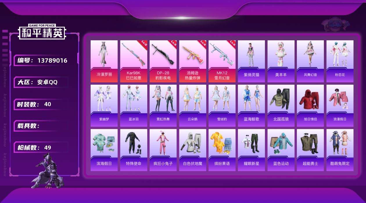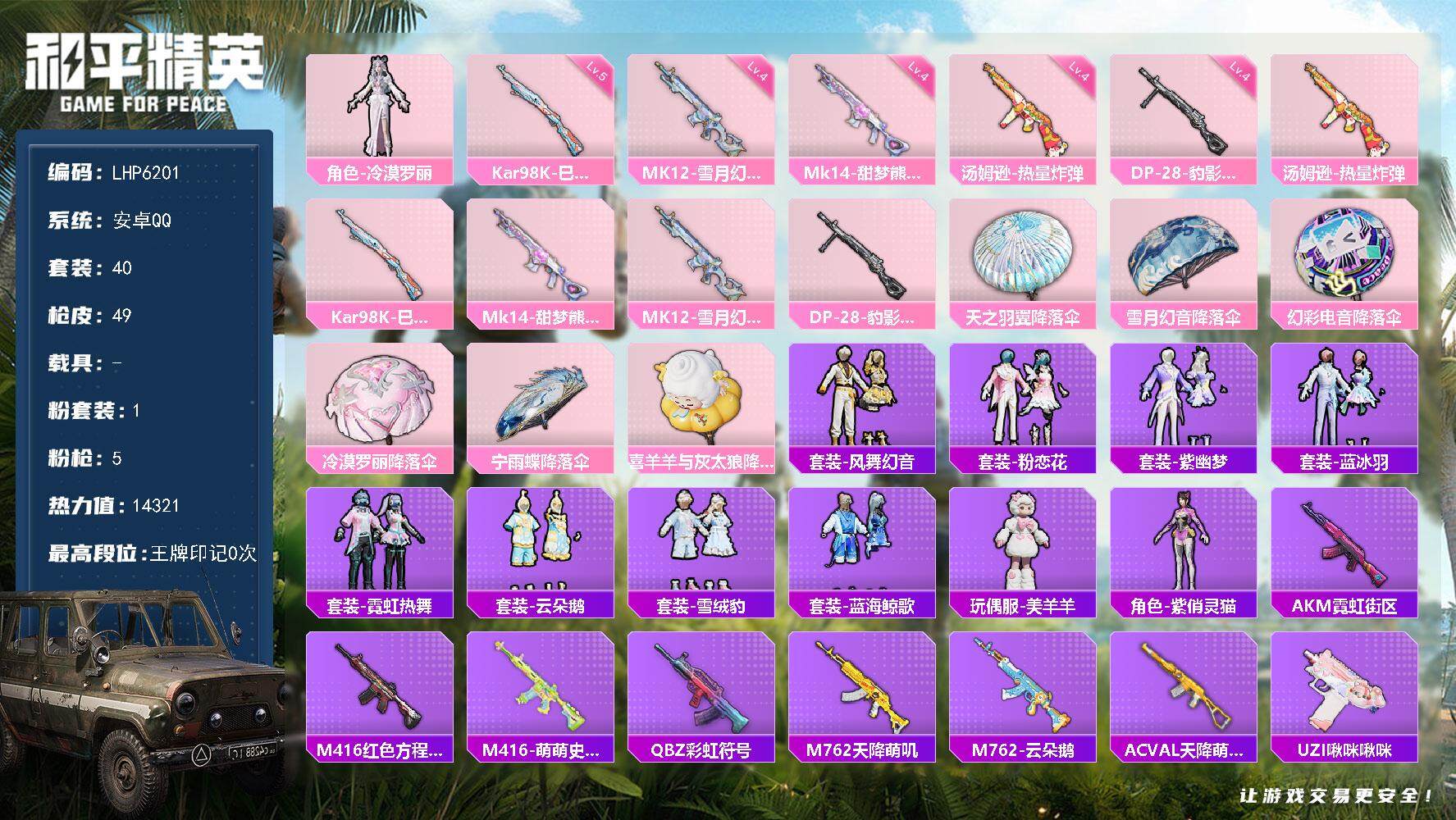 [13789016]【店主推荐捡漏号!可直接换绑】 安卓 手Q-1粉装-5特效枪-1.4w热力值-1王牌印记-40套装-49枪皮【粉色套装】:角色-冷漠罗丽【粉色枪皮等级】:汤姆逊-热量炸弹(四级),Kar98K-巳巳如意(五级),Mk14-甜梦熊击(四级),MK12-雪月幻音(四级),DP-28-豹影疾电(四级)