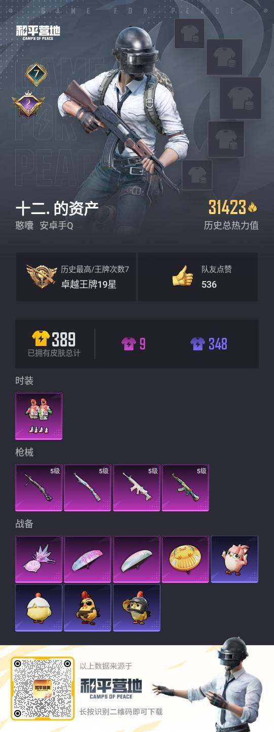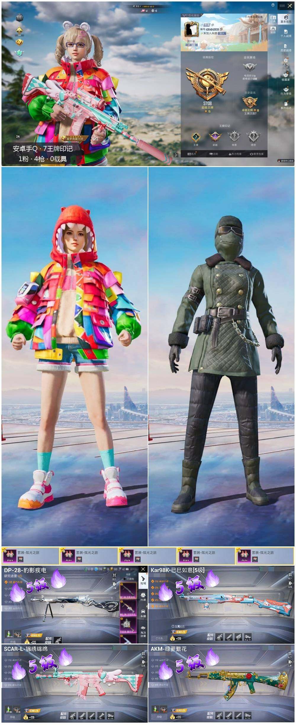- PX_2077905- 安卓手Q-22王牌印记-7粉装-5特效枪-1载具-94515热力值-225套装-307枪皮-1卓越印记-0传奇印记 【7粉装】,梦幻火箭,第五大道,极致幻想,深渊皇后,PEL轰鸣竞梦者,冰霜白皇,创世·救赎 【5特效枪】AKM-绿萝繁花-5级 SCAR-L-童趣迷兔-7级 SCAR-L-锦绣绵绵-5级 M416-电玩时刻-5级 Kar98K-巳巳如意-5级 【7稀有紫装】