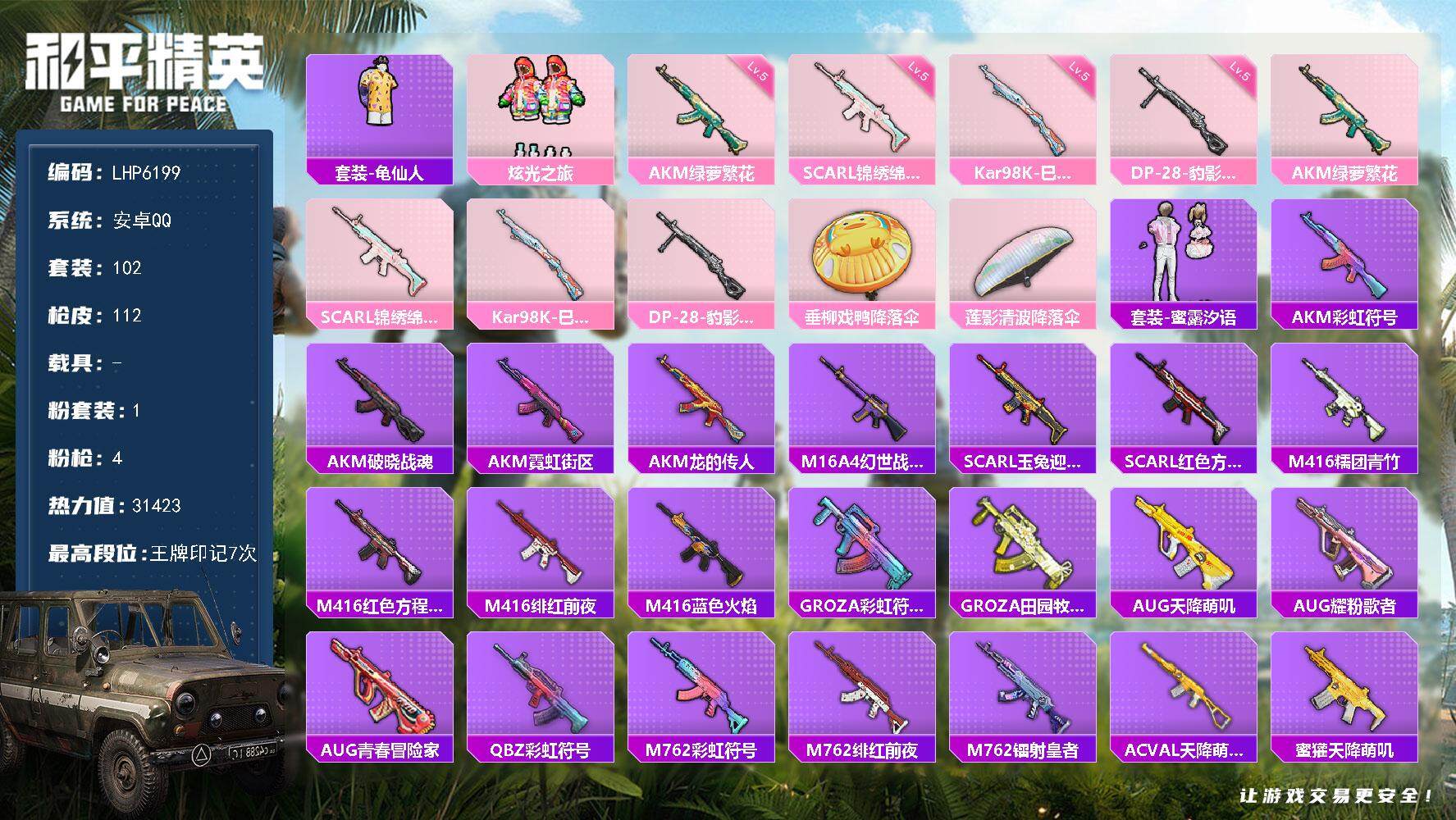 [13789026]【店主推荐捡漏号!可直接换绑】 安卓 手Q-1粉装-4特效枪-1粉色飞行器-3.1w热力值-7王牌印记-102套装-112枪皮【热门品类】:套装-龟仙人【粉色套装】:粉装-炫光之旅【粉色枪皮等级】:AKM-绿萝繁花(五级),SCAR-L-锦绣绵绵(五级),Kar98K-巳巳如意(五级),DP-28-豹影疾电(五级)