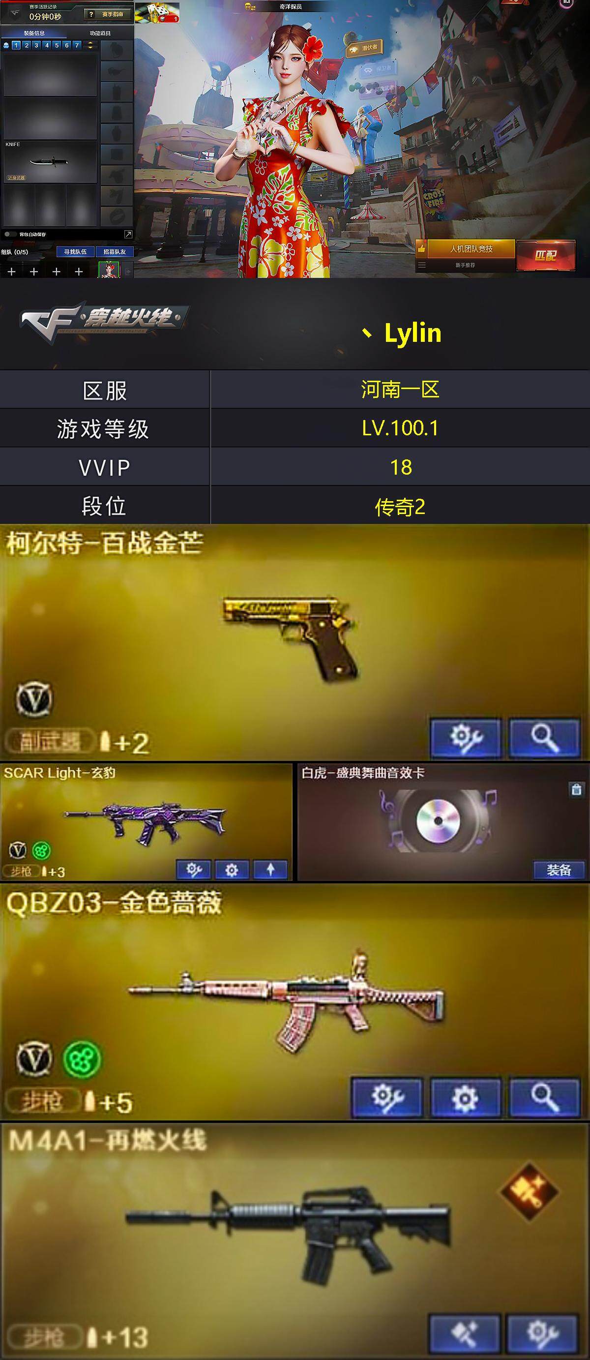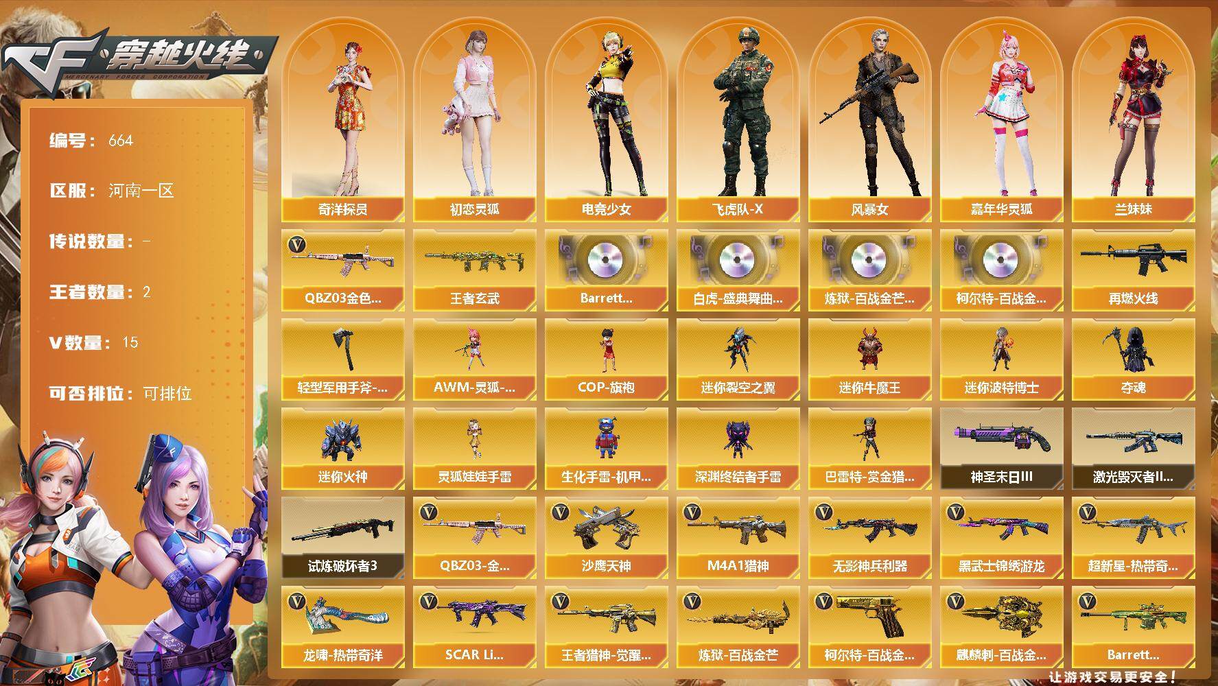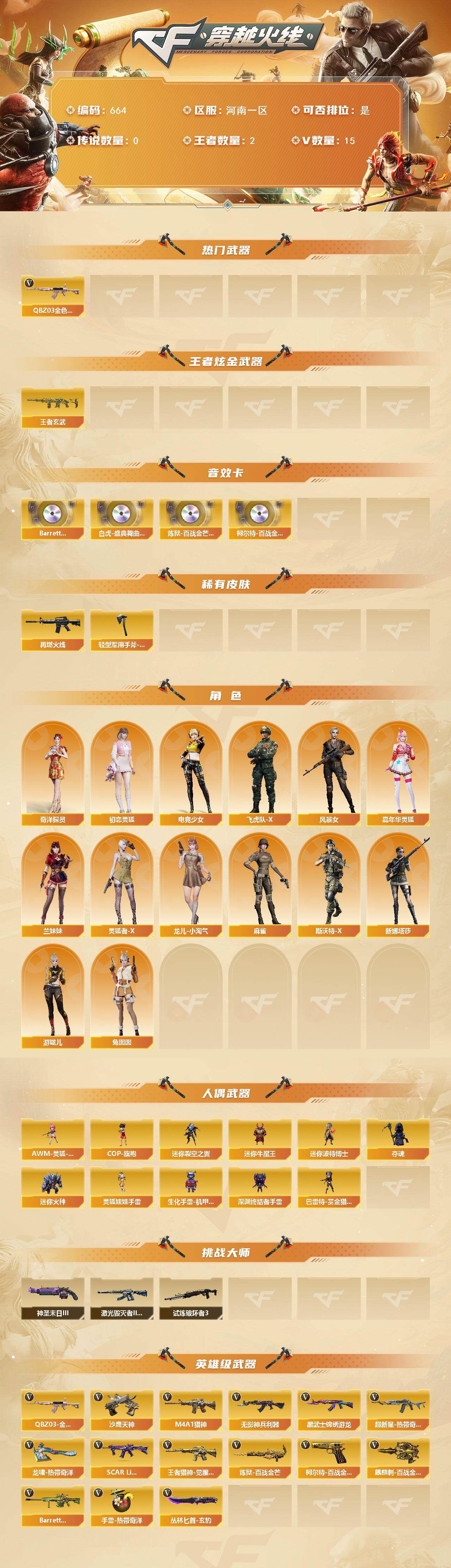 [13709058]河南一区-15V-2王者-0炫金 【热门武器】:QBZ03-金色蔷薇 【王者炫金武器】:王者玄武 【音效卡】:Barrett-碧霄极光音效卡,白虎-盛典舞曲音效卡,炼狱-百战金芒-庆典舞曲音效卡,柯尔特-百战金芒-庆典舞曲音效卡 【皮肤】:M4A1-再燃火线,轻型军用手斧-再燃火线 【角色】:奇洋探员,初恋灵狐,电竞少女,飞虎队-X,风暴女,嘉年华灵狐,兰妹妹,灵狐者-X,龙儿-小淘气,麻雀,斯沃特-X,兔囡囡,新娜塔莎,游珑儿 【人偶武器】:AWM-灵狐-15周年嘉年华*2,COP-旗袍,迷你裂空之翼*2,迷你牛魔王,迷你波特博士*3,夺魂*2,迷你火种*2,生化手雷-机甲核心*2,深渊终结者手雷,巴雷特-赏金猎人,灵狐娃娃手雷 【挑战大师】:激光毁灭者III-白马银枪,试炼破坏者III,神圣爆裂者-末日III 【英雄级武器】:无影-神兵利器,黑武士-锦绣游龙,超新星-热带奇洋,SCAR Light-玄豹,QBZ03-金色蔷薇,M4A1-猎神,王者猎神-觉醒版,炼狱-百战金芒,沙鹰-天神,柯尔特-百战金芒,龙啸-热带奇洋,麒麟刺-百战金芒,丛林匕首-玄豹,手雷-热带奇洋,Barrett-碧霄极光 【道具】:BS战队炫彩背包,云山科技背包,全能枪王背包,奇洋探员-海龟背包,热带奇洋炫彩背包,百战金芒炫彩背包,裂空之翼背包-金色,超级背包,圣拳猎手-炽雪,女皇终结者-魔龙之吻,救世主-黑桃战神,绿色巨人,灵魂忍者*2,变异宝贝,妖姬,迷雾幽灵*2,生化弹匣,夺命之镰,防化服*3,金色流光-枪王排位*2,星辰流光-枪王排位,枪王排位28赛季金色流光,语音特效-盛典烟火,萌萌小葵表情,热带奇洋表情,防弹头盔*5,防弹衣*5,C4工具钳*5,手雷包*5 【特殊枪械】: