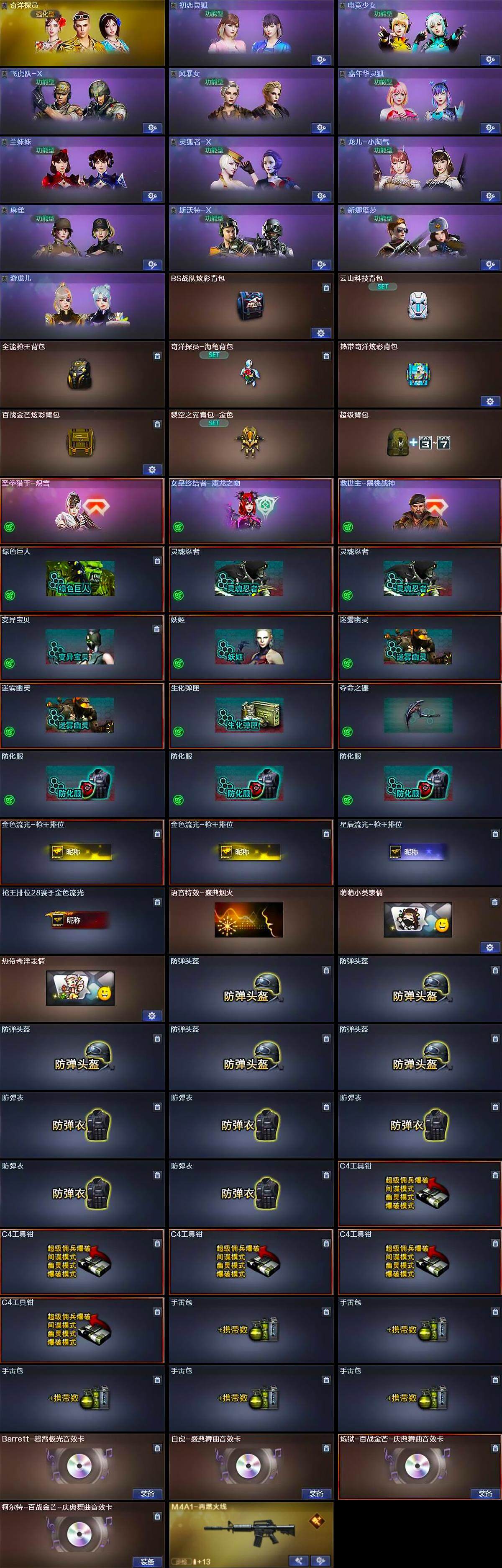 【道具】:BS战队炫彩背包,云山科技背包,全能枪王背包,奇洋探员-海龟背包,热带奇洋炫彩背包,百战金芒炫彩背包,裂空之翼背包-金色,超级背包,圣拳猎手-炽雪,女皇终结者-魔龙之吻,救世主-黑桃战神,绿色巨人,灵魂忍者*2,变异宝贝,妖姬,迷雾幽灵*2,生化弹匣,夺命之镰,防化服*3,金色流光-枪王排位*2,星辰流光-枪王排位,枪王排位28赛季金色流光,语音特效-盛典烟火,萌萌小葵表情,热带奇洋表情,防弹头盔*5,防弹衣*5,C4工具钳*5,手雷包*5