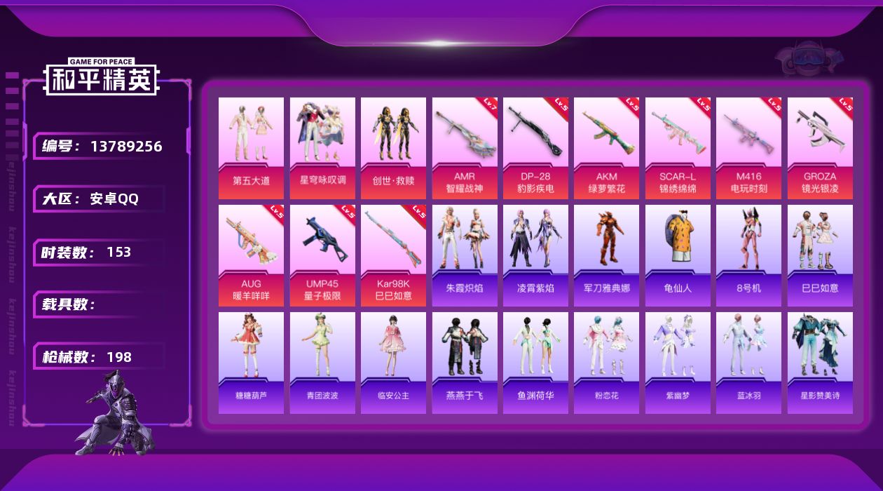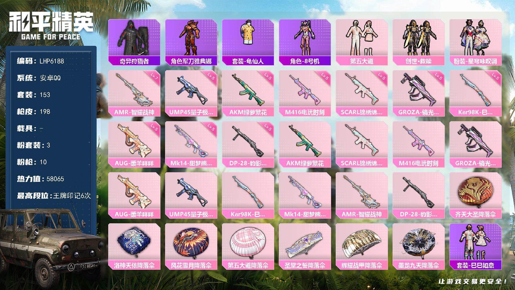 [13789256]【店主推荐捡漏号!可直接换绑】/地铁满天赋 安卓 手Q-3粉装-10特效枪-5.8w热力值-6王牌印记-153套装-198枪皮【热门品类】:套装-奇异狩猎者,角色-军刀雅典娜,套装-龟仙人,角色-8号机【粉色套装】:粉装-第五大道,套装-创世·救赎,粉装-星穹咏叹调【粉色枪皮等级】:AKM-绿萝繁花(五级),SCAR-L-锦绣绵绵(五级),M416-电玩时刻(五级),GROZA-镜光银凌(五级),AUG-暖羊咩咩(五级),UMP45-量子极限(五级),Kar98K-巳巳如意(五级),Mk14-甜梦熊击(五级),AMR-智耀战神(七级),DP-28-豹影疾电(五级)