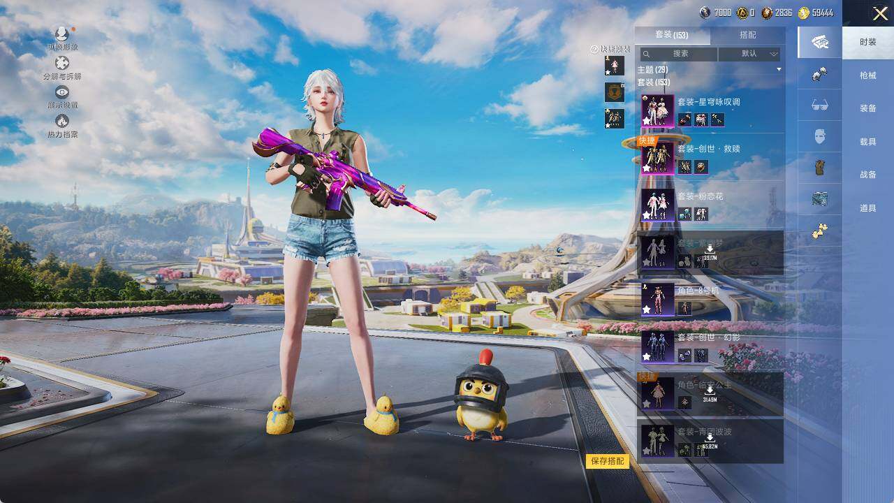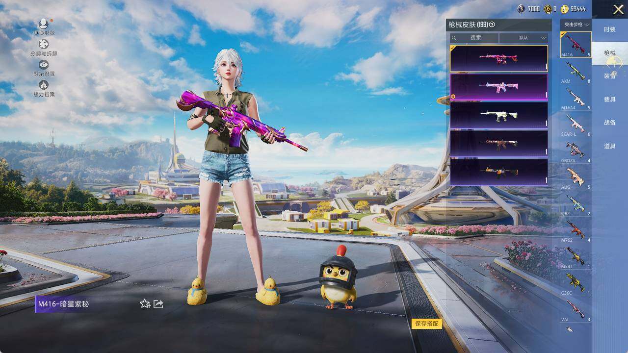 AKM-绿萝繁花,M416-电玩时刻,GROZA-镜光银凌,AUG-暖羊咩咩,UMP45-量子极限,Kar98K-巳巳如意