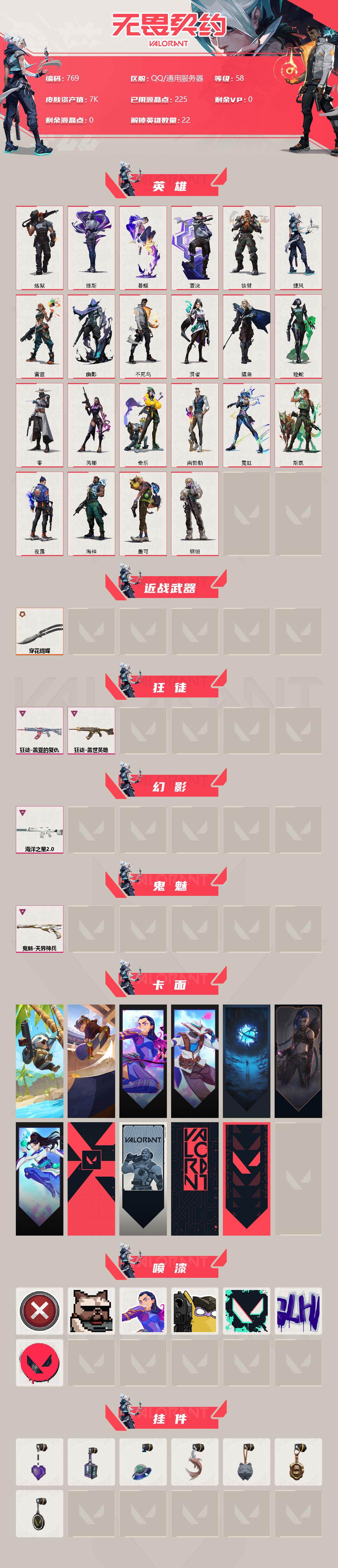 [13296522]【英雄】:炼狱,维斯,暮蝶,壹决,铁臂,捷风,雷兹,幽影,不死鸟,贤者,猎枭,蝰蛇,零,芮娜,奇乐,尚勃勒,霓虹,斯凯,夜露,海神,盖可,钢锁 【近战 武器】:近战武器-穿花蝴蝶 【狂徒】:狂徒-盖世英雄,狂徒-盖亚的复仇 【幻影】:幻影-海洋之星//2.0 【鬼魅】:鬼魅-天界神兵 【卡面】:树懒大作战 卡面,Clutch 卡面,无畏契约GO!第一卷:芮娜 卡面,无畏契约GO!第一卷:零 卡面,无垠星环 卡面,《双城之战》金克丝 卡面,无畏契约GO!第一卷:贤者 卡面,代号红色 卡面,新兵报到 卡面,V契约 卡面,无畏契约 卡面 【喷漆】:买装还是存钱 喷漆,关门放狗 喷漆,无畏契约GO!第一卷:芮娜 喷漆,放下武器 喷漆,胜利属于无畏契约 喷漆,GLHF 喷漆,无畏契约 喷漆 【挂饰】:薰衣草之心 挂饰,动力机箱 挂饰,天外飞客 挂饰,红鳞松叶 挂饰,《双城之战》魄罗 挂饰,海豹的认可 挂饰,无畏契约 纪念币 挂饰