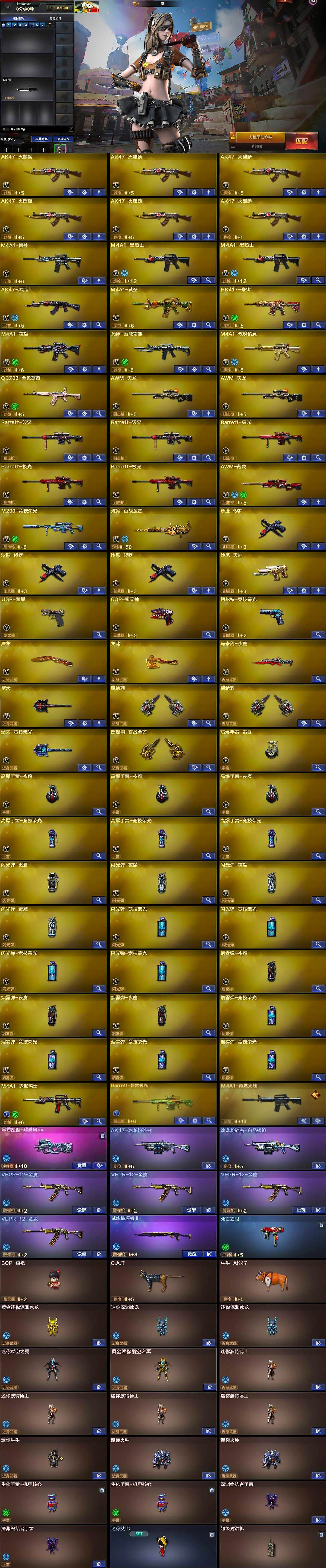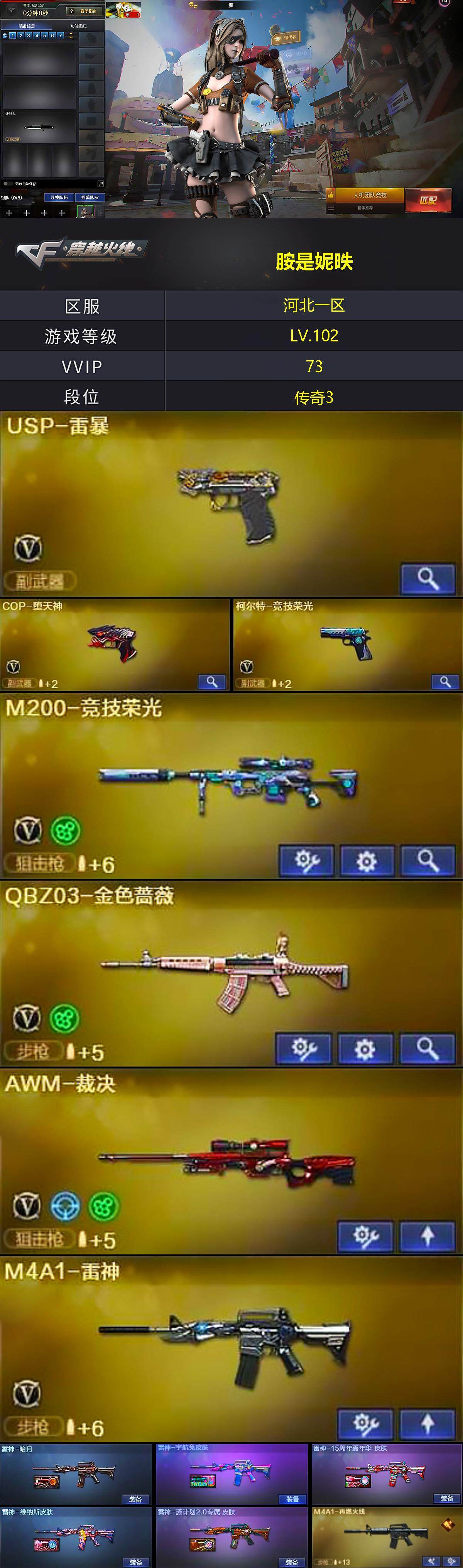 【热门武器】:QBZ03-金色蔷薇,HK417-朱雀,M200-竞技荣光,死亡之眼,金色小号,C.A.T,牛牛-AK47,M4A1-黑骑士*2,USP-雷暴,COP-堕天神,沙鹰-修罗*3