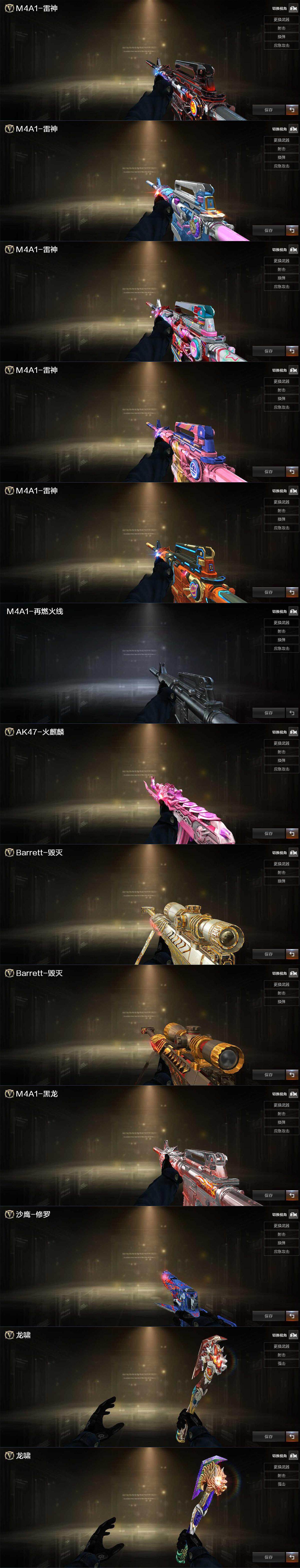 【皮肤】:雷神-暗月,雷神-宇航兔皮肤,雷神-15周年嘉年华 皮肤,雷神-维纳斯皮肤,雷神-源计划2.0专属 皮肤,M4A1-再燃火线,火麒麟-心动糖果,毁灭耀金皮肤,毁灭-英雄计划 皮肤,黑龙-暗月,修罗-能量核心,龙啸-醒狮 皮肤,龙啸-巅峰荣耀 皮肤