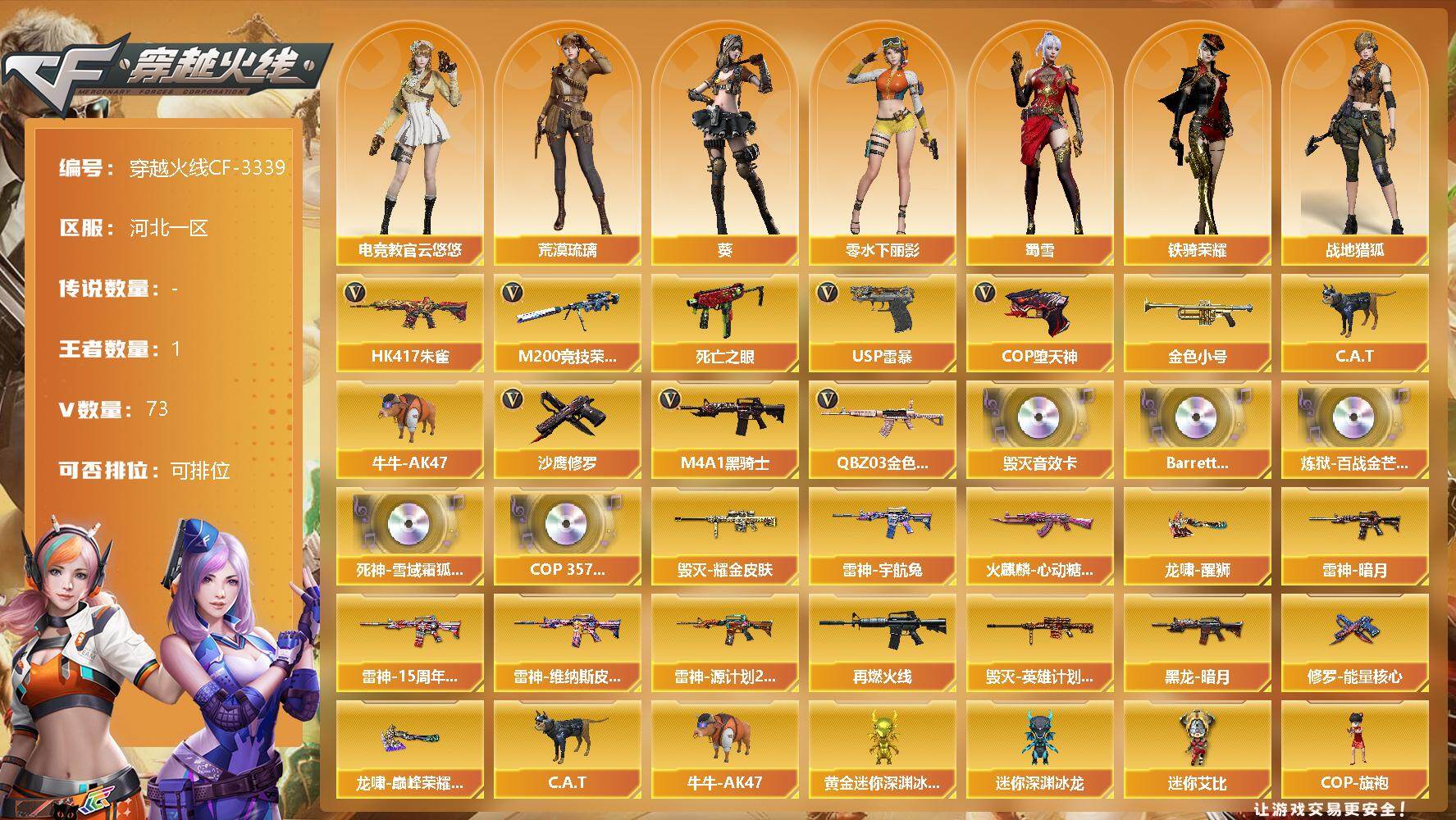 [13436177]河北一区-73V-1王者-0炫金 【热门武器】:QBZ03-金色蔷薇,HK417-朱雀,M200-竞技荣光,死亡之眼,金色小号,C.A.T,牛牛-AK47,M4A1-黑骑士*2,USP-雷暴,COP-堕天神,沙鹰-修罗*3 【音效卡】:Barrett-毁灭音效卡,Barrett-碧霄极光音效卡*2,炼狱-百战金芒-庆典舞曲音效卡,死神-雪域霜狐-怀旧音效卡,COP 357-雪域霜狐-怀旧音效卡 【皮肤】:雷神-暗月,雷神-宇航兔皮肤,雷神-15周年嘉年华 皮肤,雷神-维纳斯皮肤,雷神-源计划2.0专属 皮肤,M4A1-再燃火线,火麒麟-心动糖果,毁灭耀金皮肤,毁灭-英雄计划 皮肤,黑龙-暗月,修罗-能量核心,龙啸-醒狮 皮肤,龙啸-巅峰荣耀 皮肤 【角色】:葵,电竞教官-云悠悠,荒漠琉璃,战地猎狐,雪域霜狐,奇洋探员,乔伊教练,修道士,云海玲珑,暗夜-X,芳心审判者,飞虎队-X,娟娟,零-水下丽影,灵狐者-X,龙儿-小淘气,曼陀罗-X,潘多拉-X,潜龙队-X,斯沃特-X,蜀雪,铁骑荣耀,维纳斯,新娜塔莎,雪莉杨-摸金校尉,智影 【人偶武器】:COP-旗袍,C.A.T,牛牛-AK47,黄金迷你深渊冰龙,迷你深渊冰龙*2,迷你裂空之翼,黄金迷你裂空之翼,迷你波特博士*4,迷你牛牛,迷你火种*2,生化手雷-机甲核心*2,深渊终结者手雷*2,迷你艾比 【暴走生化】:死亡之眼,超级对讲机 【挑战大师】:暴君乱世-超越Max,AK47-冰龙粉碎者,冰龙粉碎者-白马银枪,VEPR-12-金魔*4,试炼破坏者III 【英雄级武器】:AK47-火麒麟*6,M4A1-雷神,M4A1-黑骑士*2,AK47-黑武士,M4A1-武圣,HK417-朱雀,M4A1-夜魔,死神-雪域霜狐,M4A1-玫瑰精灵,QBZ03-金色蔷薇,AWM-天龙*2,Barrett-毁灭*2,Barrett-极光*3,AWM-裁决,M200-竞技荣光,Barrett-金色蔷薇,炼狱-百战金芒,沙鹰-修罗*3,沙鹰-天神,USP-雷暴,COP-堕天神,柯尔特-竞技荣光,屠龙,龙啸,马来剑-夜魔,擎天,麒麟刺*2,擎天-竞技荣光,麒麟刺-百战金芒,高爆手雷-雷暴,高爆手雷-夜魔*3,高爆手雷-竞技荣光*3,闪光弹-雷暴,闪光弹-夜魔*3,闪光弹-竞技荣光*4,烟雾弹-夜魔*3,烟雾弹-竞技荣光*4,M4A1-赤狱骑士,