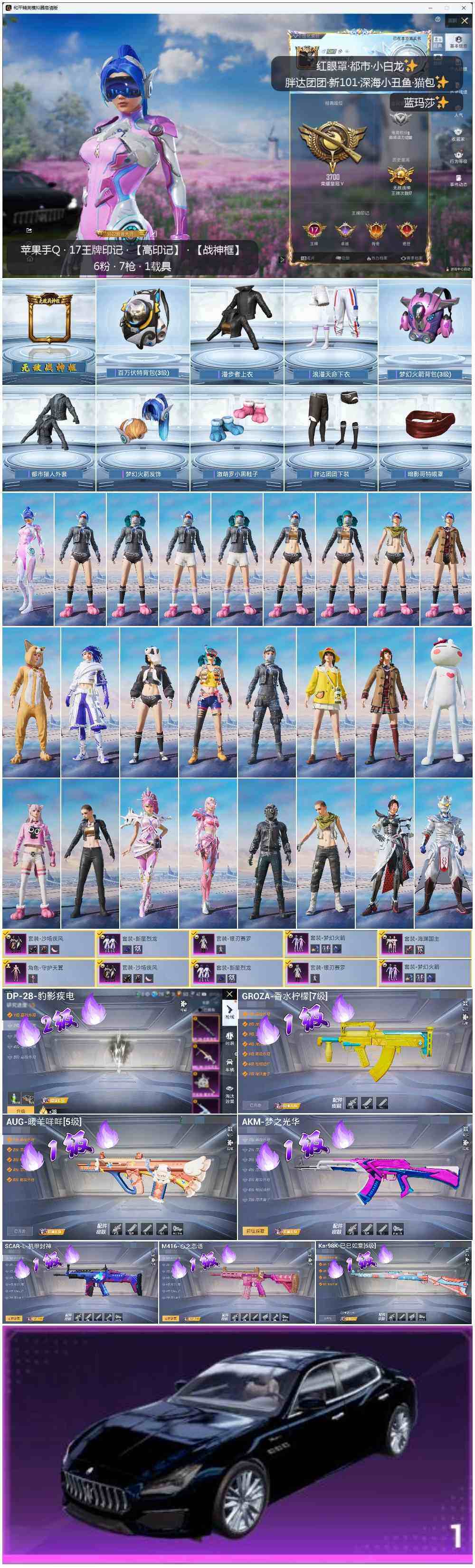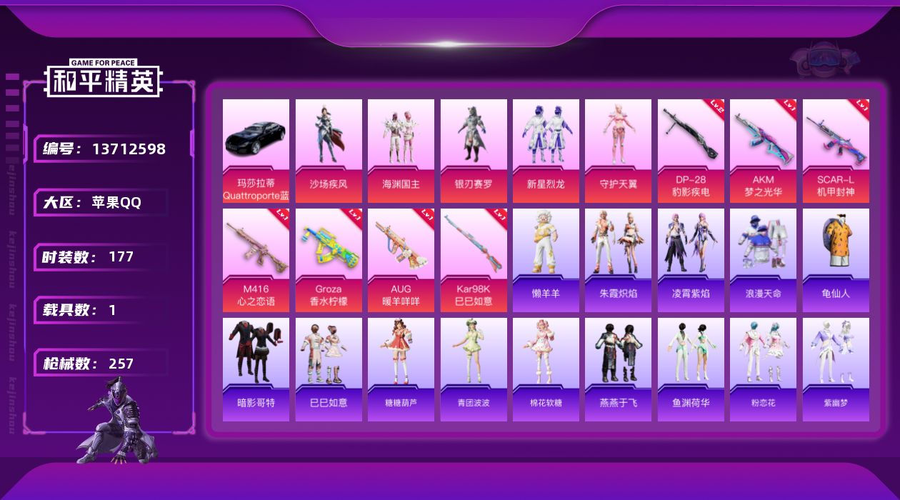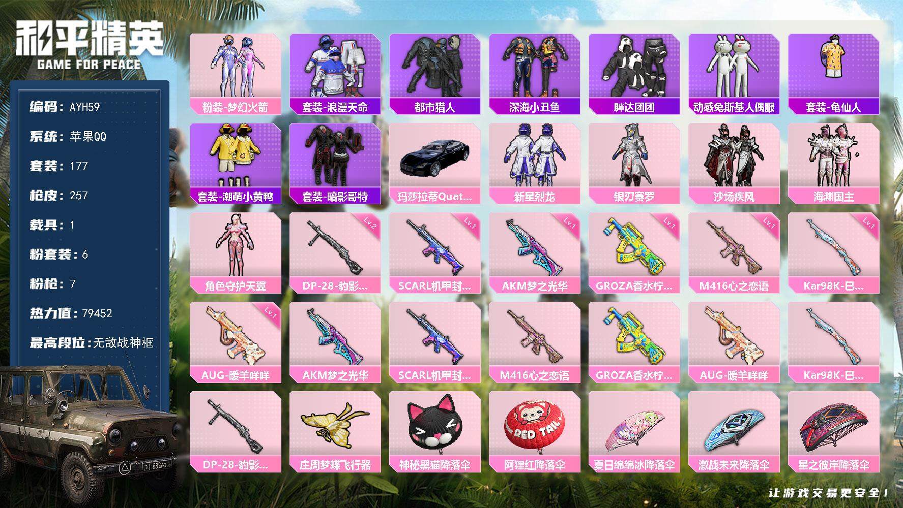 [13712598]可二次【店主推荐捡漏号!可直接换绑】地铁满天赋苹果 手Q-无敌战神框-6粉装-7特效枪-1载具-1粉色飞行器-79452热力值-17王牌印记-177套装-257枪皮【热门品类】:粉装-梦幻火箭,套装-浪漫天命,套装-都市猎人,套装-深海小丑鱼,套装-胖达团团,套装-动感兔斯基人偶服,套装-龟仙人,套装-潮萌小黄鸭,套装-暗影哥特【粉色载具】:玛莎拉蒂Quattroporte(夜幕蓝)【粉色套装】:粉装-梦幻火箭,粉装-新星烈龙,粉装-银刃赛罗,粉装-沙场疾风,粉装-海渊国主,角色-守护天翼【粉色枪皮等级】:AKM-梦之光华(一级),SCAR-L-机甲封神(一级),M416-心之恋语(一级),GROZA-香水柠檬(一级),AUG-暖羊咩咩(一级),Kar98K-巳巳如意(一级),DP-28-豹影疾电(二级)【粉色枪皮】:AKM-梦之光华,SCAR-L-机甲封神,M416-心之恋语,GROZA-香水柠檬,AUG-暖羊咩咩,Kar98K-巳巳如意,DP-28-豹影疾电【粉色飞行器】:庄周梦蝶飞行器