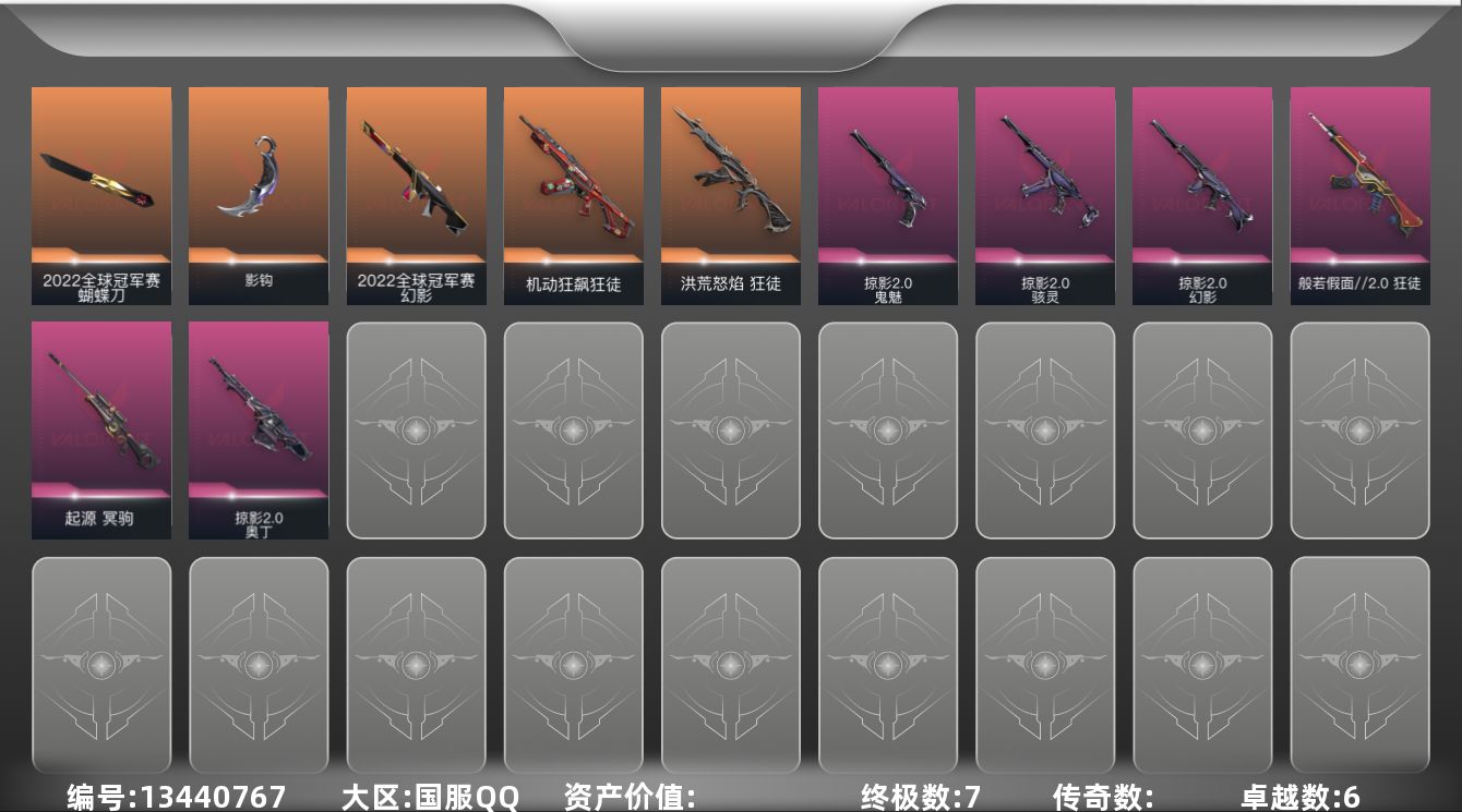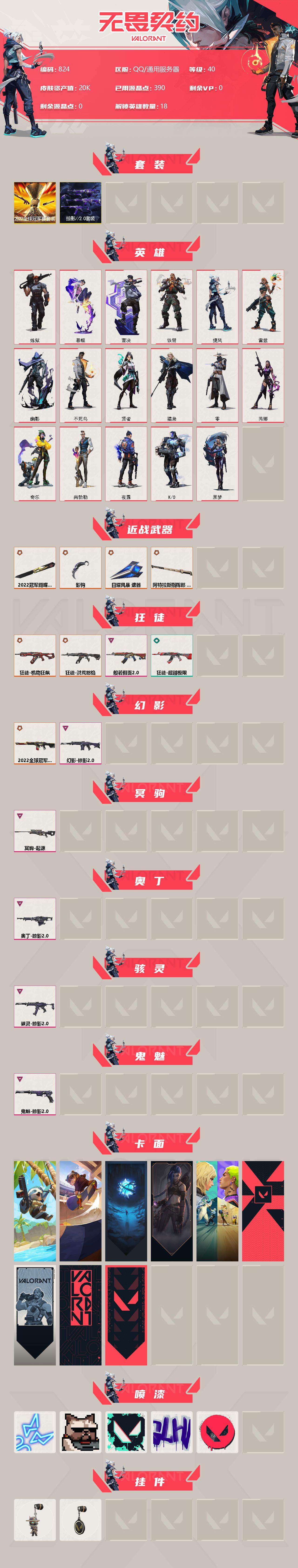 [13440767]【套装】:2022全球冠军赛套装,掠影//2.0套装 【英雄】:炼狱,暮蝶,壹决,铁臂,捷风,雷兹,幽影,不死鸟,贤者,猎枭,零,芮娜,奇乐,尚勃勒,夜露,K/O,黑梦 【近战 武器】:近战武器-2022全球冠军赛 蝴蝶刀,近战武器-影钩,近战武器-日耀风暴 遗器,近战武器-阿特拉斯指挥部 甩棍 【狂徒】:狂徒-洪荒怒焰,狂徒-机动狂飙,狂徒-般若假面//2.0,狂徒-超越极限 【幻影】:幻影-2022全球冠军赛,幻影-掠影//2.0 【冥驹】:冥驹-起源 【奥丁】:奥丁-掠影//2.0 【骇灵】:骇灵-掠影//2.0 【鬼魅】:鬼魅-掠影//2.0 【卡面】:树懒大作战 卡面,Clutch 卡面,无垠星环 卡面,《双城之战》金克丝 卡面,钢锁vs盖可 卡面,代号红色 卡面,新兵报到 卡面,V契约 卡面,无畏契约 卡面 【喷漆】:霓光四射 喷漆,关门放狗 喷漆,胜利属于无畏契约 喷漆,GLHF 喷漆,无畏契约 喷漆 【挂饰】:无畏契约GO!第一卷 零 挂饰,无畏契约 纪念币 挂饰