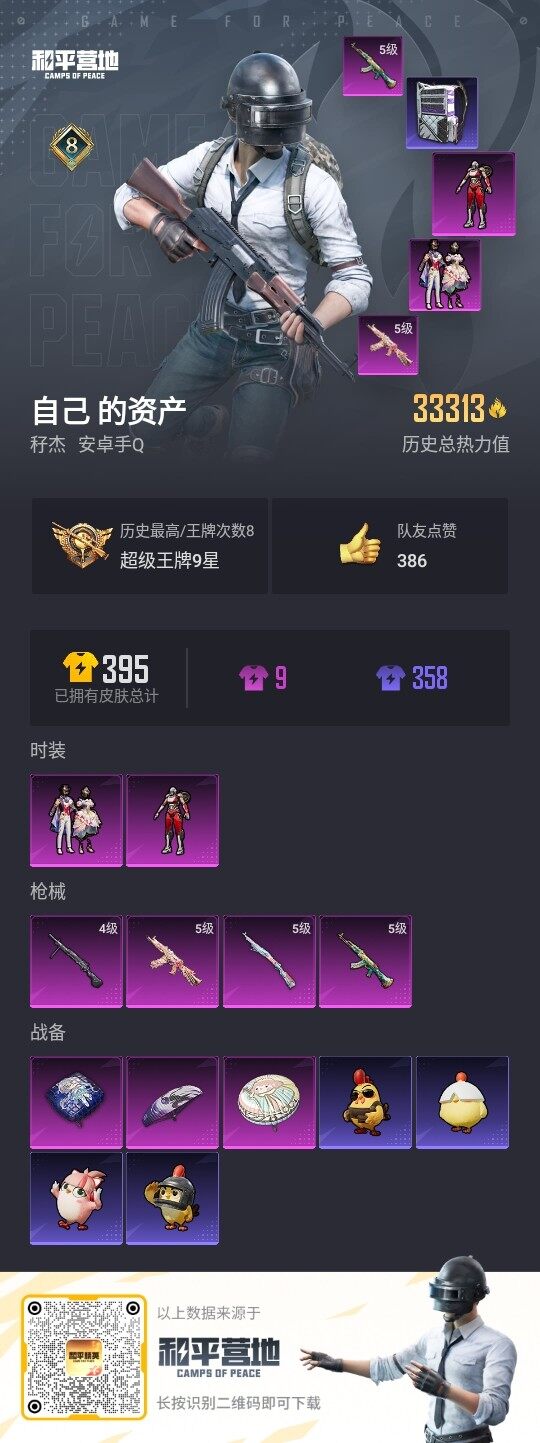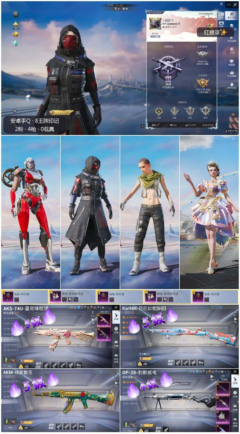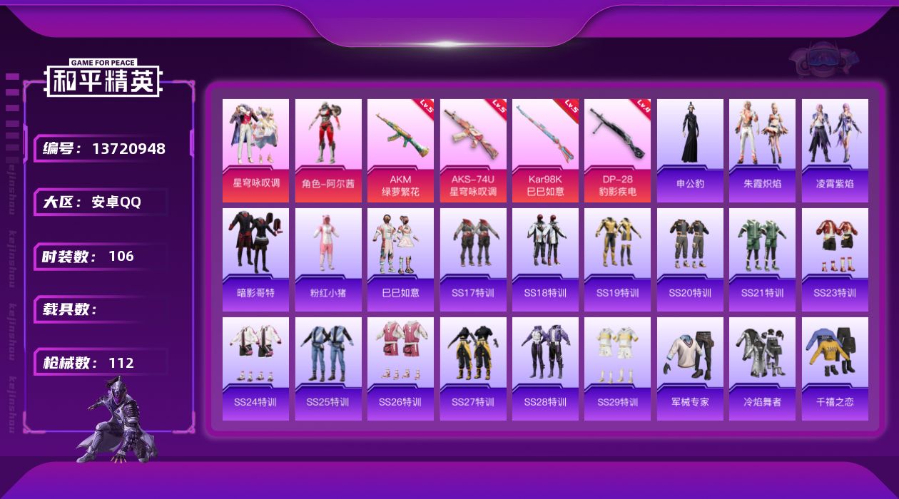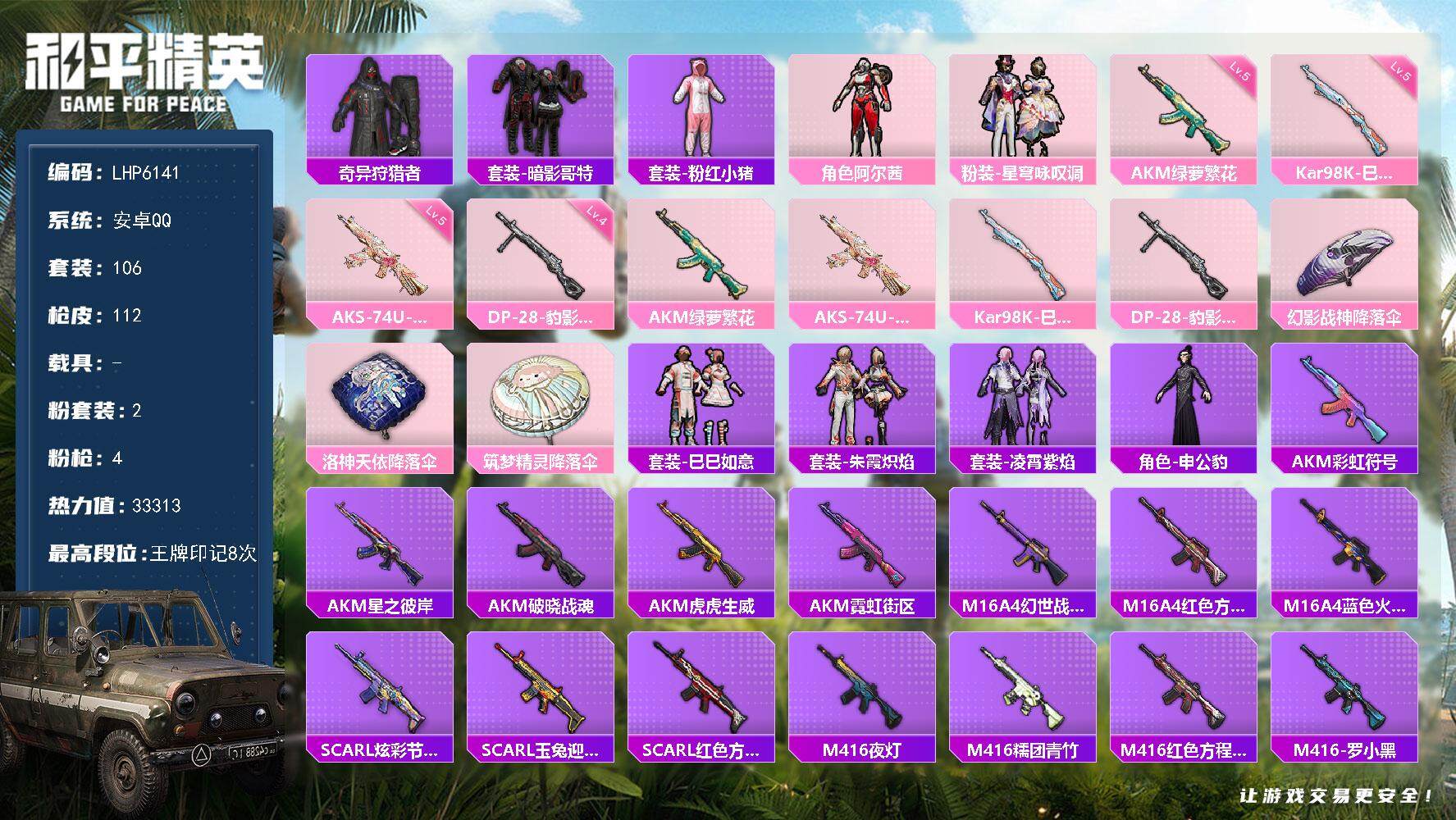 [13720948]可二次【店主推荐捡漏号!可直接换绑】 安卓 手Q-2粉装-4特效枪-3.3w热力值-8王牌印记-106套装-112枪皮【热门品类】:套装-奇异狩猎者,套装-暗影哥特,套装-粉红小猪【粉色套装】:角色-阿尔茜,粉装-星穹咏叹调【粉色枪皮等级】:AKM-绿萝繁花(五级),AKS-74U-星穹咏叹调(五级),Kar98K-巳巳如意(五级),DP-28-豹影疾电(四级)