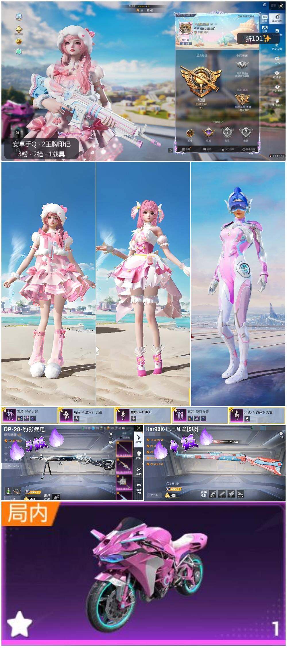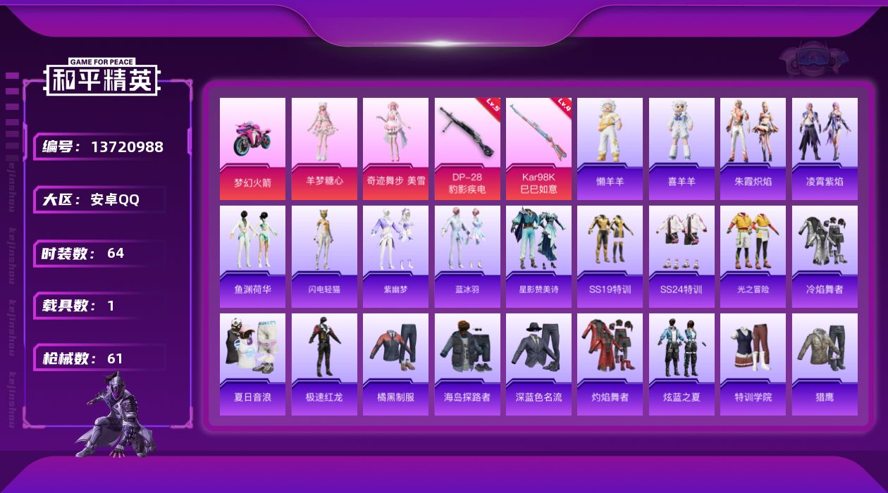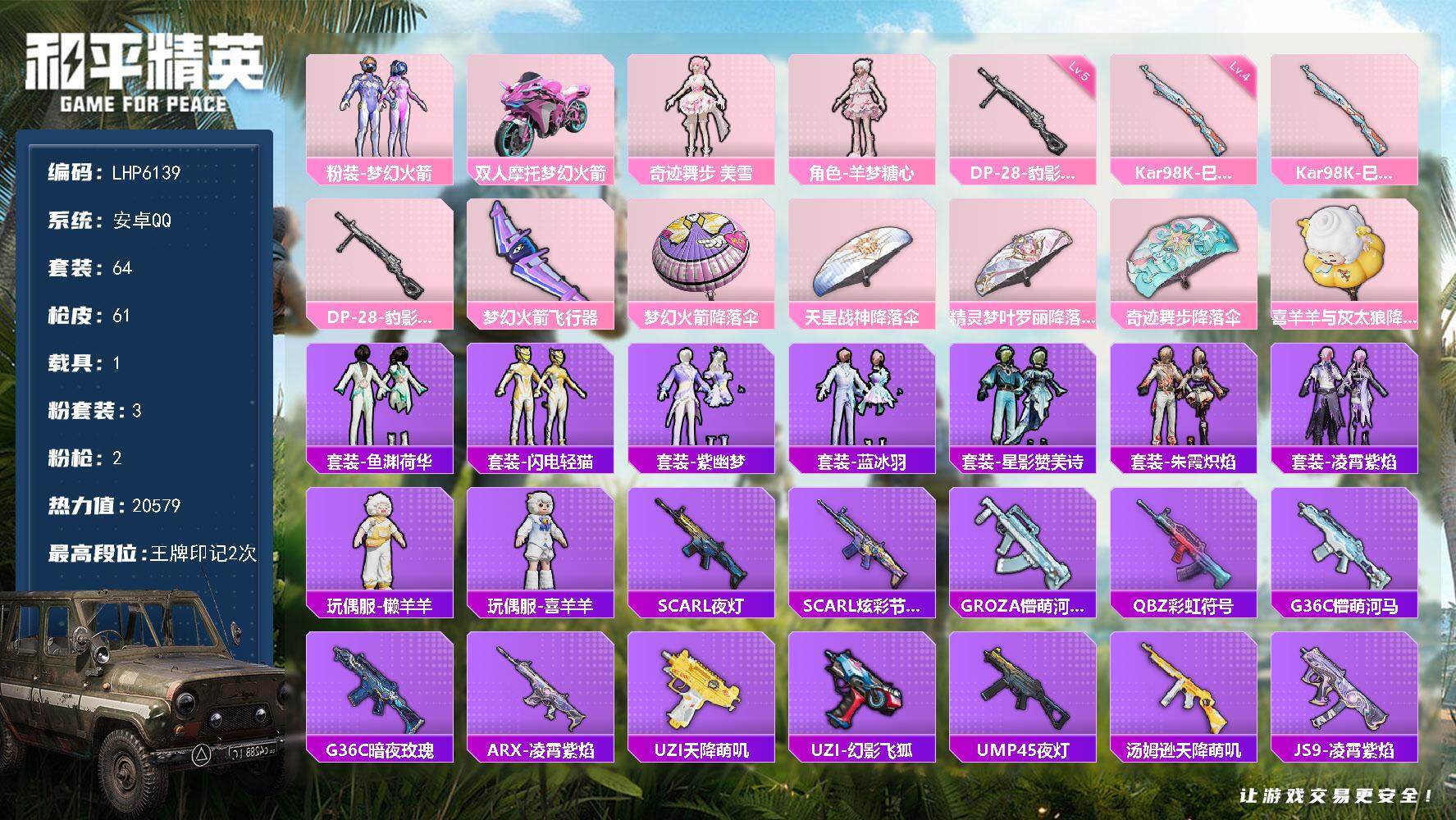 [13720988]可二次【店主推荐捡漏号!可直接换绑】 安卓 手Q-3粉装-2特效枪-1载具-1粉色飞行器-2w热力值-2王牌印记-64套装-61枪皮【热门品类】:粉装-梦幻火箭【粉色载具】:双人摩托-梦幻火箭【粉色套装】:粉装-梦幻火箭,角色-奇迹舞步 美雪,角色-羊梦糖心【粉色枪皮等级】:Kar98K-巳巳如意(四级),DP-28-豹影疾电(五级)【粉色飞行器】:梦幻火箭飞行器