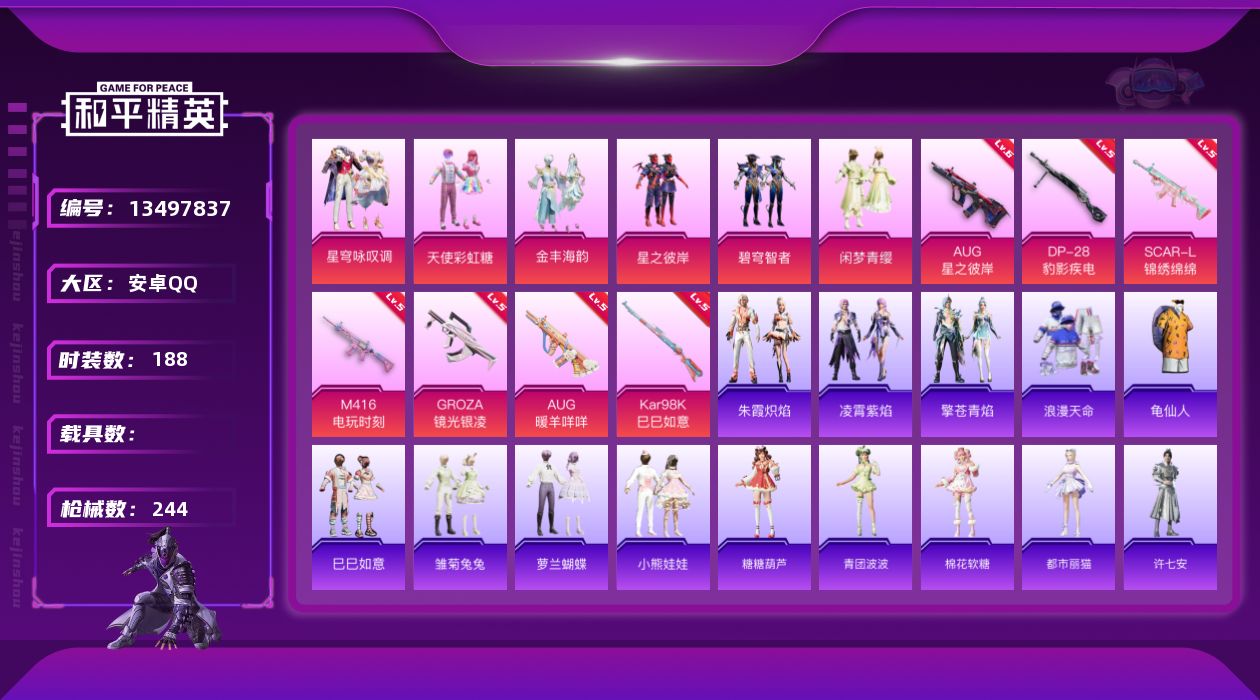 [13497837]【店主推荐捡漏号!可直接换绑】地铁满天赋安卓 手Q-无敌战神框-6粉装-8特效枪-0载具-5粉色飞行器-72257热力值-15王牌印记-188套装-244枪皮【热门品类】:套装-浪漫天命,套装-派对舞王,套装-深海小丑鱼,套装-龟仙人【粉色套装】:粉装-天使彩虹糖,粉装-星之彼岸,粉装-碧穹智者,粉装-闲梦青缨,粉装-金丰海韵,粉装-星穹咏叹调【粉色枪皮等级】:SCAR-L-锦绣绵绵(五级),M416-电玩时刻(五级),GROZA-镜光银凌(五级),AUG-星之彼岸(六级),AUG-暖羊咩咩(五级),Kar98K-巳巳如意(五级),Mk14-甜梦熊击(五级),DP-28-豹影疾电(五级)【粉色枪皮】:SCAR-L-锦绣绵绵,M416-电玩时刻,GROZA-镜光银凌,AUG-星之彼岸,AUG-暖羊咩咩,Kar98K-巳巳如意,Mk14-甜梦熊击,DP-28-豹影疾电【粉色飞行器】:天之羽翼飞行器,黄族统领飞行器