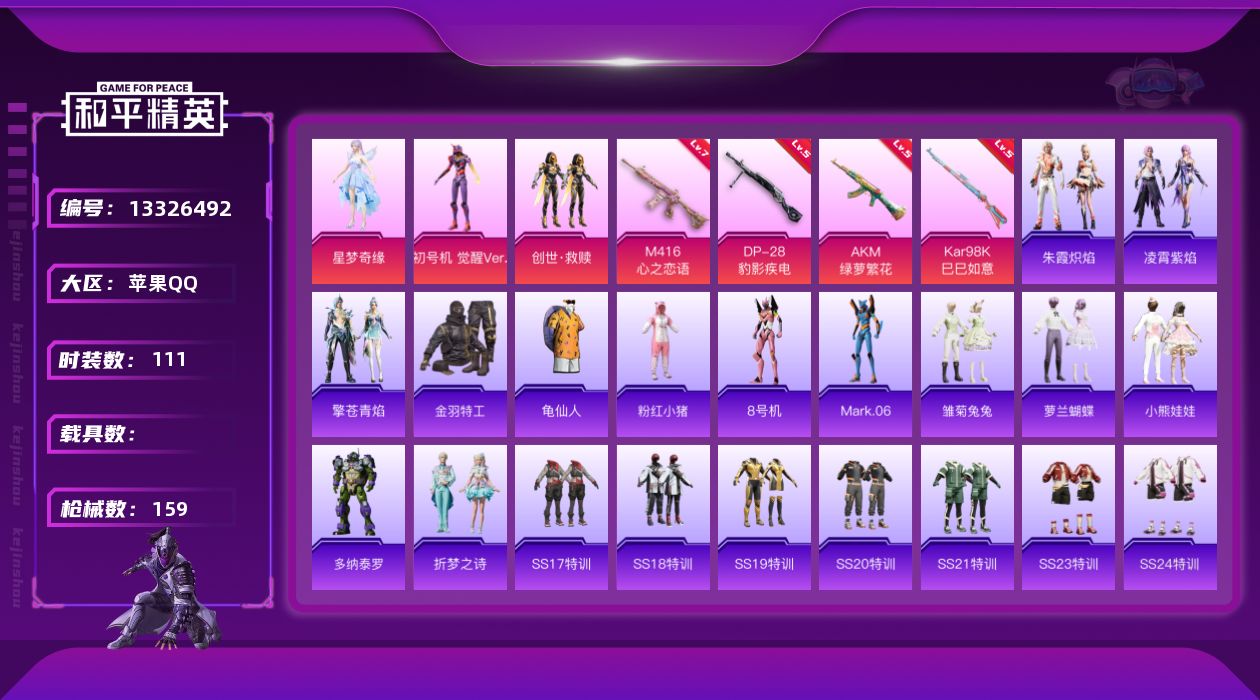 - PX_2110304- 苹果手Q-15王牌印记-8粉装-3特效枪-1载具-83689热力值-193套装-244枪皮-1卓越印记-1传奇印记 【8粉装】,梦幻火箭,天使彩虹糖,幻彩电音,狂魅哈莉,暗夜鎏金,数码大师,未来战士,粉色回忆 【3特效枪】AKM-绿萝繁花-5级 M416-心之恋语-7级 Mk14-闲梦青缨-7级 【13稀有紫装】,都市猎人,派对舞王,赤蝎幽灵,Mark.06,奇异狩猎者,