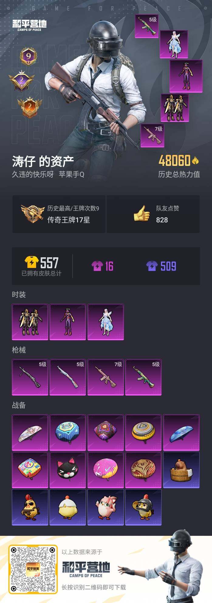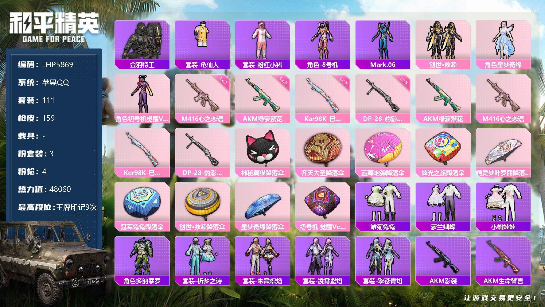 [13326492]可二次【店主推荐捡漏号!可直接换绑】地铁满天赋 苹果 手Q-3粉装-4特效枪-4.8w热力值-9王牌印记-111套装-159枪皮【热门品类】:套装-金羽特工,套装-龟仙人,套装-粉红小猪,角色-8号机,角色-Mark.06【粉色套装】:套装-创世·救赎,角色-星梦奇缘,角色-初号机 觉醒Ver.【粉色枪皮等级】:AKM-绿萝繁花(五级),M416-心之恋语(七级),Kar98K-巳巳如意(五级),DP-28-豹影疾电(五级)