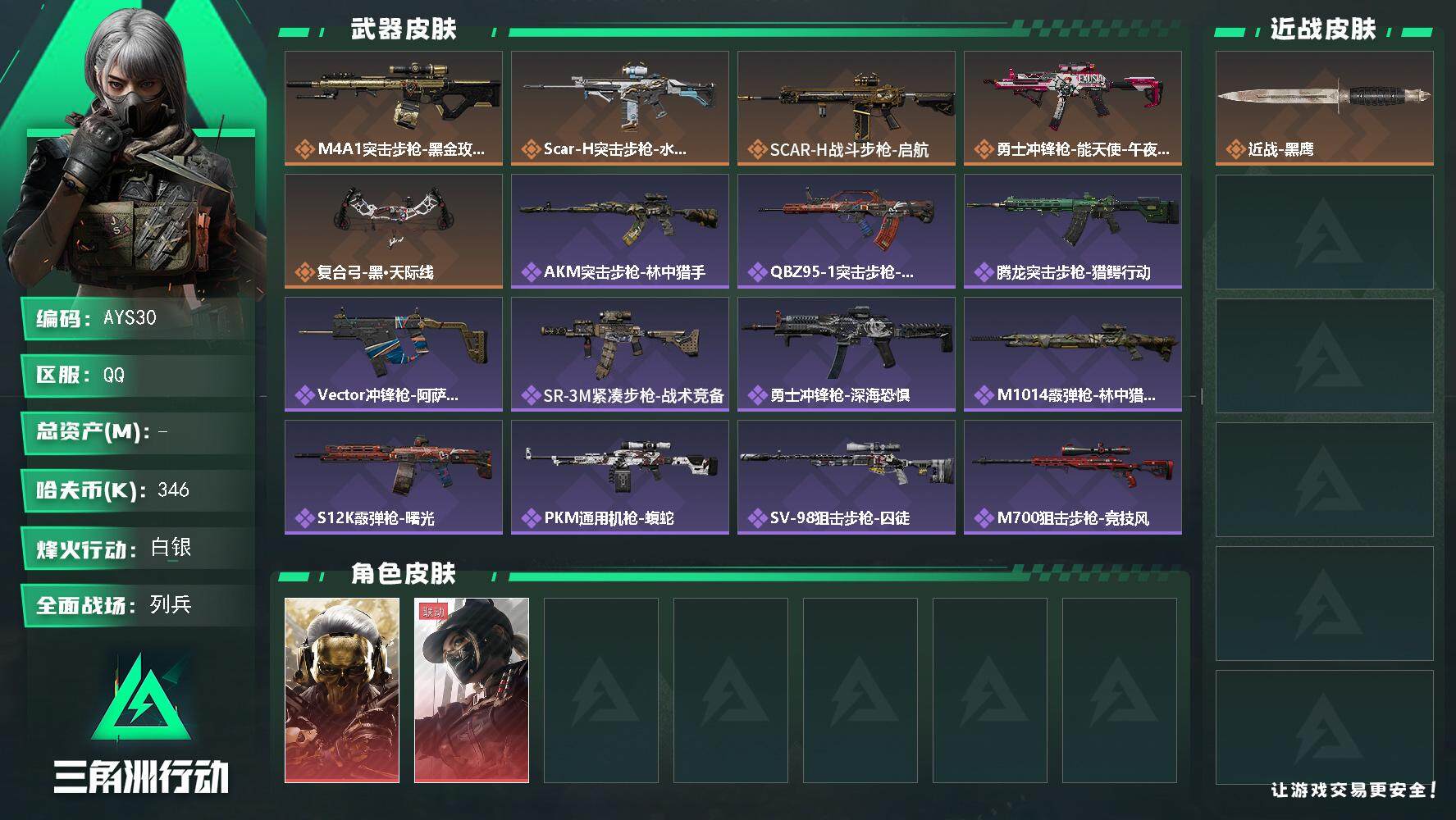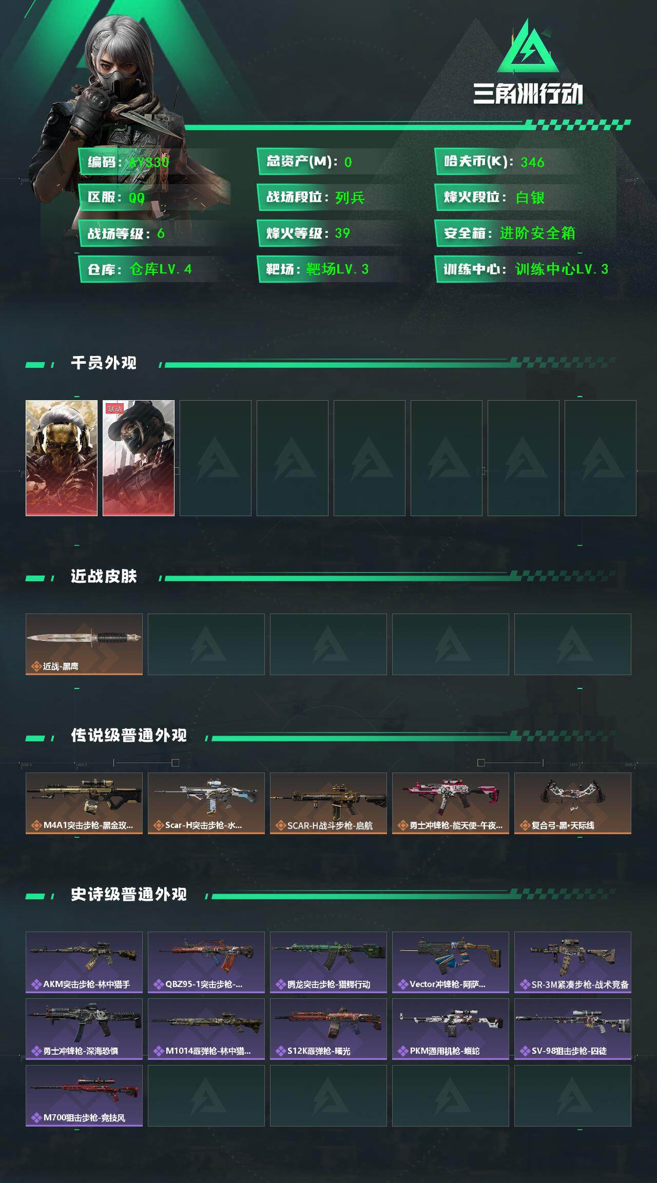 [13822786]【店主推荐捡漏号!可直接换绑】346k哈伏币-1m流动资产-39烽火等级-白银-6战场等级-列兵 【干员外观】:红狼-蚀金玫瑰,露娜-黑·天际线 【近战皮肤】:近战-黑鹰 【传说级普通外观】:M4A1突击步枪-蚀金玫瑰,SCAR-H战斗步枪-水墨云图,SCAR-H战斗步枪-启航,勇士冲锋枪-能天使-午夜邮差,复合弓-黑·天际线 【史诗级普通外观】:AKM突击步枪-林中猎手,QBZ95-1突击步枪-曙光,腾龙突击步枪-猎鳄行动,Vector冲锋枪-阿萨拉文明,SR-3M紧凑突击步枪-战术竞备,勇士冲锋枪-深海恐惧,M1014霰弹枪-林中猎手,S12K霰弹枪-曙光,PKM通用机枪-蝮蛇,SV-98狙击步枪-囚徒,M700狙击步枪-竞技风 【稀有级普通外观】:M4A1突击步枪-零点,ASh-12战斗步枪-星链科技,K416突击步枪-碳纤维,AK-12突击步枪-零点,SCAR-H战斗步枪-童趣,SCAR-H战斗步枪-荣耀列队,MP5冲锋枪-弄臣,P90冲锋枪-浅鲨小队,Vector冲锋枪-先锋,SMG-45-行动开启,SMG-45冲锋枪-幻影结构,SMG-45冲锋枪-天网,MP7冲锋枪-幻影结构,M1014霰弹枪-幻影结构,M1014霰弹枪-童趣,Mini-14射手步枪-荣耀列队,VSS射手步枪-童趣,SVD狙击步枪-战术行动,SKS射手步枪-弄臣,SR-25射手步枪-开拓,SV-98狙击步枪-星链科技,G18-星链科技 【普通级普通外观】:M4A1突击步枪-粉色涂装,M4A1突击步枪-高雅黑,M4A1突击步枪-几何碎片,M4A1突击步枪-海色,QBZ95-1突击步枪-高雅黑,QBZ95-1突击步枪-海浪,QBZ95-1突击步枪-海色,QBZ191突击步枪-三角洲力量,K416突击步枪-几何迷彩,K416突击步枪-高雅黑,AUG突击步枪-浅蓝涂装,M7战斗步枪-红色涂装,SG552突击步枪-海浪,AK-12突击步枪-冰川,SCAR-H战斗步枪-数码迷彩,G3战斗步枪-高雅黑,PTR-32突击步枪-黄蜂,CAR-15突击步枪-几何碎片,MP5冲锋枪-安全工作,MP5冲锋枪-海色,MP5冲锋枪-黄蜂,Vector冲锋枪-几何迷彩,Vector冲锋枪-几何碎片,UZI冲锋枪-海色,SMG-45-几何碎片,QCQ171冲锋枪-三角洲力量,M1014霰弹枪-高雅黑,M1014霰弹枪