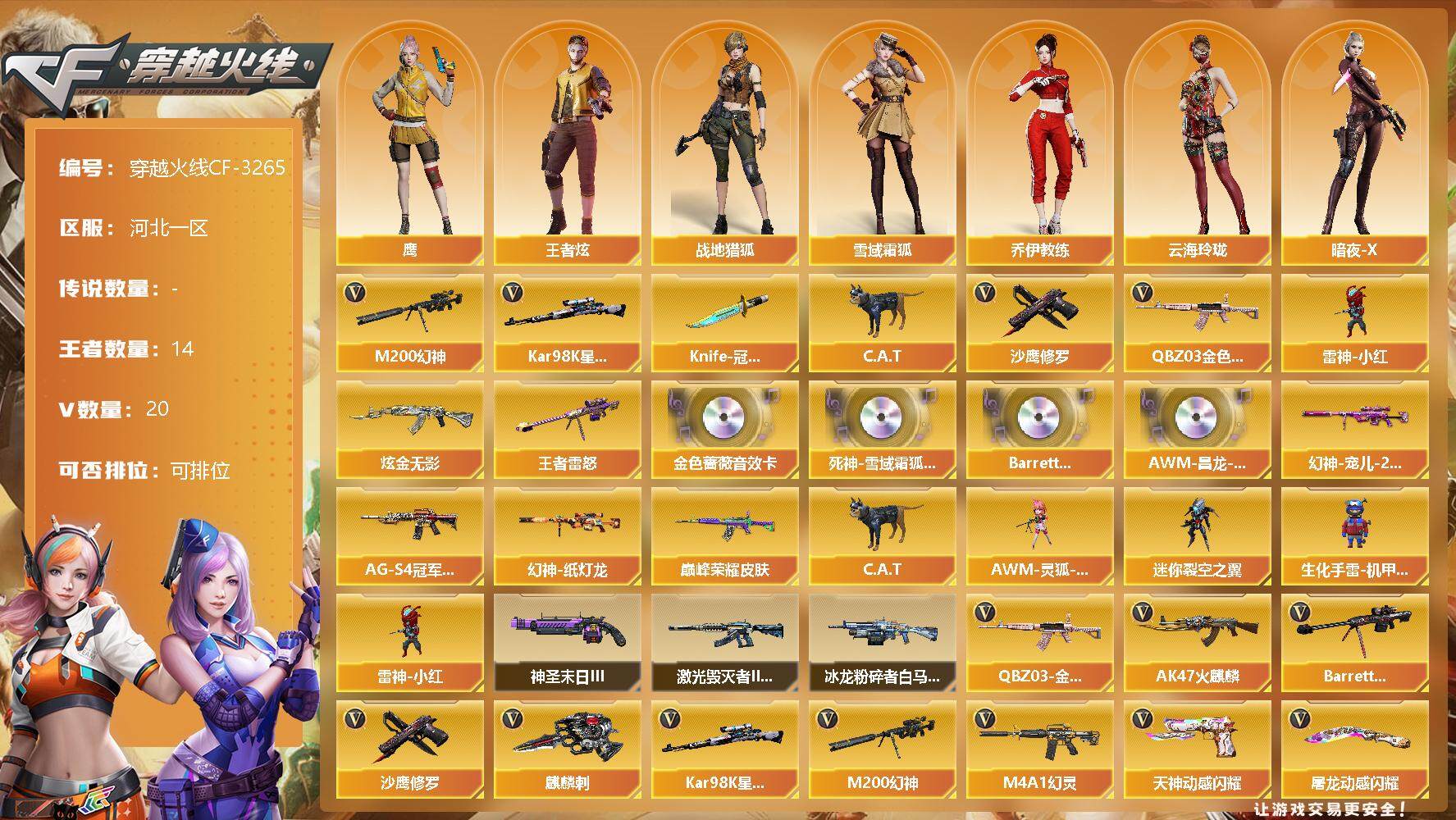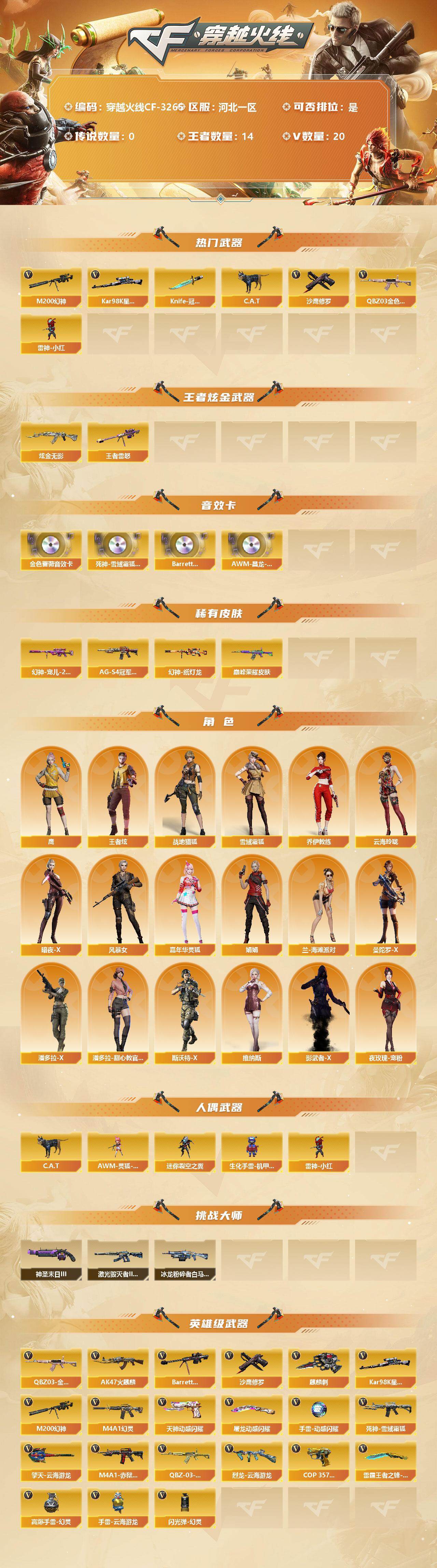 [13336172]河北一区-20V-14王者-1炫金 【热门武器】:QBZ03-金色蔷薇,M200-幻神,Kar98K-星神,C.A.T,雷神-小红,沙鹰-修罗,Knife-冠军之刃 【王者炫金武器】:王者雷怒,炫金无影 【音效卡】:QBZ03-金色蔷薇音效卡,死神-雪域霜狐-怀旧音效卡,Barrett-毁灭-怀旧音效卡,AWM-昌龙-怀旧音效卡*2 【皮肤】:幻神-宠儿-2021MVP,幻神-纸灯龙皮肤,QBZ03-巅峰荣耀皮肤,毁灭-巅峰荣耀 皮肤,黑骑士-AG-S4冠军典藏 【角色】:鹰,战地猎狐,王者炫,雪域霜狐,乔伊教练,云海玲珑,暗夜-X,风暴女,嘉年华灵狐,娟娟,兰-海滩派对,曼陀罗-X,潘多拉-X,潘多拉-甜心教官,斯沃特-X,维纳斯,夜玫瑰-宠粉,影武者-X 【人偶武器】:雷神-小红,AWM-灵狐-15周年嘉年华,C.A.T,迷你裂空之翼,生化手雷-机甲核心 【挑战大师】:冰龙粉碎者-白马银枪,激光毁灭者III-白马银枪,神圣爆裂者-末日III 【英雄级武器】:AK47-火麒麟,M4A1-幻灵,死神-雪域霜狐,QBZ03-金色蔷薇,QBZ-03-王者蔷薇-觉醒版,Barrett-毁灭,M200-幻神,Kar98K-星神,烈龙-云海游龙,沙鹰-修罗,COP 357-雷霆王者-觉醒版,天神-动感闪耀,麒麟刺,屠龙-动感闪耀,擎天-云海游龙,雷霆王者之锋-觉醒版,高爆手雷-幻灵*2,手雷-动感闪耀,手雷-云海游龙,闪光弹-幻灵,闪光弹-雷霆王者-觉醒版*3,烟雾弹-雷霆王者-觉醒版,M4A1-赤狱骑士 【道具】:CFS限定背包,云海游龙炫彩背包,亚洲杯纪念炫彩背包,炫彩背包-诺拉,雪域霜狐炫彩背包,黄金曼提柯尔的背包,黑桃战神背包,救世主-黑桃战神,黄金生化钩,绿色巨人,灵魂忍者,迷雾幽灵,夺命之镰,防化服*3,金色流光-枪王排位*2,星辰流光-枪王排位,流光-鎏金之域,流光-再燃火线,枪王排位28赛季金色流光,语音特效-怀旧,雪域霜狐表情,云海游龙表情,C4-再燃火线*2,防弹头盔*6,防弹衣*6,C4工具钳*6,手雷包*6 【特殊枪械】:
