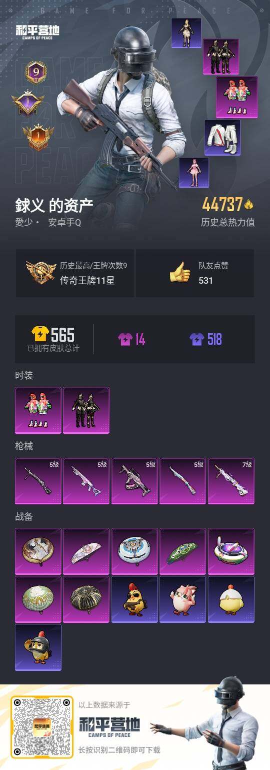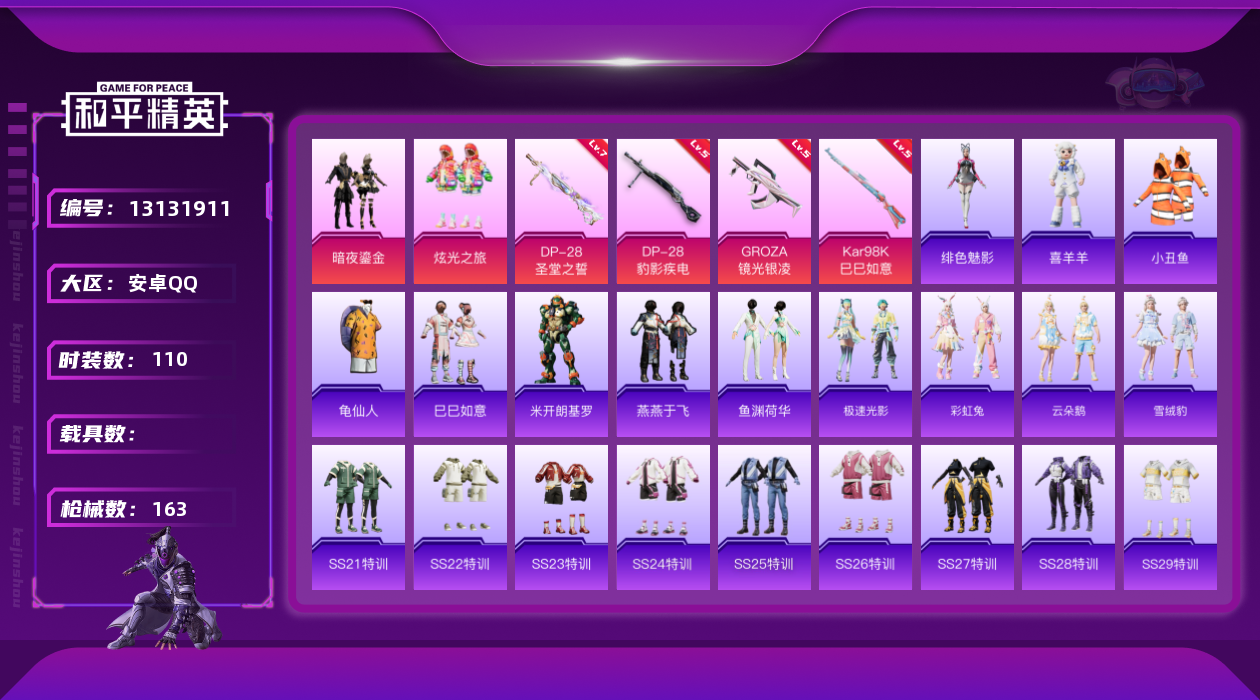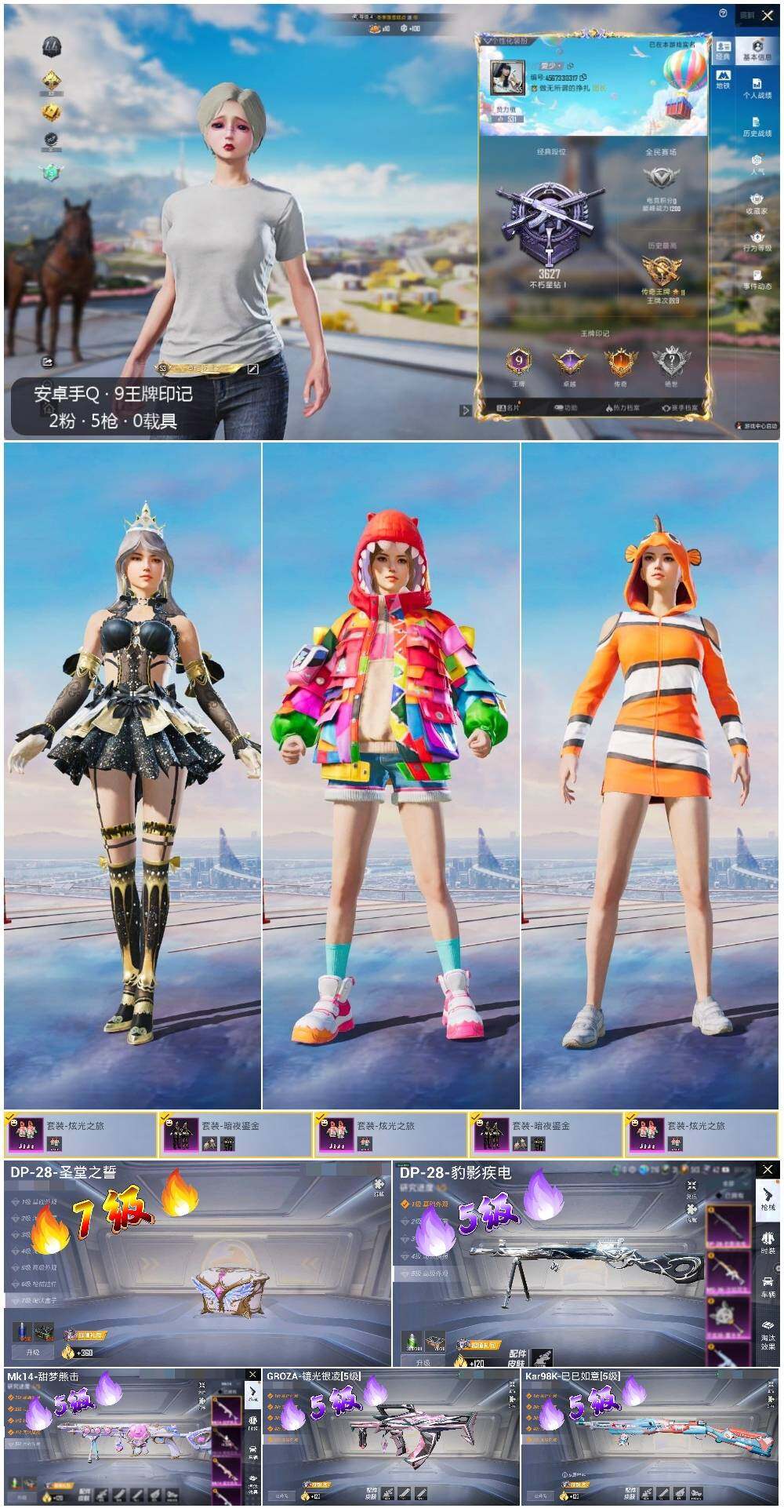 [13131911]安卓 手Q-2粉装-5特效枪-1粉色飞行器-4.4w热力值-9王牌印记-110套装-163枪皮【热门品类】:套装-小丑鱼,套装-龟仙人【粉色套装】:粉装-暗夜鎏金,粉装-炫光之旅【粉色枪皮等级】:GROZA-镜光银凌(五级),Kar98K-巳巳如意(五级),Mk14-甜梦熊击(五级),DP-28-圣堂之誓(七级),DP-28-豹影疾电(五级)【粉色飞行器】:太空嘟嘟飞行器