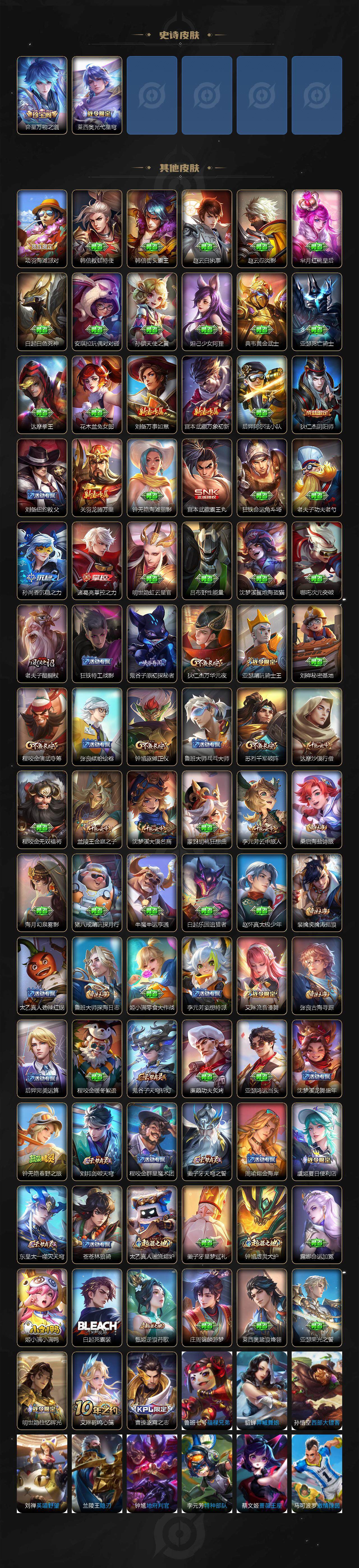 【史诗皮肤】:鲁班七号电玩小子,赵云皇家上将,赵云未来纪元,貂蝉圣诞恋歌,甄姬冰雪圆舞曲,王昭君偶像歌手,狄仁杰魔术师,孙尚香蔷薇恋人,孙尚香水果甜心,妲己魅力维加斯,妲己女仆咖啡,墨子金属风暴,吕布圣诞狂欢,刘禅绅士熊喵,夏侯惇乘风破浪,兰陵王暗隐猎兽者,雅典娜冰冠公主,李元芳逐浪之夏,阿轲节奏热浪,狄仁杰鹰眼统帅,典韦岱宗,孙尚香时之恋人,裴擒虎李小龙,元歌云间偶戏,夏洛特永昼,鬼谷子五谷丰年,元歌无心,阿古朵江河有灵,蒙犽百解令,蔡文姬夏日便利店,弈星万物之道,莱西奥光弋星穹