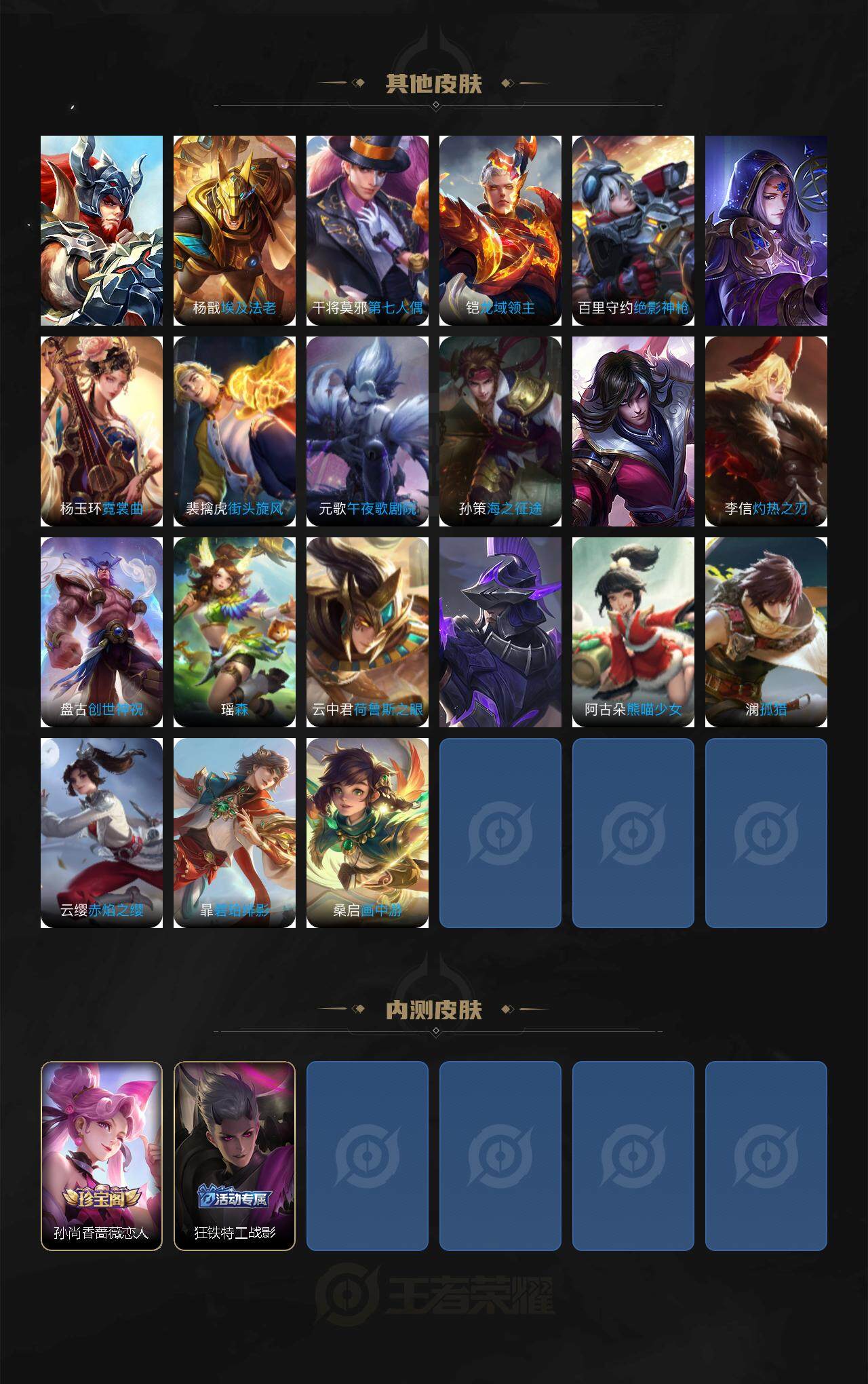【其他皮肤】:项羽海滩派对,韩信教廷特使,韩信街头霸王,赵云白执事,赵云忍炎影,芈月红桃皇后,白起白色死神,安琪拉玩偶对对碰,孙膑天使之翼,妲己少女阿狸,典韦黄金武士,亚瑟死亡骑士,达摩拳王,花木兰兔女郎,刘备万事如意,宫本武藏万象初新,后羿阿尔法小队,狄仁杰阴阳师,刘备纽约教父,关羽龙腾万里,钟无艳海滩丽影,宫本武藏霸王丸,狂铁命运角斗场,老夫子功夫老勺,孙尚香沉稳之力,诸葛亮掌控之力