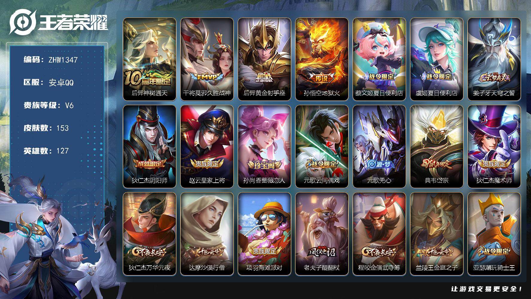 [13843526]【店主推荐捡漏号!可直接换绑】安卓Q-V6-最强王者段位-127英雄-153皮肤-4传说-32史诗 【传说皮肤】:后羿神树通天,干将莫邪久胜战神,后羿黄金射手座,孙悟空地狱火 【限定皮肤】:蔡文姬夏日便利店,虞姬夏日便利店,姜子牙天穹之誓,狄仁杰阴阳师,赵云皇家上将,孙尚香蔷薇恋人,元歌云间偶戏,元歌无心,典韦岱宗,狄仁杰魔术师,狄仁杰万华元夜,达摩沙漠行僧,项羽海滩派对,老夫子醍醐杖,程咬金演武夺筹,兰陵王金庭之子,亚瑟潮玩骑士王,李元芳云中旅人,钟馗驱傩正仪,鬼谷子原初探秘者,鬼谷子五谷丰年,苏烈千军破阵,沈梦溪大漠名商,裴擒虎李小龙,裴擒虎擒涛扼浪,鲁班大师探海日志,桑启海盐诗旅,艾琳流音漫舞,阿古朵江河有灵,张良古海寻踪,蒙犽百解令,鬼谷子天穹祈灯,沈梦溪龙舞盛年,刘邦剑破天穹,程咬金群星魔术团,周瑜熔金海岸 【年限皮肤】:典韦岱宗 【赛季限定】:狄仁杰万华元夜,达摩沙漠行僧,老夫子醍醐杖,程咬金演武夺筹,兰陵王金庭之子,张良古海寻踪,李元芳云中旅人,钟馗驱傩正仪,鬼谷子原初探秘者,苏烈千军破阵,沈梦溪大漠名商,裴擒虎擒涛扼浪,鲁班大师探海日志,桑启海盐诗旅,鬼谷子天穹祈灯,刘邦剑破天穹,姜子牙天穹之誓 【战令限定】:蔡文姬夏日便利店,虞姬夏日便利店,元歌云间偶戏,艾琳流音漫舞,亚瑟潮玩骑士王 【史诗皮肤】:鲁班七号电玩小子,赵云皇家上将,赵云未来纪元,貂蝉圣诞恋歌,甄姬冰雪圆舞曲,王昭君偶像歌手,狄仁杰魔术师,孙尚香蔷薇恋人,孙尚香水果甜心,妲己魅力维加斯,妲己女仆咖啡,墨子金属风暴,吕布圣诞狂欢,刘禅绅士熊喵,夏侯惇乘风破浪,兰陵王暗隐猎兽者,雅典娜冰冠公主,李元芳逐浪之夏,阿轲节奏热浪,狄仁杰鹰眼统帅,典韦岱宗,孙尚香时之恋人,裴擒虎李小龙,元歌云间偶戏,夏洛特永昼,鬼谷子五谷丰年,元歌无心,阿古朵江河有灵,蒙犽百解令,蔡文姬夏日便利店,弈星万物之道,莱西奥光弋星穹 【其他皮肤】:项羽海滩派对,韩信教廷特使,韩信街头霸王,赵云白执事,赵云忍炎影,芈月红桃皇后,白起白色死神,安琪拉玩偶对对碰,孙膑天使之翼,妲己少女阿狸,典韦黄金武士,亚瑟死亡骑士,达摩拳王,花木兰兔女郎,刘备万事如意,宫本武藏万象初新,后羿阿尔法小队,狄仁杰阴阳师,刘备纽约教父,关羽龙腾万里,钟无艳海滩丽影,宫本武藏霸王丸,狂铁命运角斗场,老夫子功夫老勺,孙尚香沉稳之力,诸葛亮掌控之力