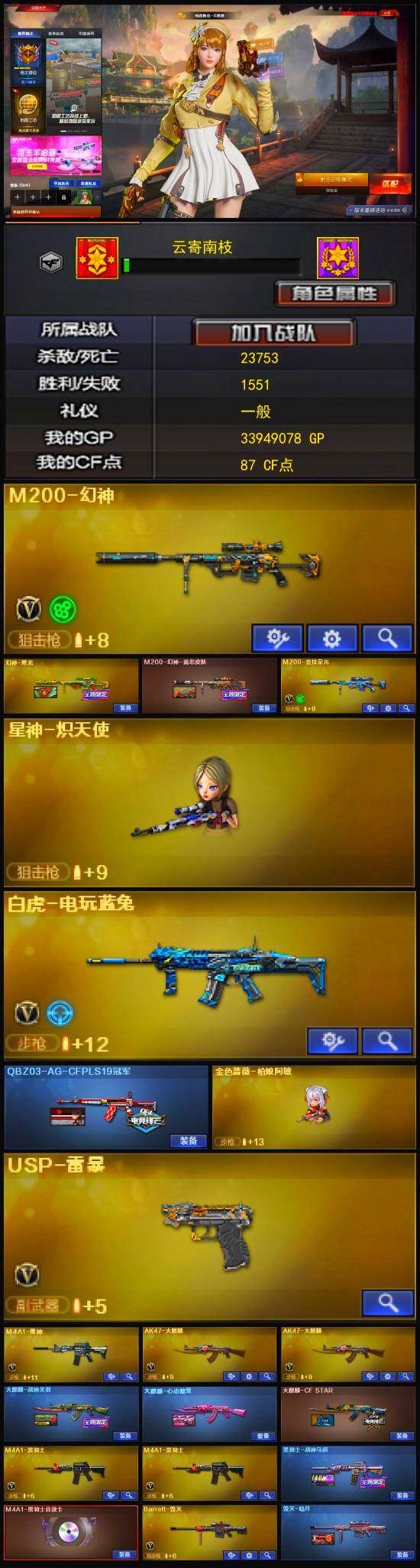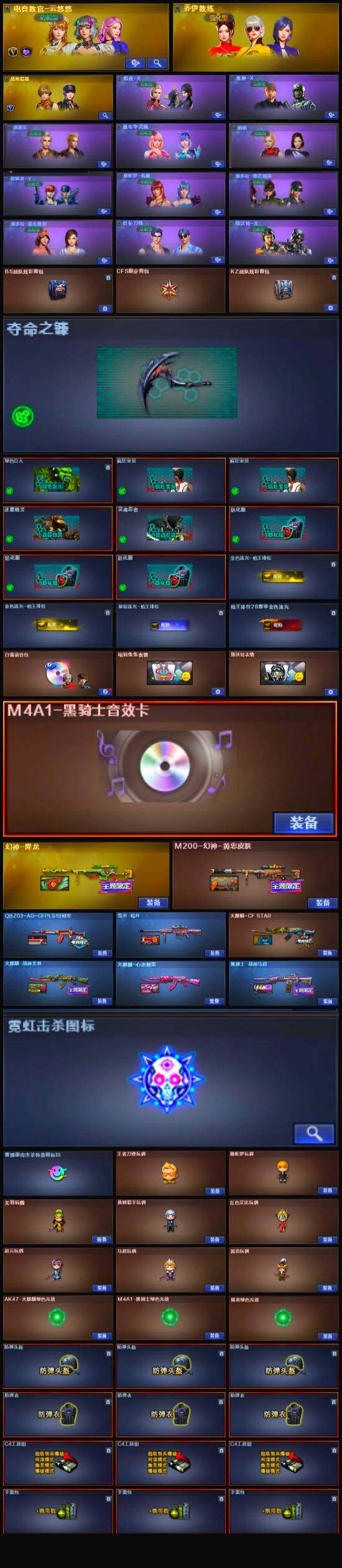 【皮肤】:M200-幻神-黄忠皮肤,幻神-降龙,QBZ03-AG-CFPLS19冠军,M4A1-战神赵云,火麒麟-战神关羽,火麒麟-心动糖果,毁灭-暗月,黑骑士-战神马超,战神-流金岁月皮肤,AK47-B-常胜将军-刘备