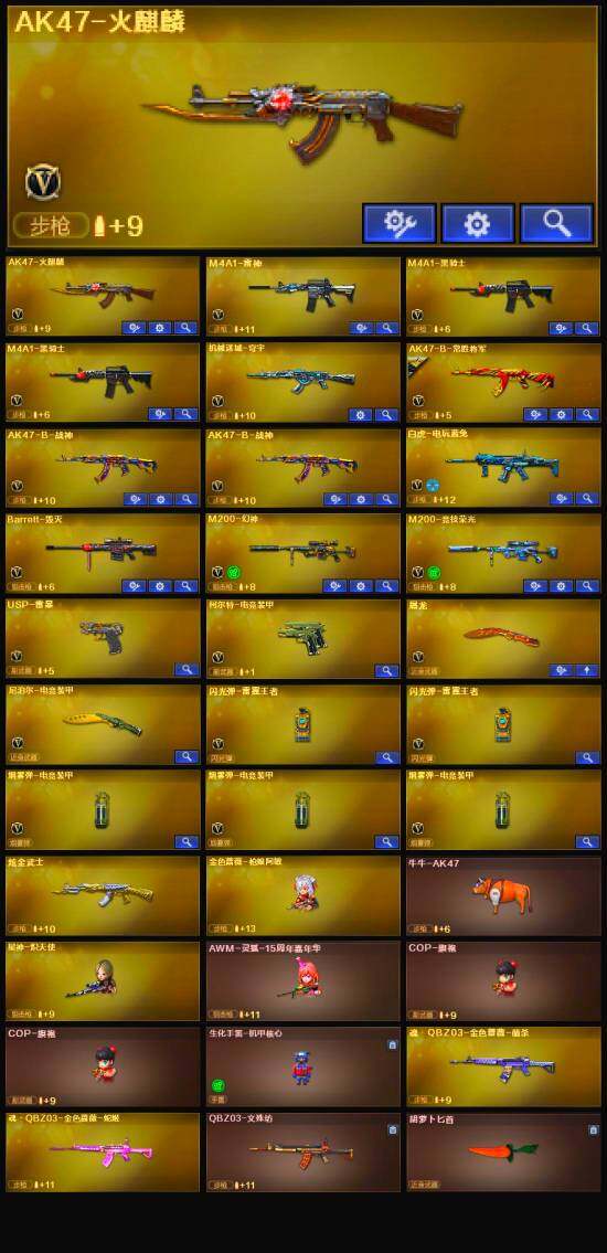 【英雄级武器】:AK47-火麒麟*2,M4A1-雷神,M4A1-黑骑士*2,AK47-B-战神*2,AK47-B-常胜将军,白虎-电玩蓝兔,Barrett-毁灭,M200-幻神,M200-竞技荣光,USP-雷暴,柯尔特-电竞装甲,屠龙,尼泊尔-电竞装甲,M4A1-赤狱骑士