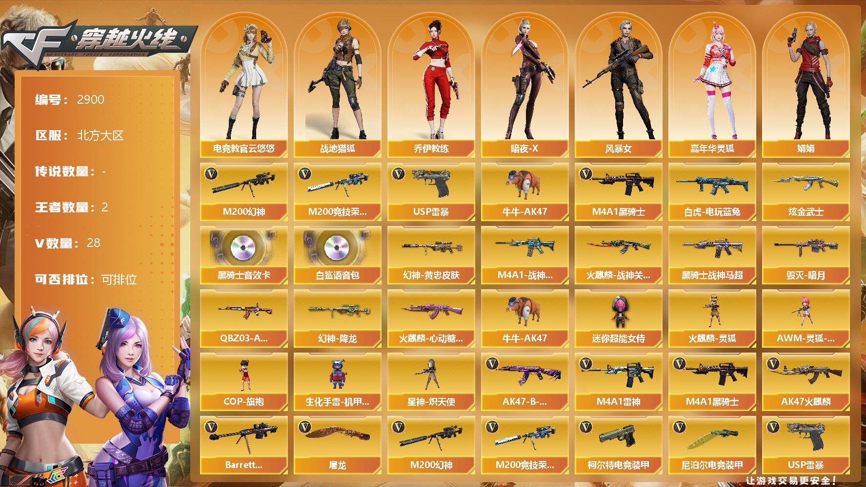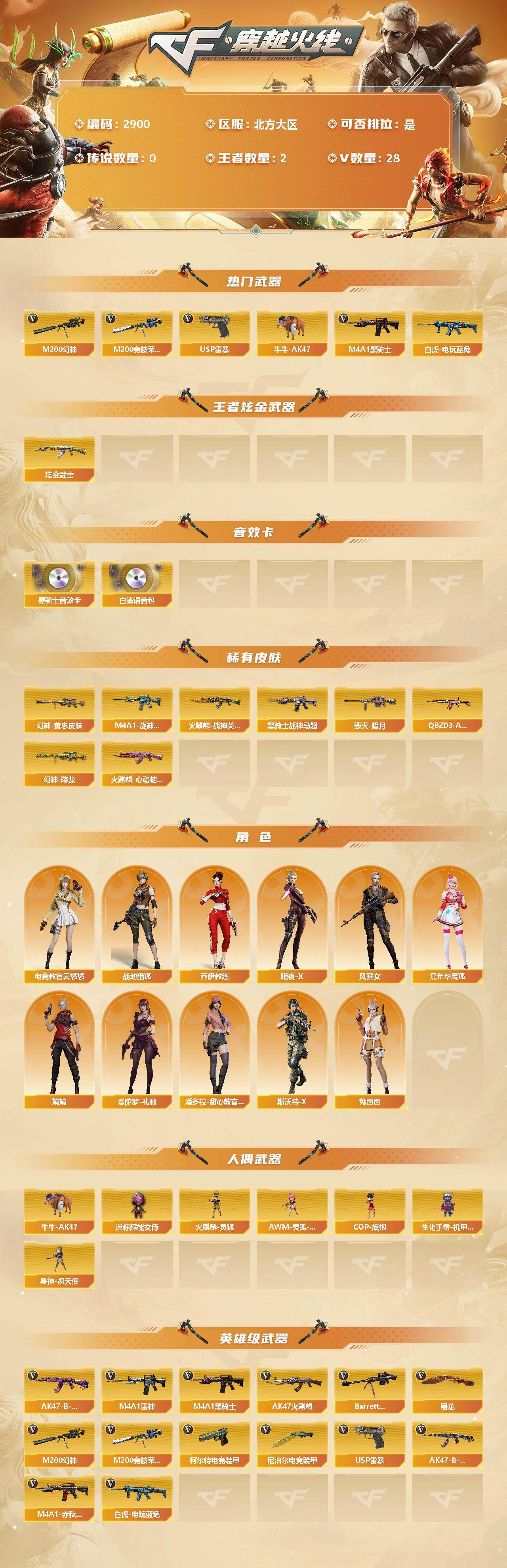 [13162161]北方大区-28V-2王者-1炫金 【热门武器】:M200-幻神,M200-竞技荣光,白虎-电玩蓝兔,牛牛-AK47,M4A1-黑骑士*2,USP-雷暴 【王者炫金武器】:炫金武士 【音效卡】:M4A1-黑骑士音效卡,白鲨语音包 【皮肤】:M200-幻神-黄忠皮肤,幻神-降龙,QBZ03-AG-CFPLS19冠军,M4A1-战神赵云,火麒麟-战神关羽,火麒麟-心动糖果,毁灭-暗月,黑骑士-战神马超,战神-流金岁月皮肤,AK47-B-常胜将军-刘备 【角色】:电竞教官-云悠悠,战地猎狐,乔伊教练,暗夜-X,风暴女,嘉年华灵狐,娟娟,曼陀罗-礼服,潘多拉-甜心教官,斯沃特-X,兔囡囡 【人偶武器】:星神-炽天使,火麒麟-灵狐,AWM-灵狐-15周年嘉年华,COP-旗袍*2,牛牛-AK47,迷你超能女侍,生化手雷-机甲核心 【英雄级武器】:AK47-火麒麟*2,M4A1-雷神,M4A1-黑骑士*2,AK47-B-战神*2,AK47-B-常胜将军,白虎-电玩蓝兔,Barrett-毁灭,M200-幻神,M200-竞技荣光,USP-雷暴,柯尔特-电竞装甲,屠龙,尼泊尔-电竞装甲,M4A1-赤狱骑士 【特殊枪械】:2黑骑士