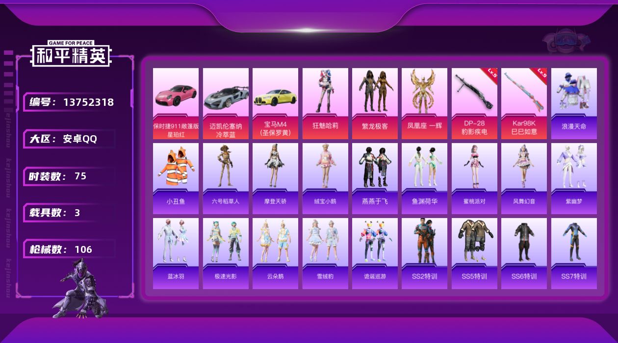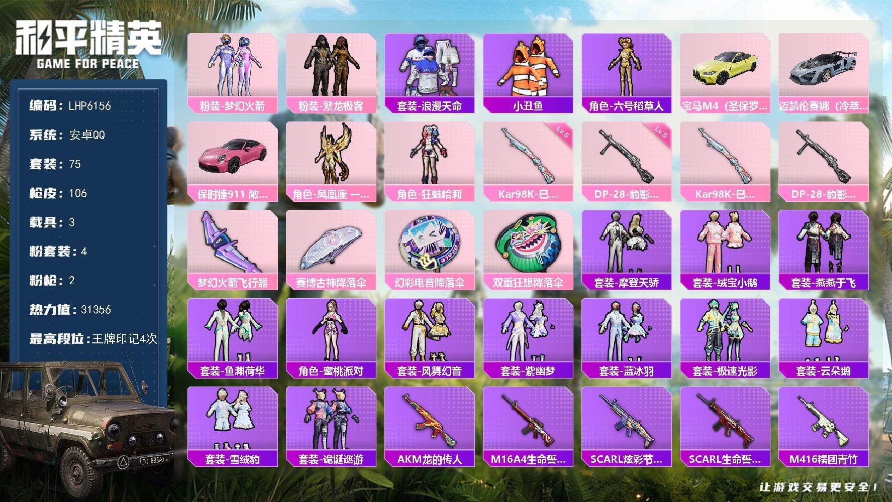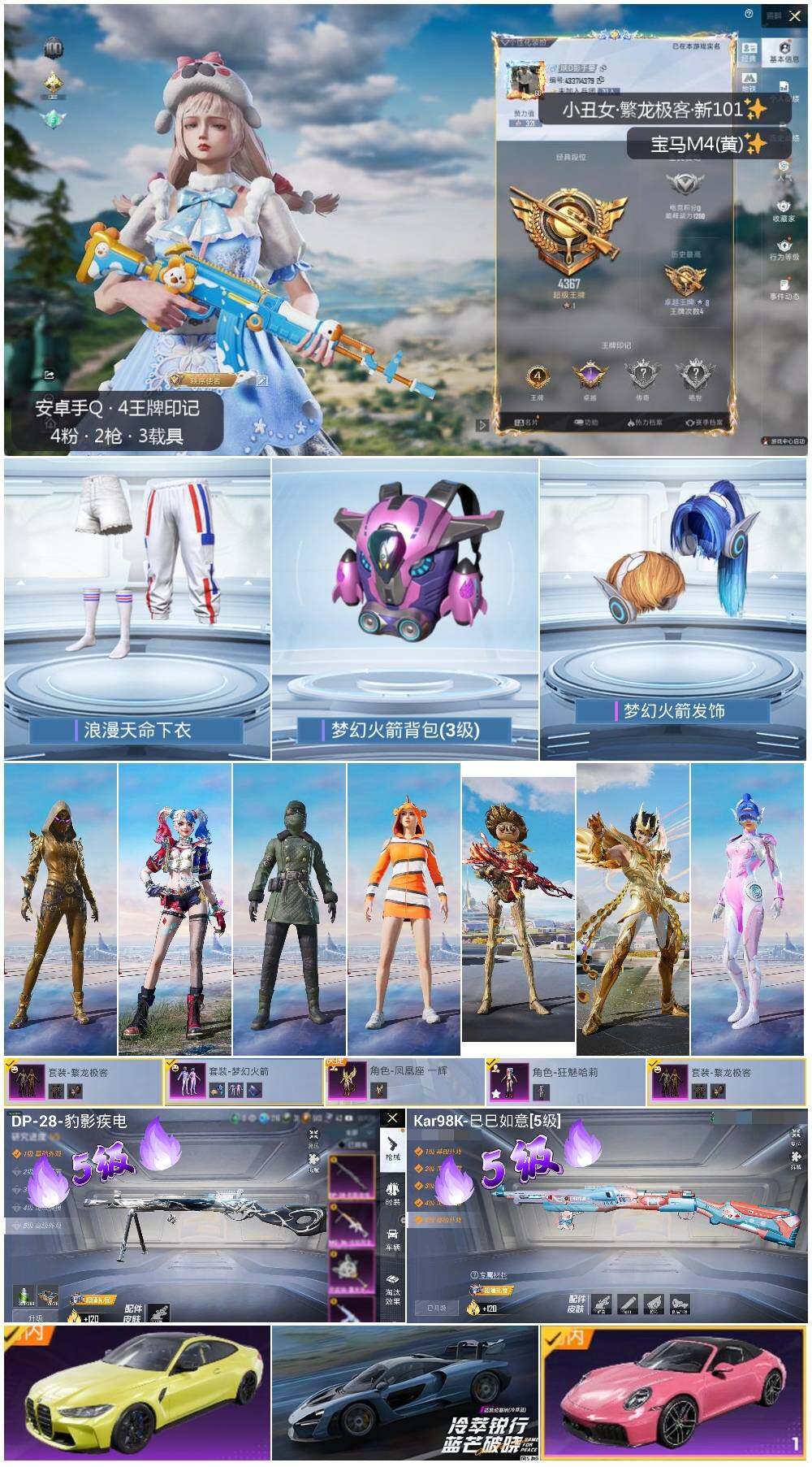 [13752318]可二次【店主推荐捡漏号!可直接换绑】/素材身法号 安卓 手Q-4粉装-2特效枪-3载具-2粉色飞行器-3.1w热力值-4王牌印记-75套装-106枪皮【热门品类】:粉装-梦幻火箭,粉装-繁龙极客,套装-浪漫天命,套装-小丑鱼,角色-六号稻草人【粉色载具】:宝马M4(圣保罗黄),迈凯伦塞纳(冷萃蓝),保时捷911 敞篷版(星珀红)【粉色套装】:粉装-梦幻火箭,粉装-繁龙极客,角色-凤凰座 一辉,角色-狂魅哈莉【粉色枪皮等级】:Kar98K-巳巳如意(五级),DP-28-豹影疾电(五级)【粉色飞行器】:梦幻火箭飞行器