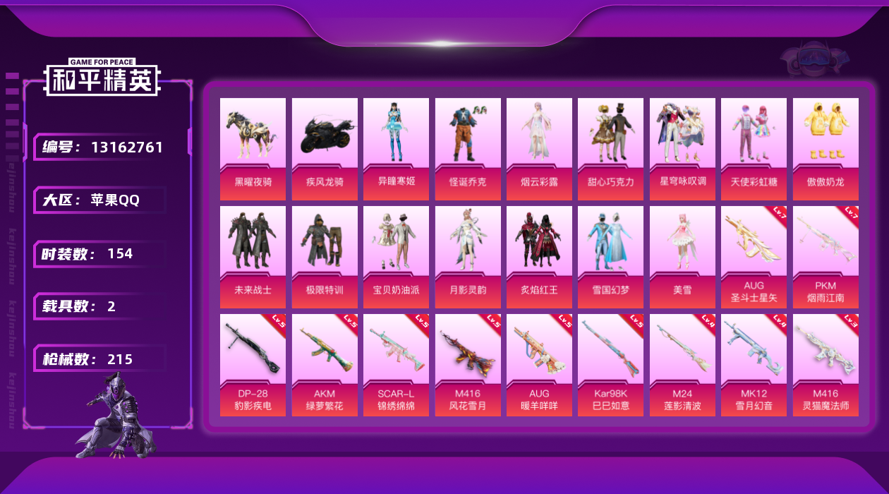 - [12041940]【特价急出/详情看图】:苹果 手Q-2粉装-3特效枪-5粉色飞行器-2w热力值-1王牌印记-34套装-68枪皮【热门品类】:粉装-繁龙极客【粉色套装】:粉装-繁龙极客,粉装-星穹咏叹调【粉色枪皮等级】:AUG-暖羊咩咩(五级),Kar98K-巳巳如意(五级),AMR-智耀战神(七级)【粉色飞行器】:齐天大圣飞行器,镜光幻境飞行翼,绝色倾城飞行器,墨金战记飞行器,百变魔方飞行器