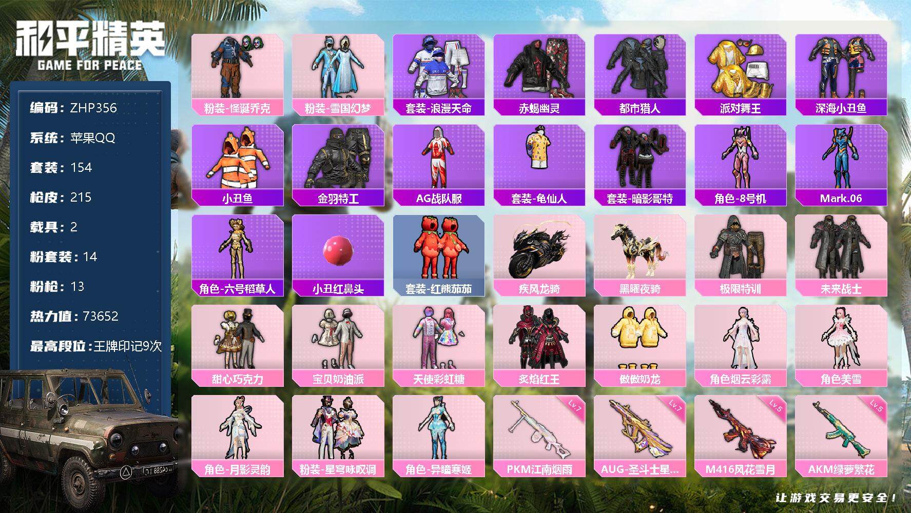 [13162761]乔克雪国男神套装!苹果 手Q-14粉装-13特效枪-2载具-5粉色飞行器-73652热力值-9王牌印记-154套装-215枪皮