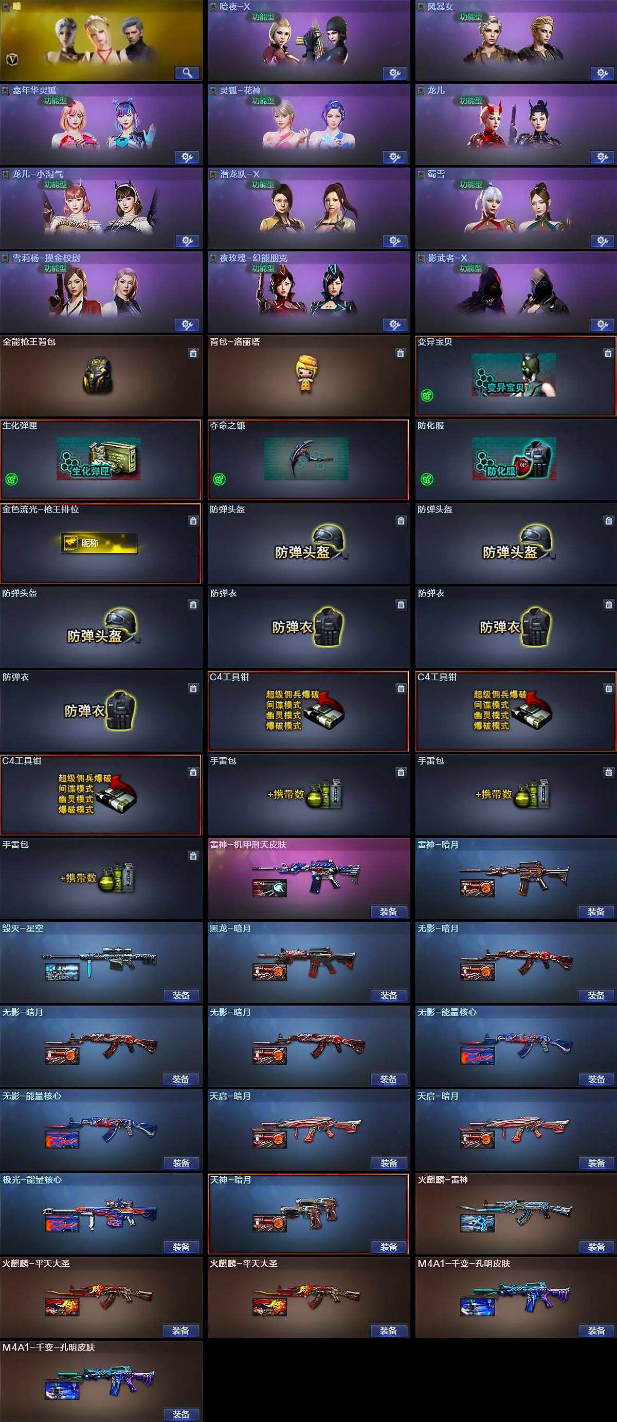 【道具】:全能枪王背包,背包-洛丽塔,变异宝贝,生化弹匣,夺命之镰,防化服,金色流光-枪王排位,防弹头盔*3,防弹衣*3,C4工具钳*3,手雷包*3