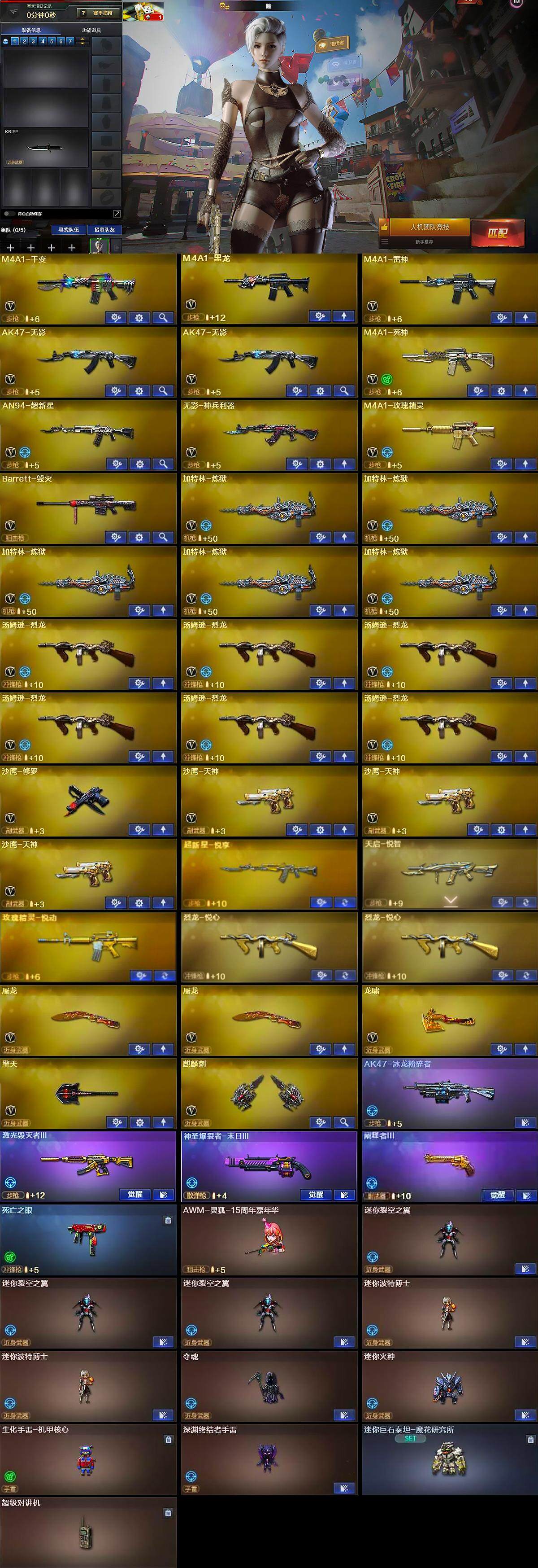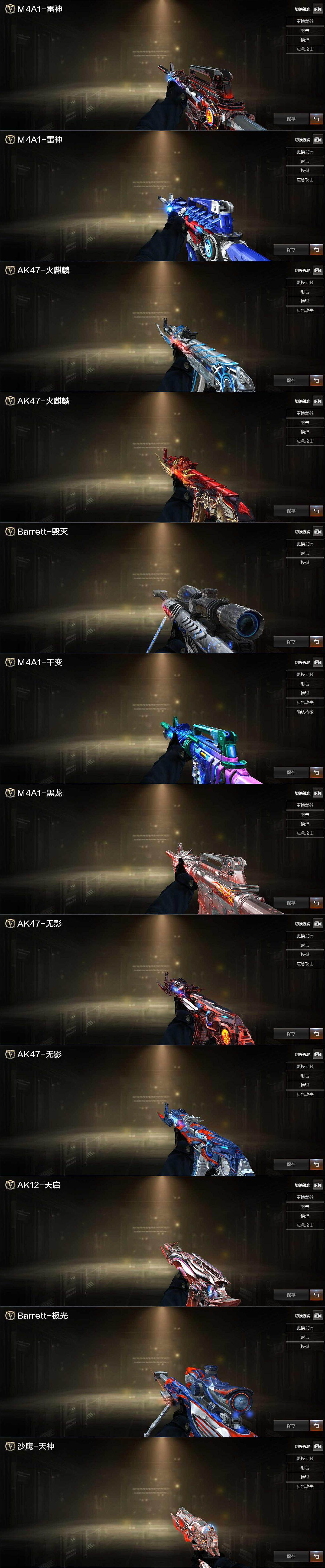 【英雄级武器】:M4A1-千变,M4A1-黑龙,M4A1-雷神,AK47-无影*2,M4A1-死神,AN94-超新星,无影-神兵利器,M4A1-玫瑰精灵,Barrett-毁灭,加特林-炼狱*5,汤姆逊-烈龙*6,沙鹰-修罗,沙鹰-天神*3,屠龙*2,龙啸,擎天,麒麟刺