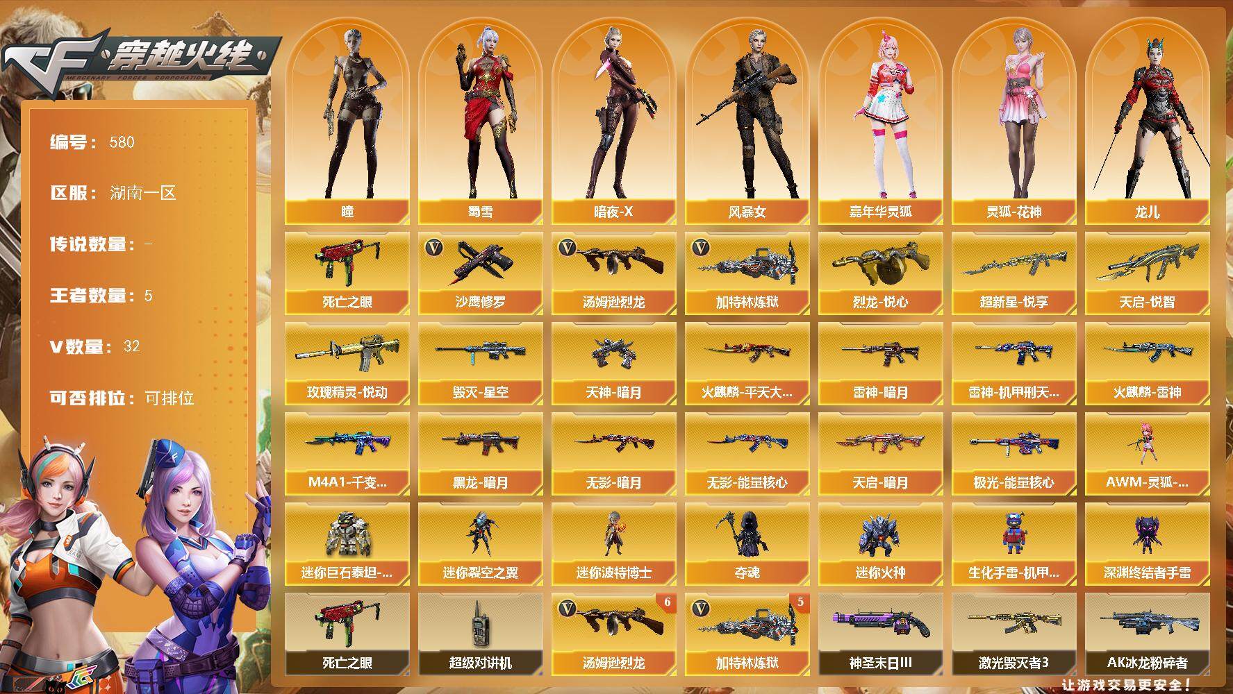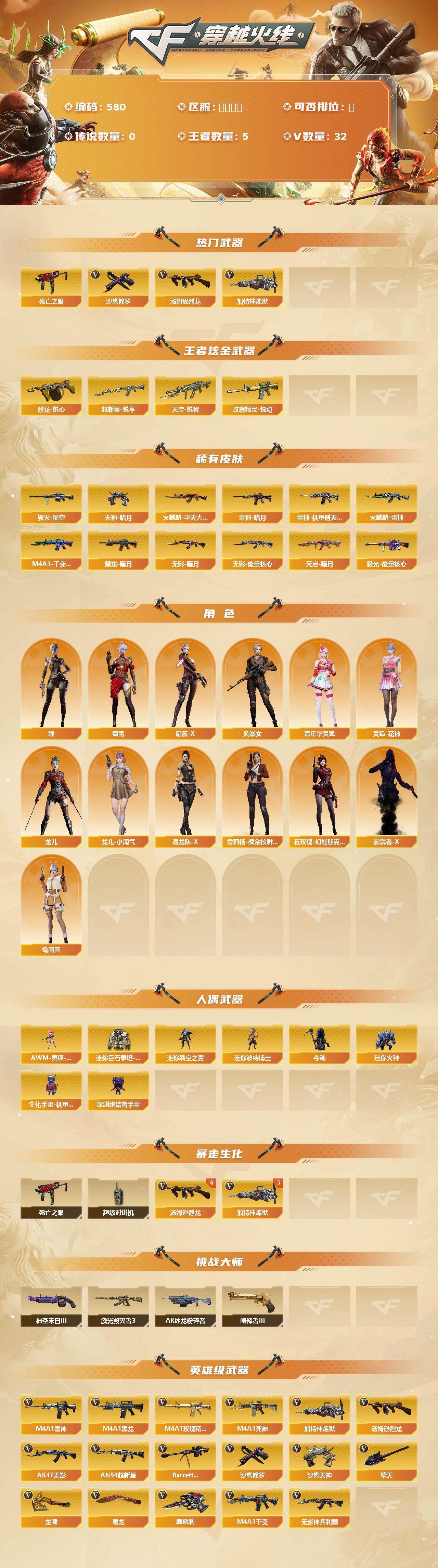 [13515827]湖南一区-32V-5王者-0炫金 【热门武器】:死亡之眼,汤姆逊-烈龙*6,加特林-炼狱*5,沙鹰-修罗 【王者炫金武器】:超新星-悦享,天启-悦智,玫瑰精灵-悦动,烈龙-悦心*2 【皮肤】:雷神-暗月,雷神-机甲刑天皮肤,火麒麟-雷神,火麒麟-平天大圣*2,毁灭-星空,M4A1-千变-孔明皮肤*2,黑龙-暗月,无影-暗月*3,无影-能量核心*2,天启-暗月*2,极光-能量核心,天神-暗月 【角色】:瞳,暗夜-X,风暴女,嘉年华灵狐,灵狐-花神,龙儿,龙儿-小淘气,潜龙队-X,蜀雪,兔囡囡,雪莉杨-摸金校尉,夜玫瑰-幻能朋克,影武者-X 【人偶武器】:AWM-灵狐-15周年嘉年华,迷你裂空之翼*3,迷你波特博士*2,夺魂,迷你火种,生化手雷-机甲核心,深渊终结者手雷,迷你巨石泰坦-魔花研究所 【暴走生化】:死亡之眼,超级对讲机 【挑战大师】:AK47-冰龙粉碎者,激光毁灭者III,神圣爆裂者-末日III,阐释者III 【英雄级武器】:M4A1-千变,M4A1-黑龙,M4A1-雷神,AK47-无影*2,M4A1-死神,AN94-超新星,无影-神兵利器,M4A1-玫瑰精灵,Barrett-毁灭,加特林-炼狱*5,汤姆逊-烈龙*6,沙鹰-修罗,沙鹰-天神*3,屠龙*2,龙啸,擎天,麒麟刺 【道具】:全能枪王背包,背包-洛丽塔,变异宝贝,生化弹匣,夺命之镰,防化服,金色流光-枪王排位,防弹头盔*3,防弹衣*3,C4工具钳*3,手雷包*3 【特殊枪械】:6烈龙,5炼狱