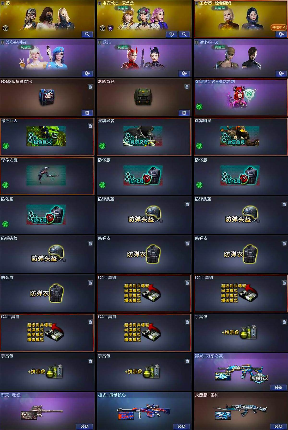 【道具】:BS战队炫彩背包,炫彩背包,女皇终结者-魔龙之吻,绿色巨人,灵魂忍者,迷雾幽灵,夺命之镰,防化服*3,防弹头盔*3,防弹衣*3,C4工具钳*4,手雷包*3