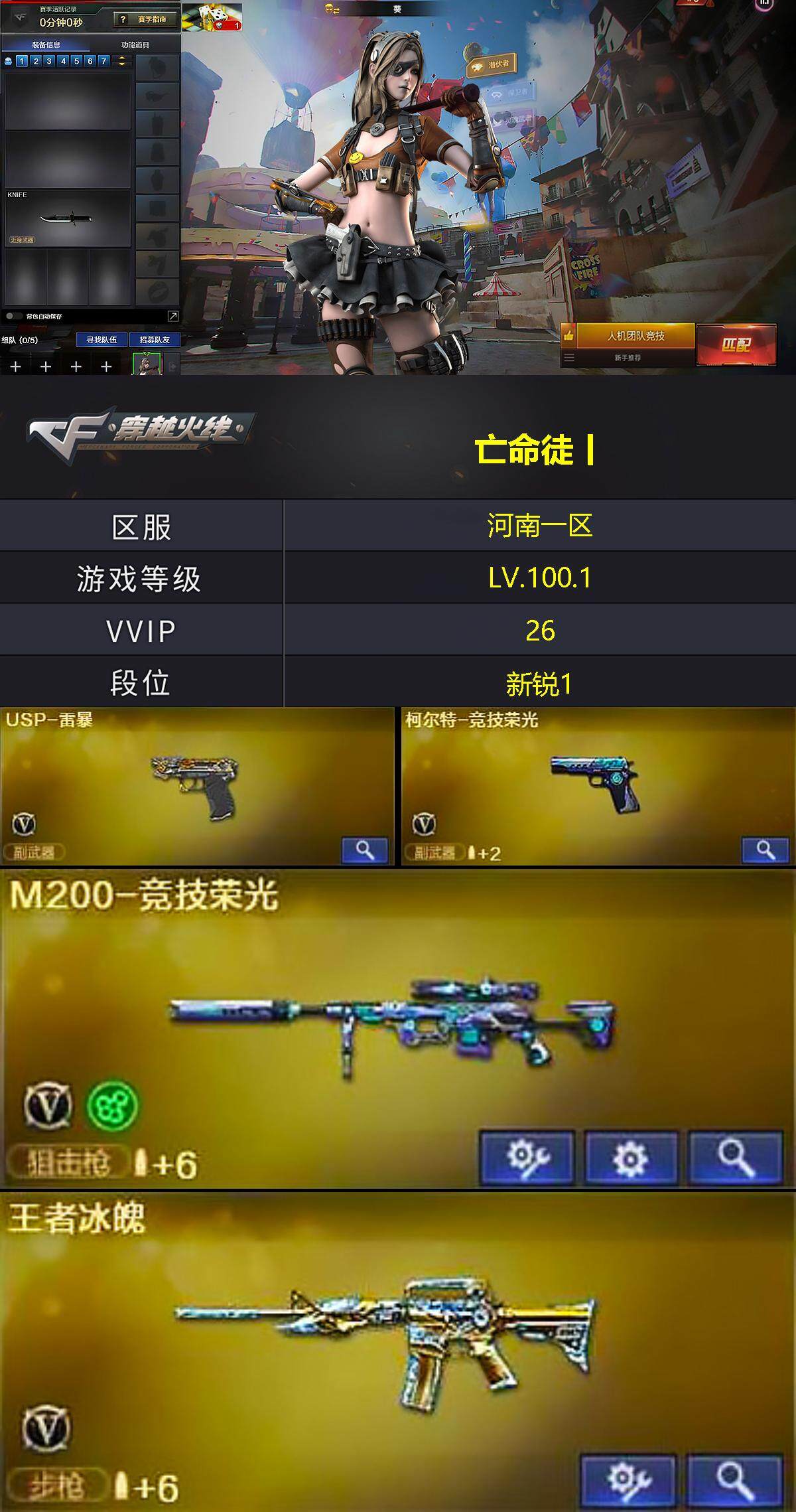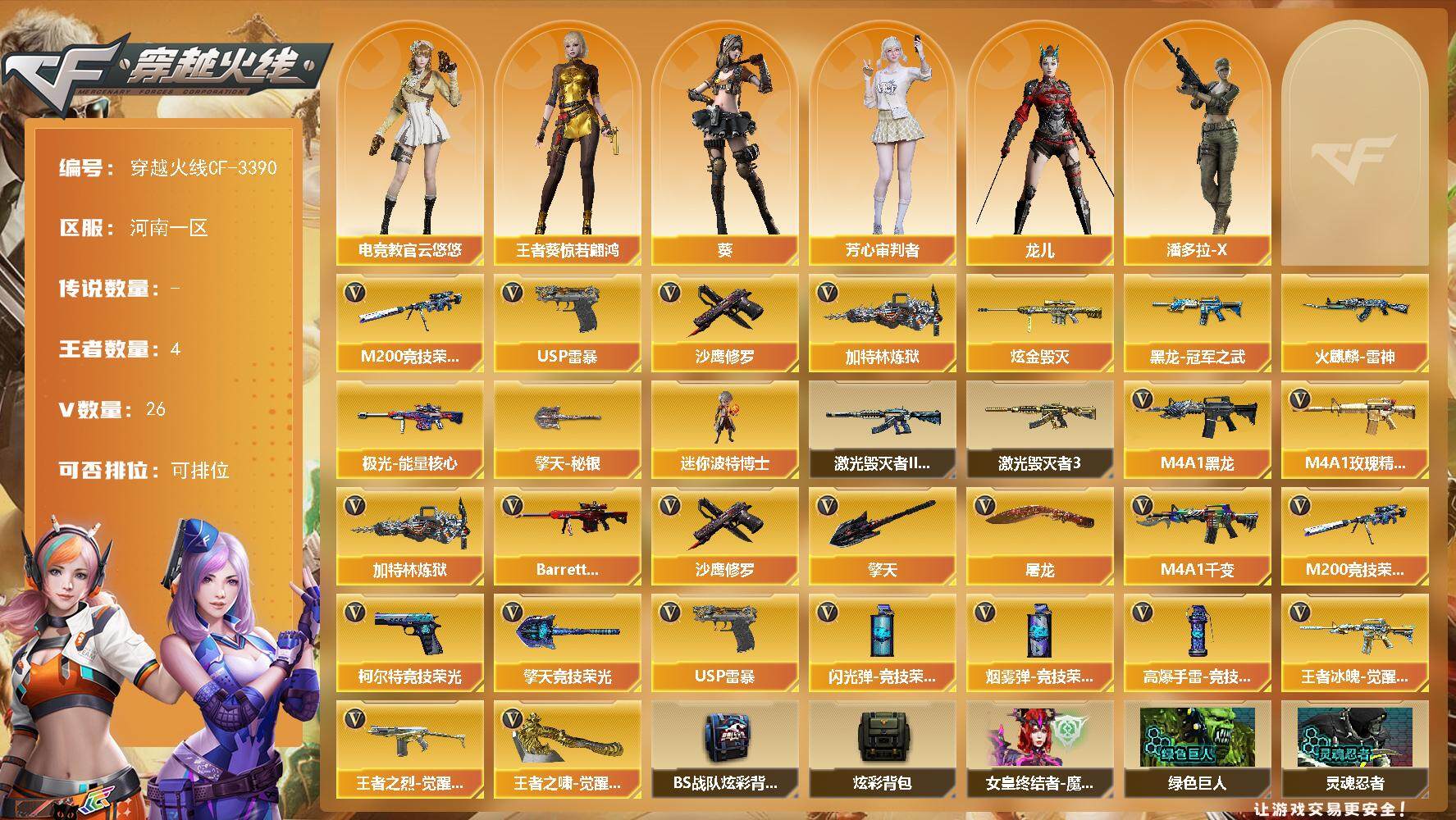 [13523937]河南一区-26V-4王者-1炫金 【热门武器】:M200-竞技荣光,加特林-炼狱,USP-雷暴,沙鹰-修罗 【王者炫金武器】:炫金毁灭 【皮肤】:火麒麟-雷神,黑龙-冠军之武,极光-能量核心,擎天-秘银 【角色】:葵,电竞教官-云悠悠,王者葵-惊若翩鸿,芳心审判者,龙儿,潘多拉-X 【人偶武器】:迷你波特博士*2 【挑战大师】:激光毁灭者III-白马银枪,激光毁灭者III 【英雄级武器】:M4A1-千变,M4A1-黑龙,M4A1-玫瑰精灵,王者冰魄-觉醒版,王者之烈-觉醒版,Barrett-极光,M200-竞技荣光,加特林-炼狱,沙鹰-修罗,USP-雷暴,柯尔特-竞技荣光,屠龙,擎天,擎天-竞技荣光*3,王者之啸-觉醒版,高爆手雷-竞技荣光*3,闪光弹-竞技荣光*3,烟雾弹-竞技荣光*3 【道具】:BS战队炫彩背包,炫彩背包,女皇终结者-魔龙之吻,绿色巨人,灵魂忍者,迷雾幽灵,夺命之镰,防化服*3,防弹头盔*3,防弹衣*3,C4工具钳*4,手雷包*3 【特殊枪械】:1炼狱