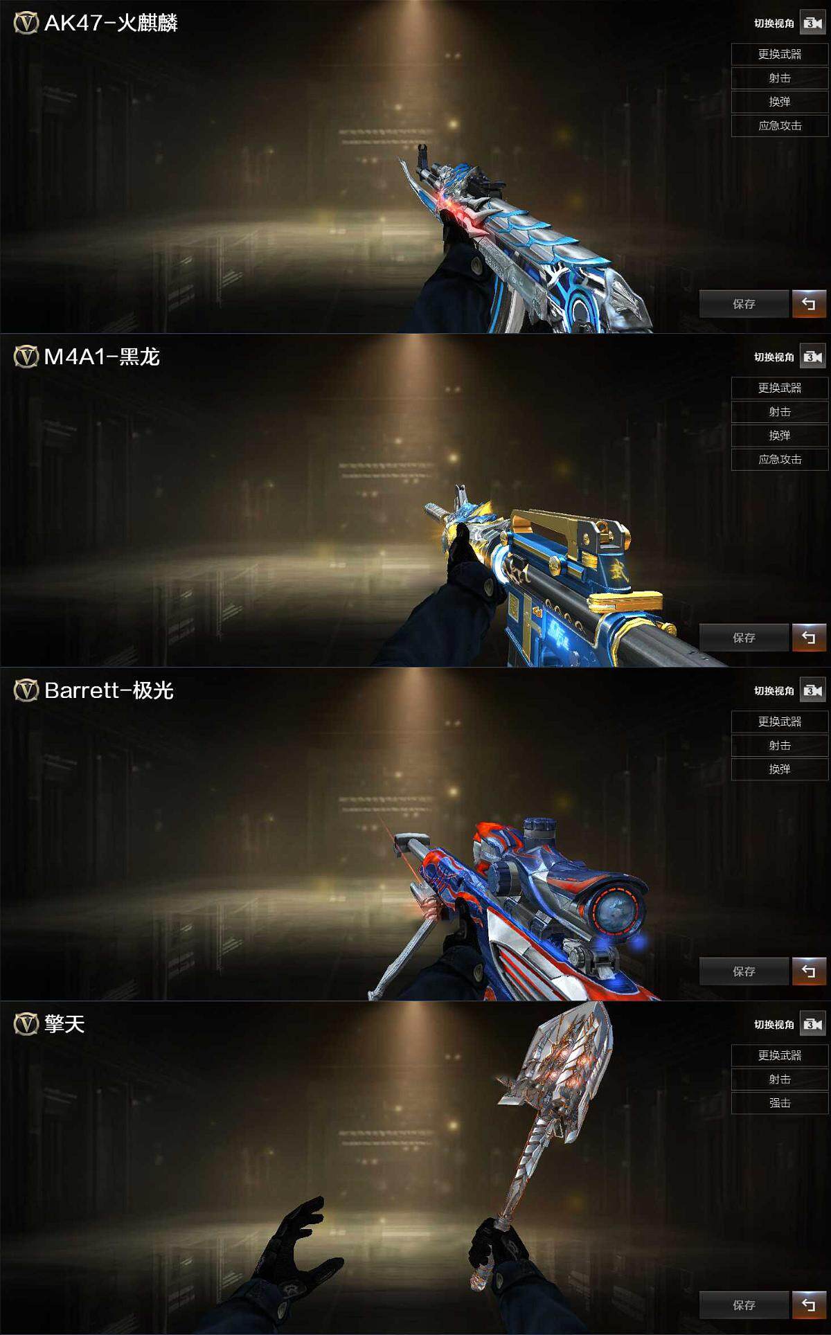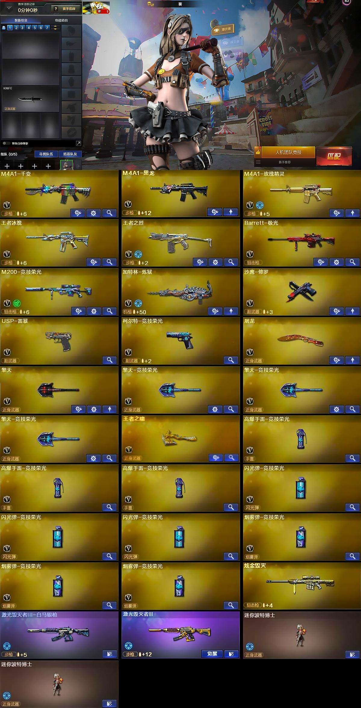 【英雄级武器】:M4A1-千变,M4A1-黑龙,M4A1-玫瑰精灵,王者冰魄-觉醒版,王者之烈-觉醒版,Barrett-极光,M200-竞技荣光,加特林-炼狱,沙鹰-修罗,USP-雷暴,柯尔特-竞技荣光,屠龙,擎天,擎天-竞技荣光*3,王者之啸-觉醒版,高爆手雷-竞技荣光*3,闪光弹-竞技荣光*3,烟雾弹-竞技荣光*3