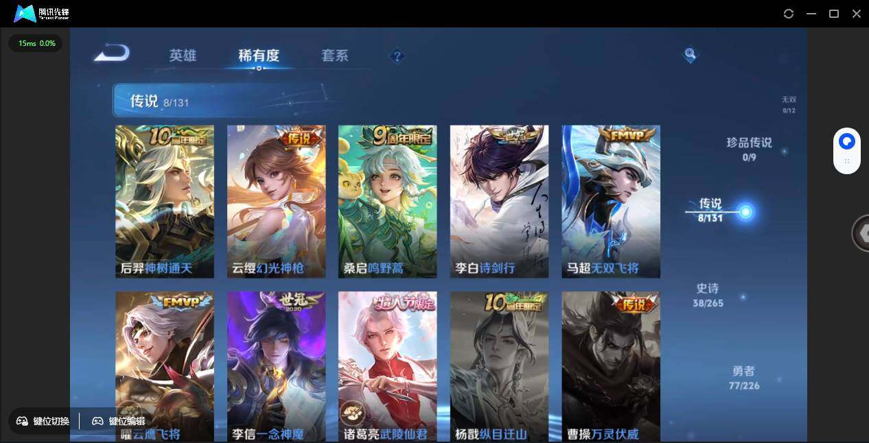 【传说皮肤】:后羿神树通天,云缨幻光神枪,桑启鸣野蒿,李白诗剑行,马超无双飞将,曜云鹰飞将,李信一念神魔,诸葛亮武陵仙君