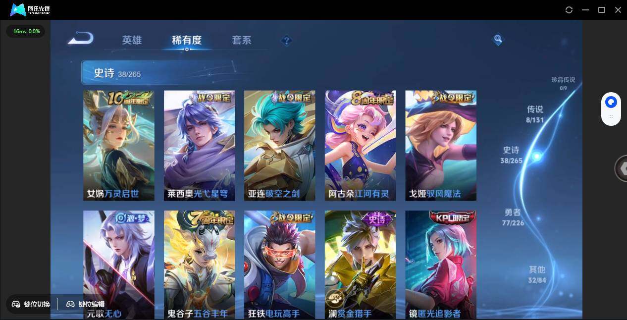 【史诗皮肤】:赵云皇家上将,赵云未来纪元,甄姬冰雪圆舞曲,狄仁杰魔术师,宫本武藏鬼剑武藏,孙尚香蔷薇恋人,孙尚香水果甜心,嬴政摇滚巨星,妲己魅力维加斯,墨子金属风暴,曹操幽灵船长,吕布末日机甲,张飞乱世虎臣,花木兰水晶猎龙者,兰陵王暗隐猎兽者,雅典娜冰冠公主,百里守约特工魅影,铠曙光守护者,刘禅天才门将,李元芳逐浪之夏,白起星夜王子,孙策猫狗日记,狄仁杰鹰眼统帅,不知火舞魅语,橘右京修罗,百里玄策原初追逐者,裴擒虎李小龙,司马懿暗渊魔法,镜匿光追影者,澜赏金猎手,狂铁电玩高手,鬼谷子五谷丰年,元歌无心,戈娅驭风魔法,阿古朵江河有灵,亚连破空之剑,莱西奥光弋星穹,女娲万灵启世