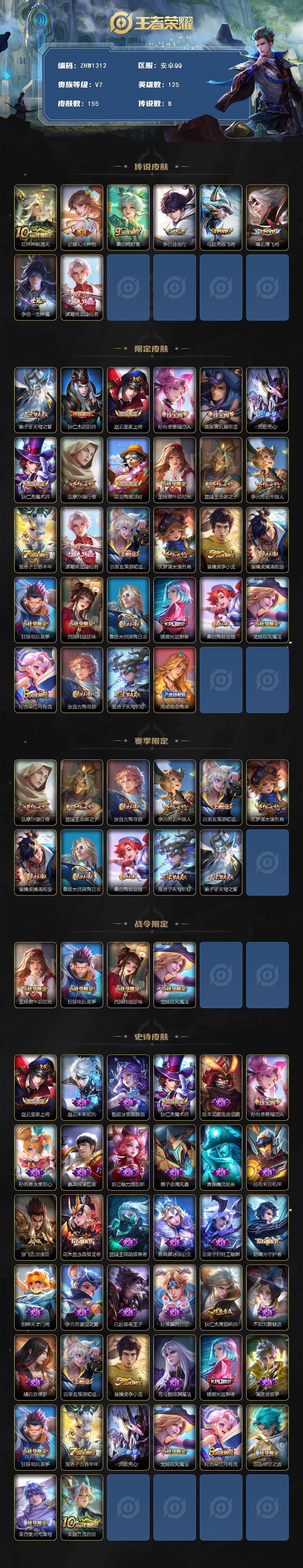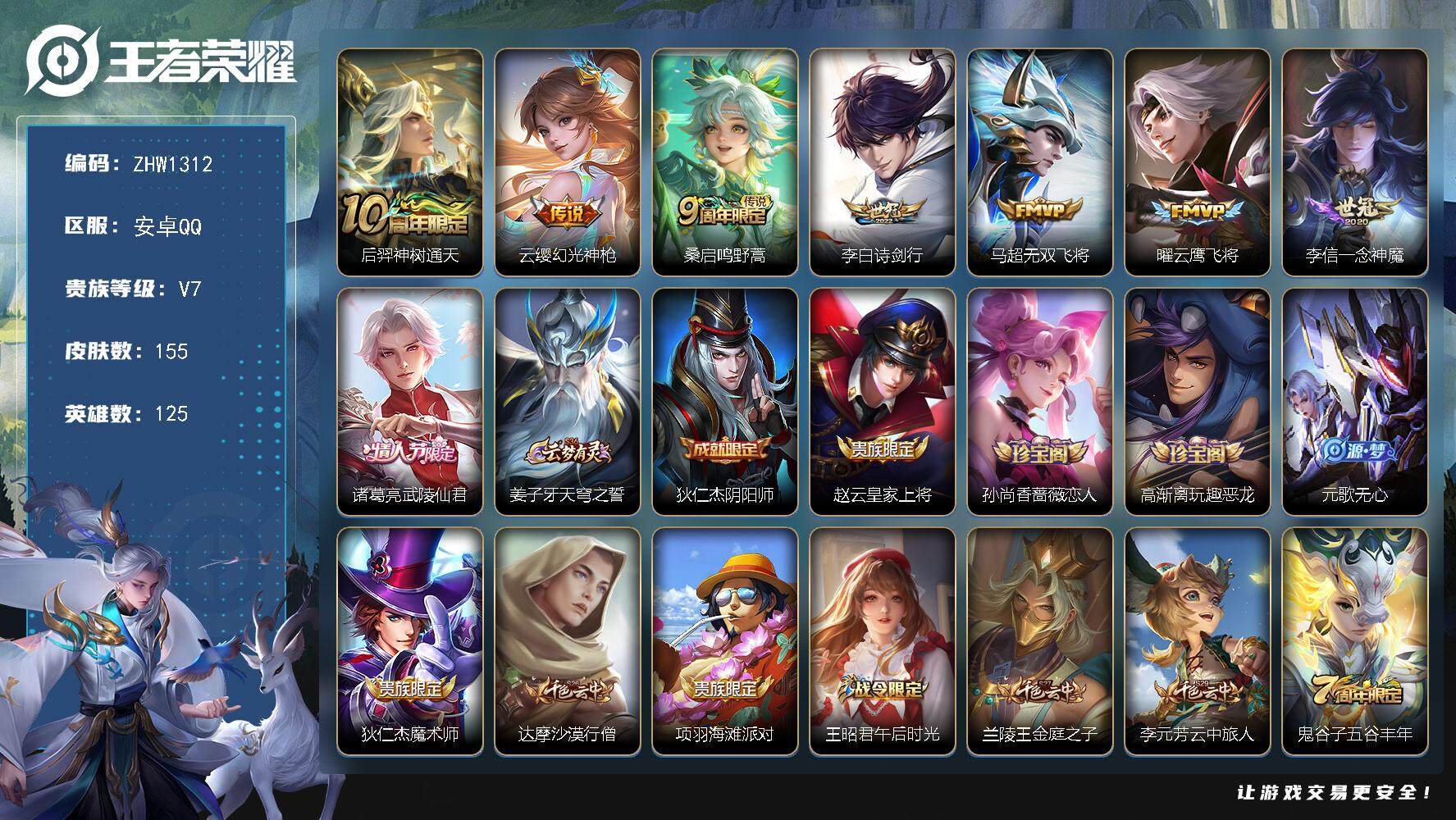 [13843966]可二次【店主推荐捡漏号!可直接换绑】安卓Q-V7-最强王者段位-125英雄-155皮肤-8传说-38史诗 【传说皮肤】:后羿神树通天,云缨幻光神枪,桑启鸣野蒿,李白诗剑行,马超无双飞将,曜云鹰飞将,李信一念神魔,诸葛亮武陵仙君 【限定皮肤】:姜子牙天穹之誓,狄仁杰阴阳师,赵云皇家上将,孙尚香蔷薇恋人,高渐离玩趣恶龙,元歌无心,狄仁杰魔术师,达摩沙漠行僧,项羽海滩派对,王昭君午后时光,兰陵王金庭之子,李元芳云中旅人,鬼谷子五谷丰年,诸葛亮武陵仙君,百里玄策原初追逐者,沈梦溪大漠名商,裴擒虎李小龙,裴擒虎擒涛扼浪,狂铁电玩高手,西施玲珑珍味,鲁班大师探海日志,镜匿光追影者,桑启海盐诗旅,戈娅驭风魔法,阿古朵江河有灵,张良古海寻踪,鬼谷子天穹祈灯,周瑜熔金海岸 【赛季限定】:达摩沙漠行僧,兰陵王金庭之子,张良古海寻踪,李元芳云中旅人,百里玄策原初追逐者,沈梦溪大漠名商,裴擒虎擒涛扼浪,鲁班大师探海日志,桑启海盐诗旅,鬼谷子天穹祈灯,姜子牙天穹之誓 【战令限定】:王昭君午后时光,狂铁电玩高手,西施玲珑珍味,戈娅驭风魔法 【史诗皮肤】:赵云皇家上将,赵云未来纪元,甄姬冰雪圆舞曲,狄仁杰魔术师,宫本武藏鬼剑武藏,孙尚香蔷薇恋人,孙尚香水果甜心,嬴政摇滚巨星,妲己魅力维加斯,墨子金属风暴,曹操幽灵船长,吕布末日机甲,张飞乱世虎臣,花木兰水晶猎龙者,兰陵王暗隐猎兽者,雅典娜冰冠公主,百里守约特工魅影,铠曙光守护者,刘禅天才门将,李元芳逐浪之夏,白起星夜王子,孙策猫狗日记,狄仁杰鹰眼统帅,不知火舞魅语,橘右京修罗,百里玄策原初追逐者,裴擒虎李小龙,司马懿暗渊魔法,镜匿光追影者,澜赏金猎手,狂铁电玩高手,鬼谷子五谷丰年,元歌无心,戈娅驭风魔法,阿古朵江河有灵,亚连破空之剑,莱西奥光弋星穹,女娲万灵启世 【其他皮肤】:项羽海滩派对,韩信教廷特使,韩信街头霸王,赵云白执事,赵云忍炎影,芈月红桃皇后,牛魔西部大镖客,武则天东方不败,扁鹊化身博士,扁鹊救世之瞳,宫本武藏未来纪元,安琪拉玩偶对对碰,孙膑天使之翼,典韦黄金武士,亚瑟死亡骑士,花木兰兔女郎,张飞五福同心,甄姬花好人间,宫本武藏万象初新,后羿阿尔法小队,狄仁杰阴阳师,刘备纽约教父,刘备汉昭烈帝,关羽龙腾万里,墨子进击墨子号,狂铁命运角斗场,老夫子功夫老勺,孙尚香沉稳之力,李白敏锐之力,苏烈坚韧之力,明世隐虹云星官,小乔丁香结,吕布野