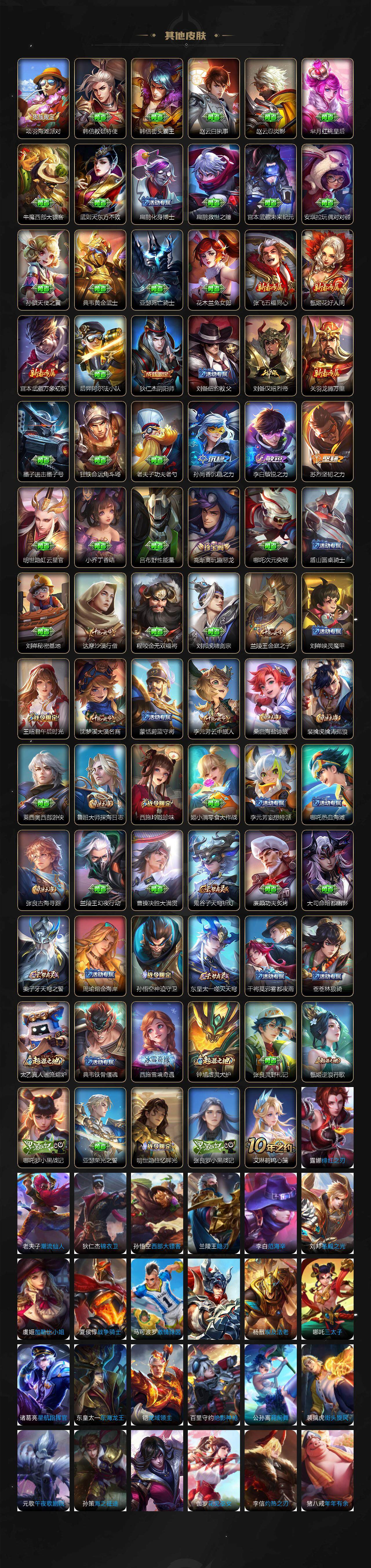 【限定皮肤】:姜子牙天穹之誓,狄仁杰阴阳师,赵云皇家上将,孙尚香蔷薇恋人,高渐离玩趣恶龙,元歌无心,狄仁杰魔术师,达摩沙漠行僧,项羽海滩派对,王昭君午后时光,兰陵王金庭之子,李元芳云中旅人,鬼谷子五谷丰年,诸葛亮武陵仙君,百里玄策原初追逐者,沈梦溪大漠名商,裴擒虎李小龙,裴擒虎擒涛扼浪,狂铁电玩高手,西施玲珑珍味,鲁班大师探海日志,镜匿光追影者,桑启海盐诗旅,戈娅驭风魔法,阿古朵江河有灵,张良古海寻踪,鬼谷子天穹祈灯,周瑜熔金海岸