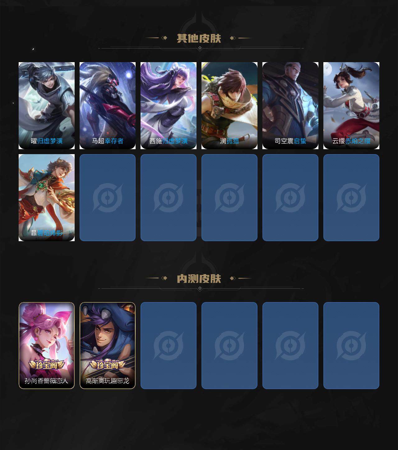 【赛季限定】:达摩沙漠行僧,兰陵王金庭之子,张良古海寻踪,李元芳云中旅人,百里玄策原初追逐者,沈梦溪大漠名商,裴擒虎擒涛扼浪,鲁班大师探海日志,桑启海盐诗旅,鬼谷子天穹祈灯,姜子牙天穹之誓
