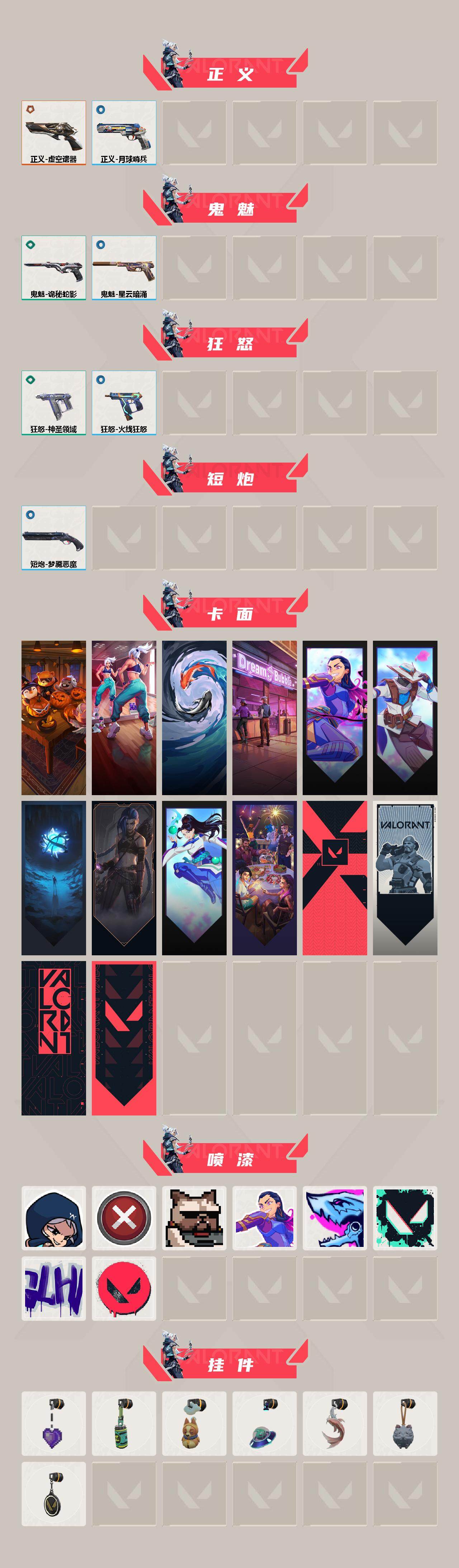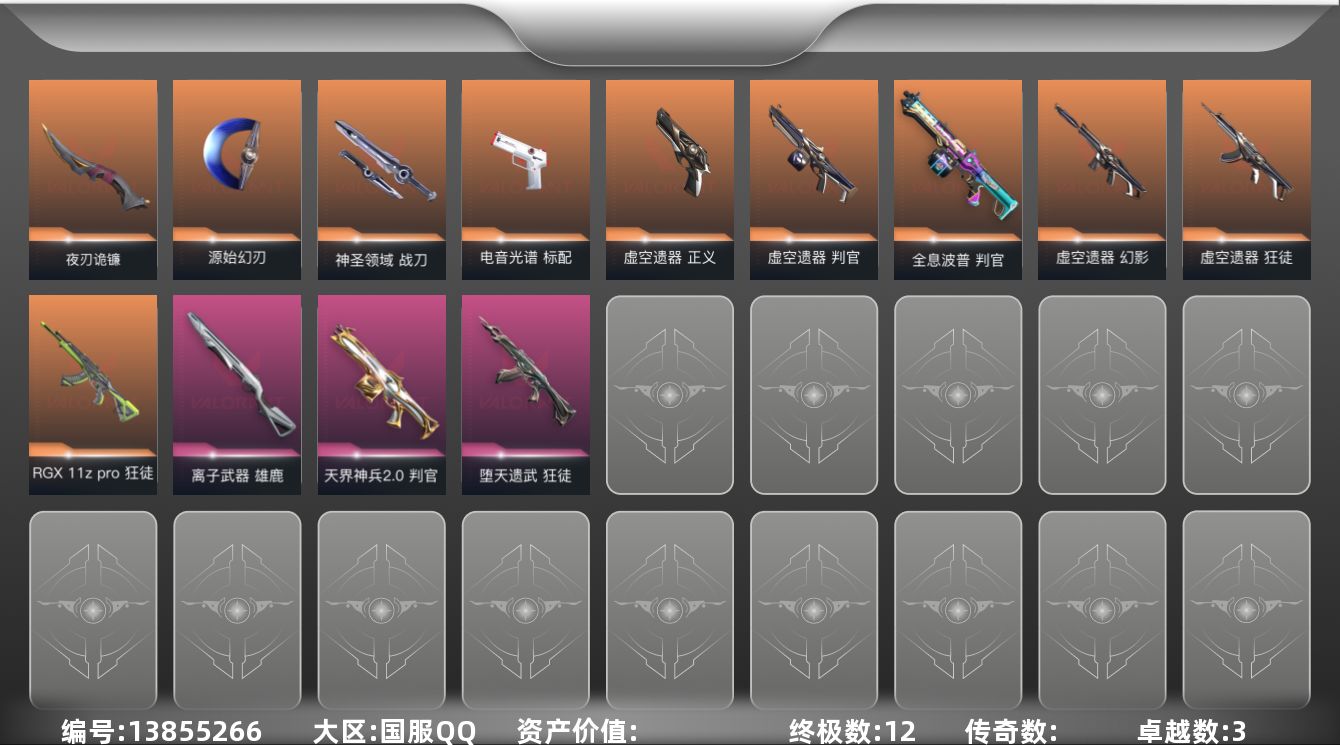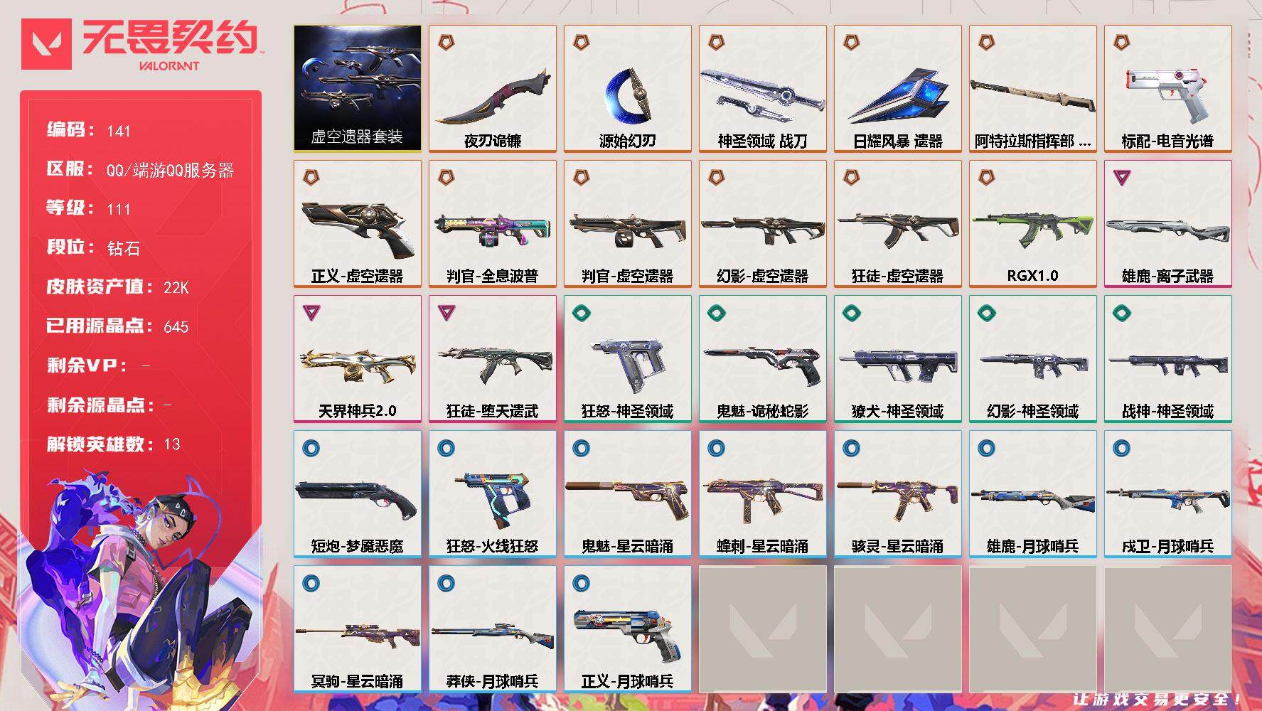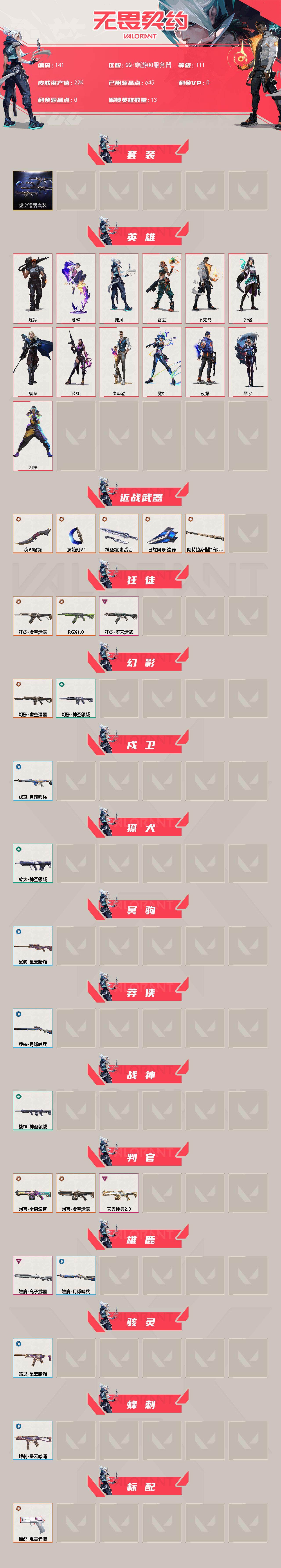 [13855266]【套装】:虚空遗器套装 【英雄】:幻棱,炼狱,暮蝶,捷风,雷兹,不死鸟,贤者,猎枭,芮娜,尚勃勒,霓虹,夜露,黑梦 【近战 武器】:近战武器-源始幻刃,近战武器-夜刃诡镰,近战武器-神圣领域 战刀,近战武器-日耀风暴 遗器,近战武器-阿特拉斯指挥部 甩棍 【狂徒】:狂徒-虚空遗器,狂徒-RGX 11z Pro,狂徒-堕天遗武 【幻影】:幻影-虚空遗器,幻影-神圣领域 【戍卫】:戍卫-月球哨兵 【獠犬】:獠犬-神圣领域 【冥驹】:冥驹-星云暗涌 【莽侠】:莽侠-月球哨兵 【战神】:战神-神圣领域 【判官】:判官-全息波普,判官-虚空遗器,判官-天界神兵//2.0 【雄鹿】:雄鹿-离子武器,雄鹿-月球哨兵 【骇灵】:骇灵-星云暗涌 【蜂刺】:蜂刺-星云暗涌 【标配】:标配-电音光谱,标配-电音光谱 【正义】:正义-虚空遗器,正义-月球哨兵 【鬼魅】:鬼魅-诡秘蛇影,鬼魅-星云暗涌 【狂怒】:狂怒-神圣领域,狂怒-火线狂怒 【短炮】:短炮-梦魇恶魔 【卡面】:南瓜盛典 卡面,热舞环节 卡面,红鳞松叶 卡面,梦幻奶茶 卡面,无畏契约GO!第一卷:芮娜 卡面,无畏契约GO!第一卷:零 卡面,无垠星环 卡面,《双城之战》金克丝 卡面,无畏契约GO!第一卷:贤者 卡面,天台狂欢 卡面,代号红色 卡面,新兵报到 卡面,V契约 卡面,无畏契约 卡面,暗潮 卡面 【喷漆】:捷风差距 喷漆,买装还是存钱 喷漆,关门放狗 喷漆,无畏契约GO!第一卷:芮娜 喷漆,暴走萝莉 喷漆,胜利属于无畏契约 喷漆,GLHF 喷漆,无畏契约 喷漆 【挂饰】:薰衣草之心 挂饰,Z世代特饮 挂饰,犯困的布鲁诺 挂饰,天外飞客 挂饰,红鳞松叶 挂饰,《双城之战》魄罗 挂饰,无畏契约 纪念币 挂饰