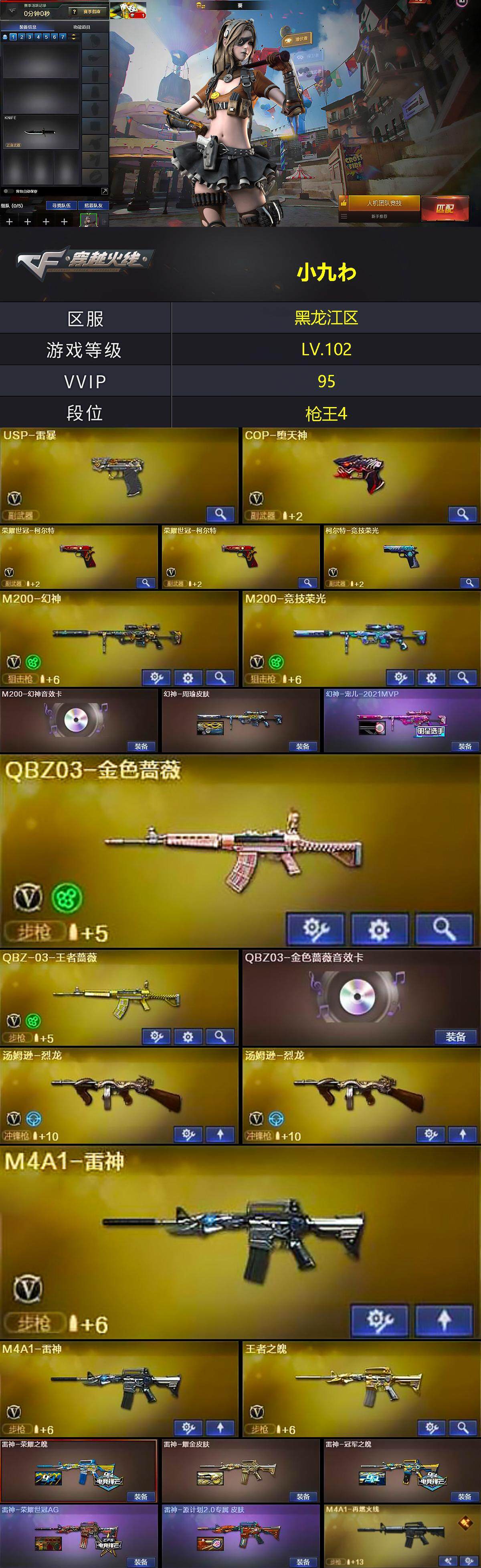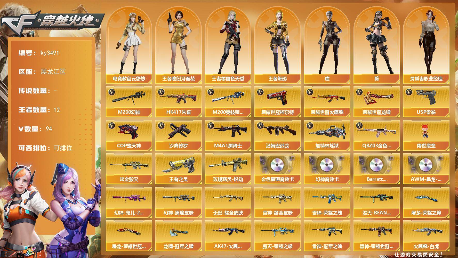 [13787048]黑龙江区-94V-12王者-1炫金 【热门武器】:QBZ03-金色蔷薇,HK417-朱雀,M200-幻神,M200-竞技荣光,荣耀世冠-火麒麟,荣耀世冠-柯尔特*2,M4A1-黑骑士*2,汤姆逊-烈龙*2,加特林-炼狱,降世魔童,USP-雷暴,COP-堕天神,沙鹰-修罗*4,荣耀世冠-龙啸 【王者炫金武器】:玫瑰精灵-悦动,王者之灵,炫金毁灭 【音效卡】:M200-幻神音效卡,QBZ03-金色蔷薇音效卡,Barrett-碧霄极光音效卡,AWM-昌龙-怀旧音效卡*2 【皮肤】:幻神-周瑜皮肤,幻神-宠儿-2021MVP,雷神-荣耀之魄,雷神-耀金皮肤,雷神-冠军之魄,雷神-荣耀世冠AG,雷神-源计划2.0专属 皮肤,M4A1-再燃火线,AK47-火麒麟-传奇EVEN,火麒麟-平天大圣,火麒麟-白虎,毁灭-荣耀之怒,毁灭-BEAN-2020MVP,黑龙-能量核心,黑骑士-暗月,无影耀金皮肤,死神-秘银*3,战神-粉色甜心皮肤*3,战神-紫绶金章皮肤*5,战神-流金岁月皮肤*6,AK47-B-常胜将军-曹操*2,AK47-B-常胜将军-刘备*2,天龙-秘银,AWM-天龙-传奇70KG,极光-能量核心,屠龙-荣耀之锋,屠龙-荣耀世冠AG,龙啸-冠军之啸,轻型军用手斧-再燃火线 【角色】:葵,瞳,电竞教官-云悠悠,战地猎狐,王者-瞳-闭月羞花,王者-零-国色天香,王者-魅影,乔伊教练,修道士,暗夜-X,初恋灵狐,风暴女*2,娟娟,兰-新年限定,灵狐者-X,灵狐者-职业经理,龙儿,曼陀罗-X,潜龙队-X,邱刚敖,青霞仙子,蜀雪,铁骑荣耀,雪莉杨 【人偶武器】:巴雷特-零-水下丽影,COP-旗袍,迷你深渊冰龙,迷你裂空之翼,迷你牛魔王,夺魂*2,迷你牛牛*2,深渊终结者手雷,闪光弹-小乔,闪光弹-貂蝉,高爆手雷-大乔,迷你艾比,迷你巨石泰坦-魔花研究所,灵狐娃娃手雷,降世魔童 【暴走生化】:超级对讲机 【英雄级武器】:AK47-火麒麟,M4A1-黑龙,M4A1-雷神*2,M4A1-黑骑士*2,AK47-无影,AK12-天启,AN94-超新星,AK47-黑鲨,HK417-朱雀,M4A1-玫瑰精灵,QBZ03-金色蔷薇,王者之心-觉醒版,王者之魄-觉醒版,王者之幻-觉醒版,AK-47-猩红传说*8,AK47-B-战神*2,黑骑士-海王,AK47-B-常胜将军,QBZ-03-王者蔷薇